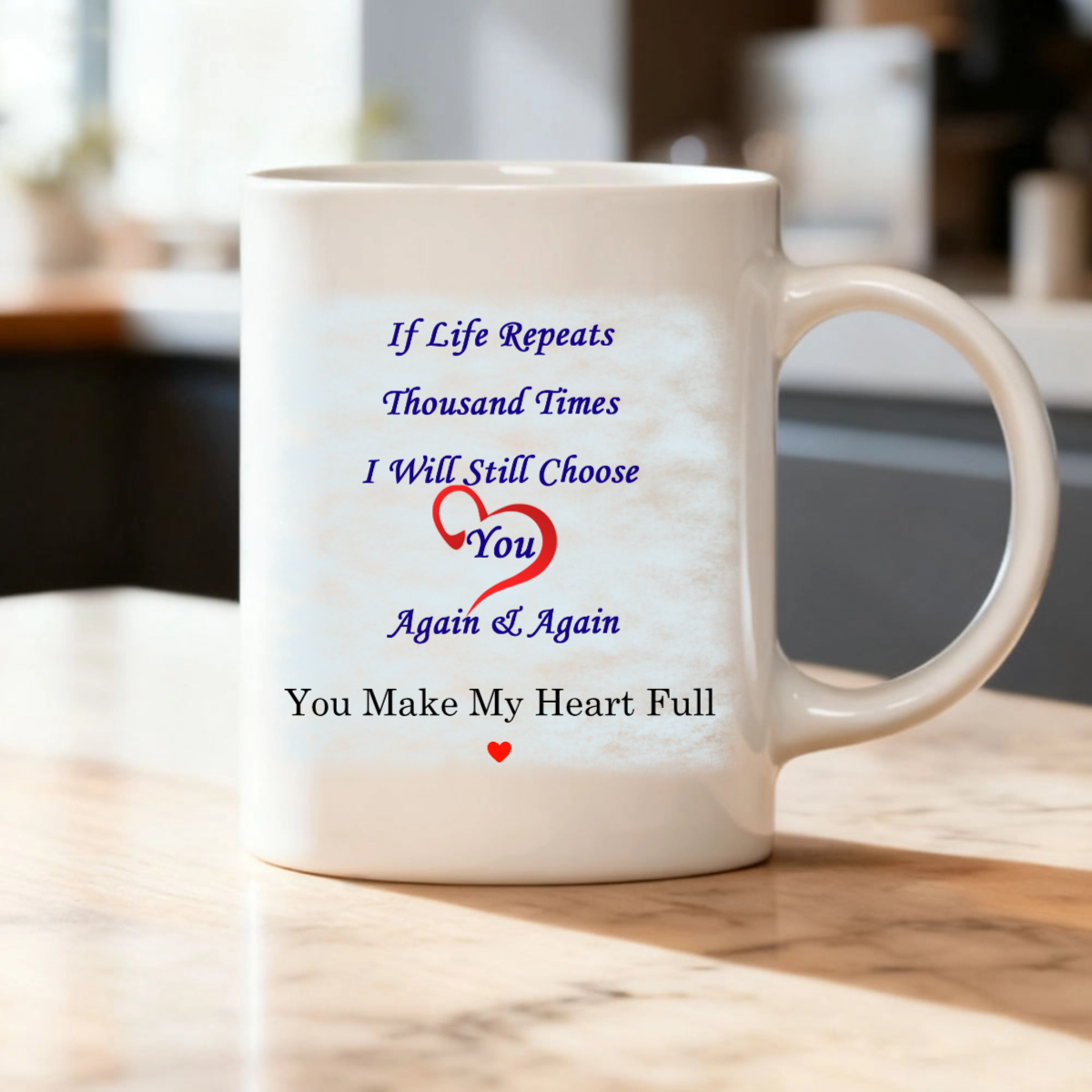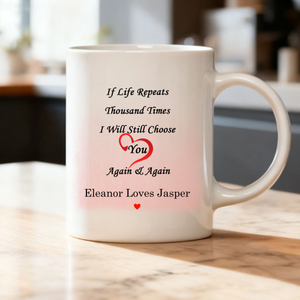 Design a unique expression of love with our customizable romantic mug. Featuring the heartfelt quote âIf Life Repeats Thousand Times I Will Still Choose You Again & Againâ, this 350ml ceramic mug can be tailored with your preferred font colors, background, and personalized text. Whether itâs for a morning coffee or an evening tea, itâs a daily reminder of your special bond.
