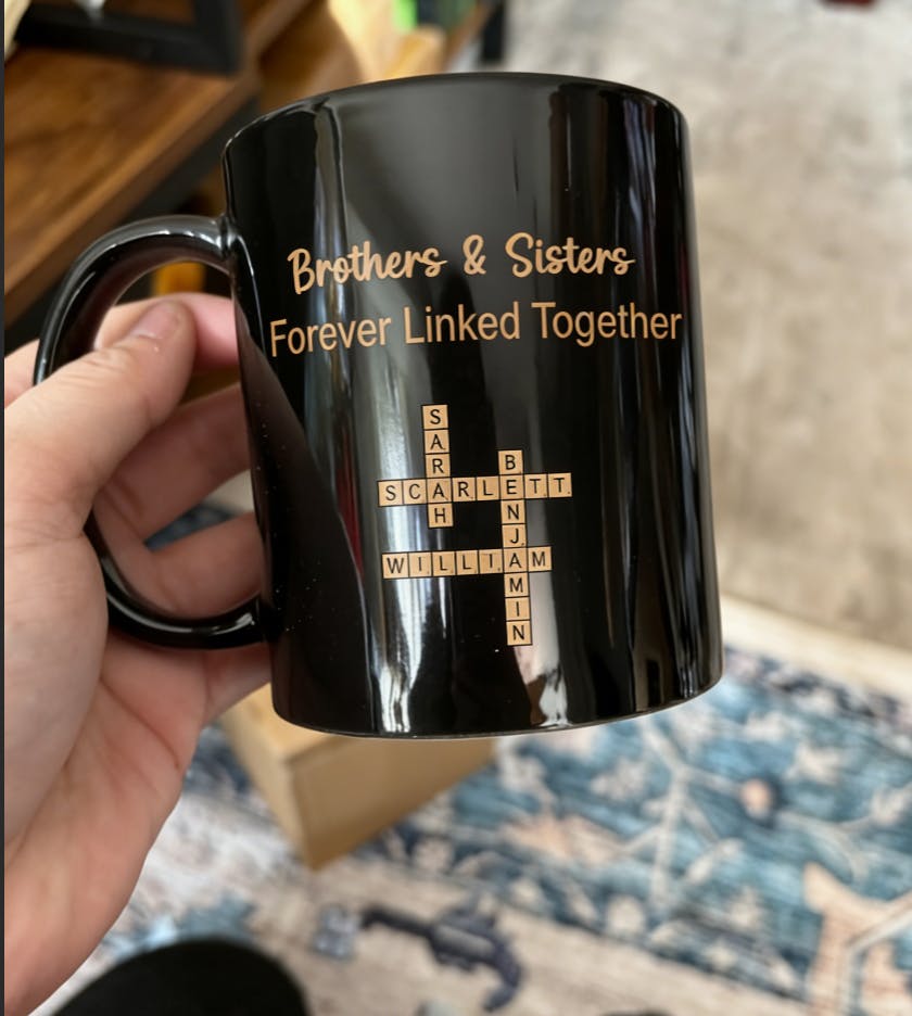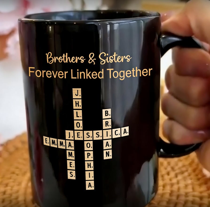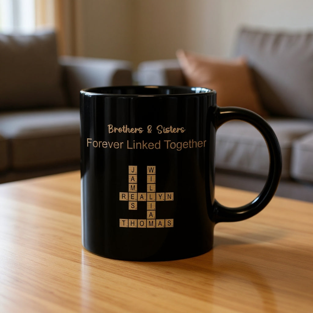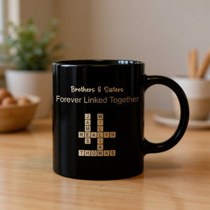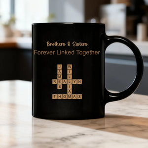 Honor the special connection between siblings with our personalized Brothers & Sisters Crossword Mug. This elegant black ceramic mug features the heartfelt message "Brothers & Sisters Forever Linked Together" with a custom crossword puzzle created from your siblings' names. Perfect for daily coffee rituals or as a thoughtful gift that celebrates siblinghood.