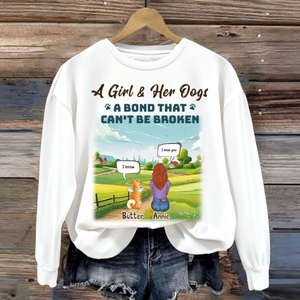 Key Message: The top of the hoodie prominently displays the title "A Girl & Her Dogs" or "A Man & His Dogs" and the core phrase "A BOND THAT CAN'T BE BROKEN".