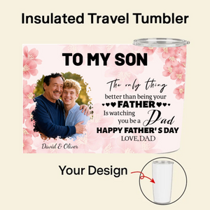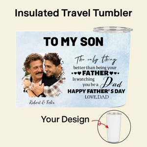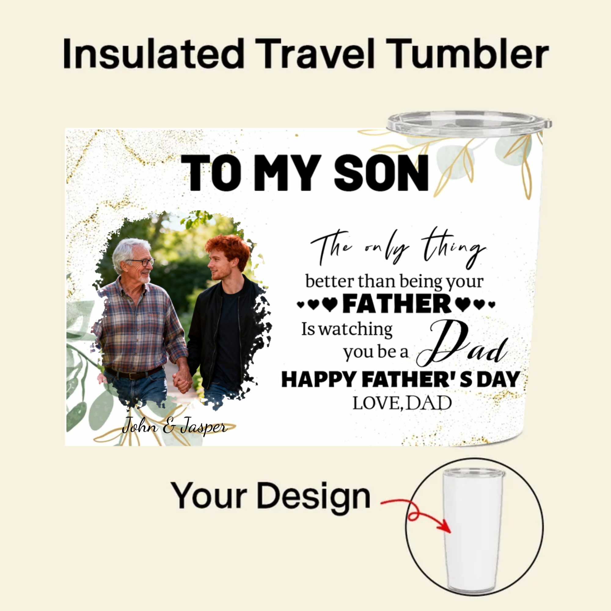 Honor the special bond between fathers and sons with our heartfelt personalized tumbler. This premium 20oz insulated cup lets you create a unique tribute by uploading a cherished photo and adding both names, paired with the timeless message, "The only thing better than being your FATHER is watching you be a Dad". It’s more than a drinkware—it’s a lasting keepsake for Father’s Day, a new chapter of parenthood, or any moment worth celebrating between generations.