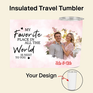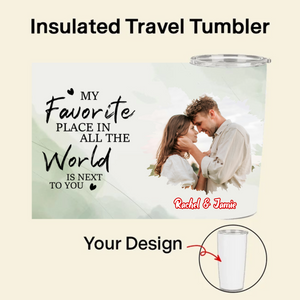 Carry the warmth of your love wherever you go. Our Insulated Travel Tumbler lets you celebrate your unique bond in two special ways. Choose to upload a cherished photo of you and your partner, or create a custom avatar by selecting their hairstyle, skin tone, and outfit. Paired with the heartfelt message "MY Favorite PLACE IN ALL THE World IS NEXT TO YOU", this 20oz tumbler is a daily reminder that your favorite place is right next to them. Perfect for keeping drinks hot or cold for hours, it’s a gift that blends romance with practicality.