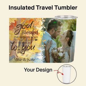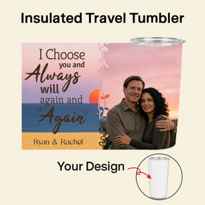 Celebrate the journey that brought you together. This isn’t just a tumbler; it’s a portable tribute to your unique love story. Upload a cherished photo, choose a meaningful quote about fate or choice, and select a breathtaking background. Featuring the message "I Choose you and Always will again and Again" or "God Blessed the Broken Road that led me straight to you", this 20oz vacuum-insulated tumbler lets you carry a piece of your heart—and your favorite drink—wherever you go.