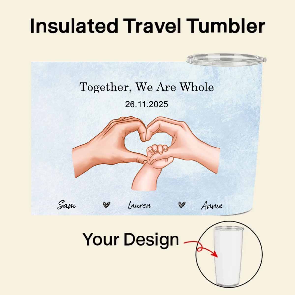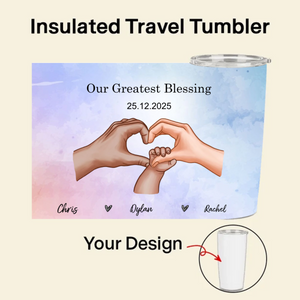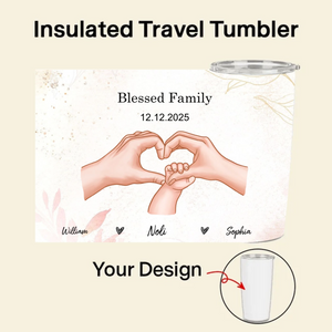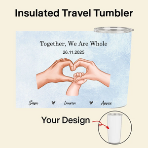 Celebrate your unique family bond with our personalized Hands Forming Heart Tumbler! This insulated travel mug features a beautiful design of hands forming a heart - which you can customize with different skin tones to represent your family. Add your special text like "Together, We Are Whole" or "Our Greatest Blessing," include names and a significant date, and choose your background color. Whether it's for new baby announcements, anniversaries, or family celebrations, this 20oz tumbler keeps your drinks warm while warming hearts.