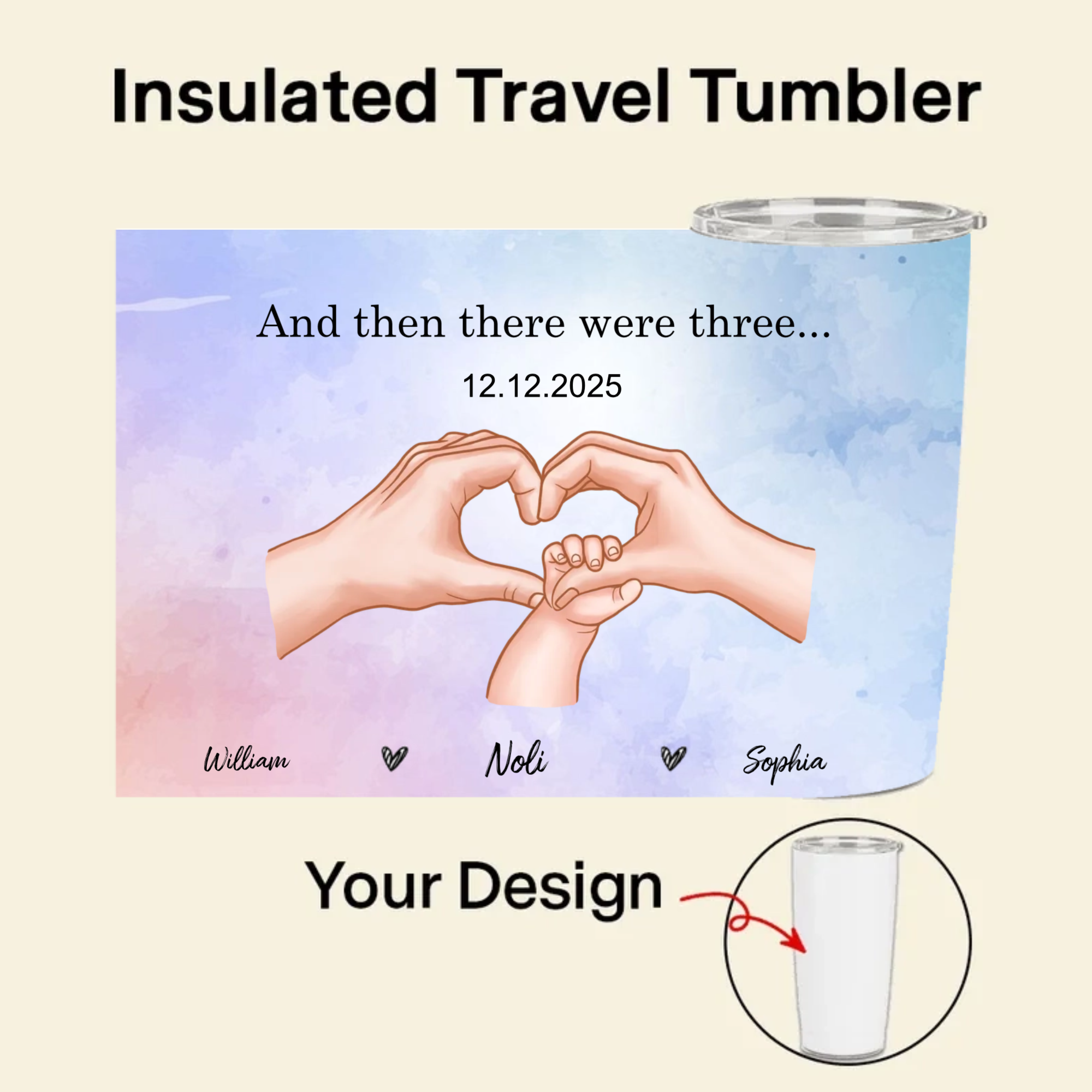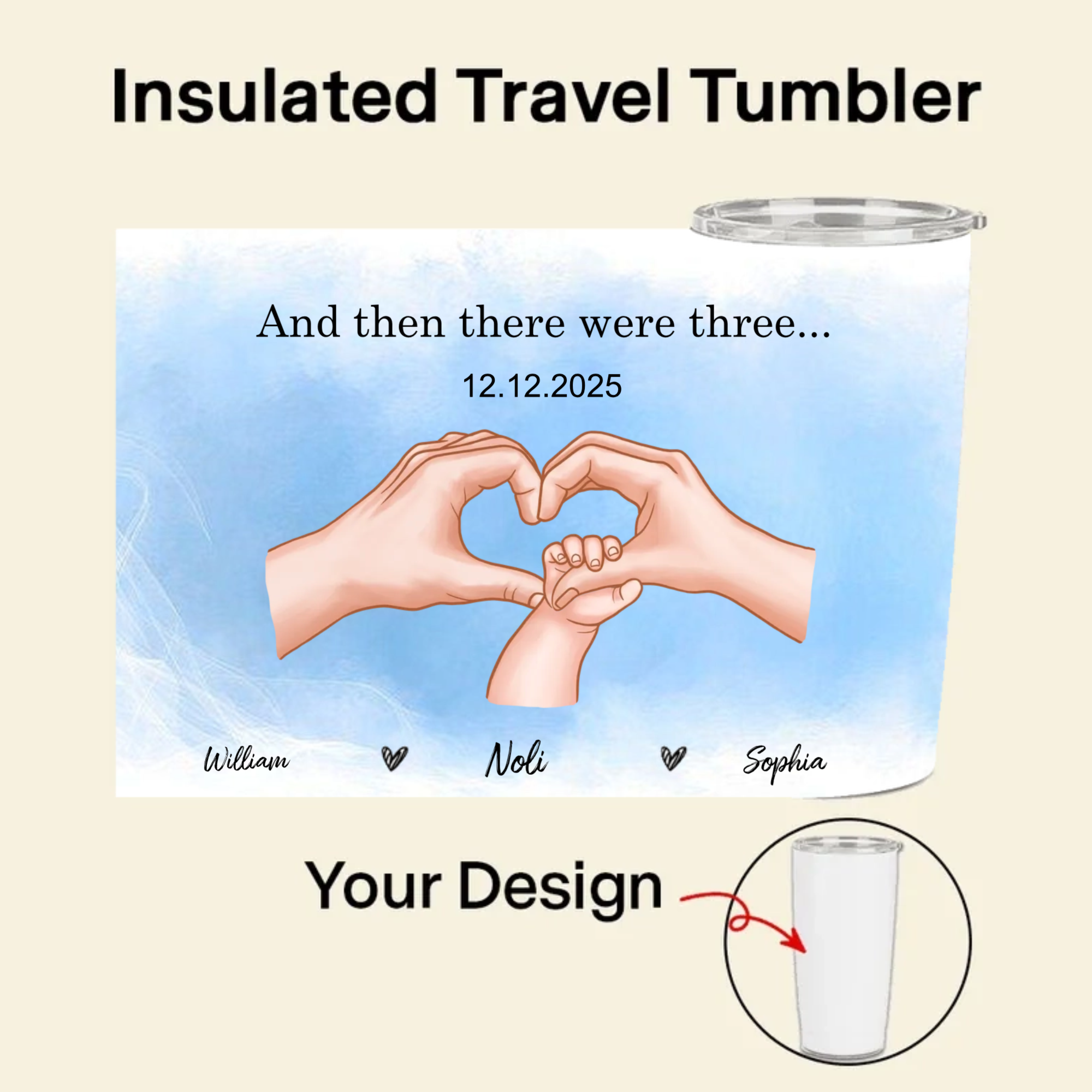 Our Family Of Three Personalized Hands Tumbler, Gift for Couples, Parents, Families, Perfect for Anniversary, New Baby, Christmas Celebration