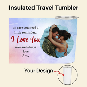 Carry a piece of your heart wherever you go with our Insulated Travel Tumbler. This premium stainless steel cup lets you create a unique, personal design by uploading a cherished couple photo, adding a special name, and choosing a beautiful background. Featuring a loving message that says, "In case you need a little reminder... I Love You now and always love [Name]", it’s the perfect way to keep your bond close during travels, at work, or at home. Made with high-quality 304 stainless steel interior and 201 stainless steel exterior, it’s built to last and keep your drinks at the perfect temperature for hours.