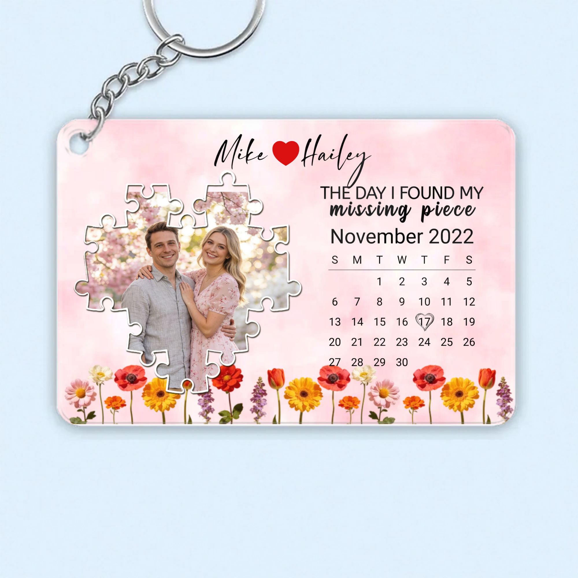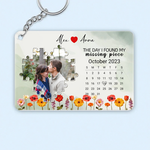 Celebrate the day your hearts fit perfectly together. Our personalized Puzzle Heart Photo Keychain is a beautiful, wearable token of your unique love story. Upload a cherished couple photo, add both of your names, choose a romantic background, and mark the exact day that changed everything. Featuring the iconic phrase "THE DAY I FOUND MY missing piece" and a special monthly calendar, itâs a daily reminder of the moment you completed each otherâs puzzle.