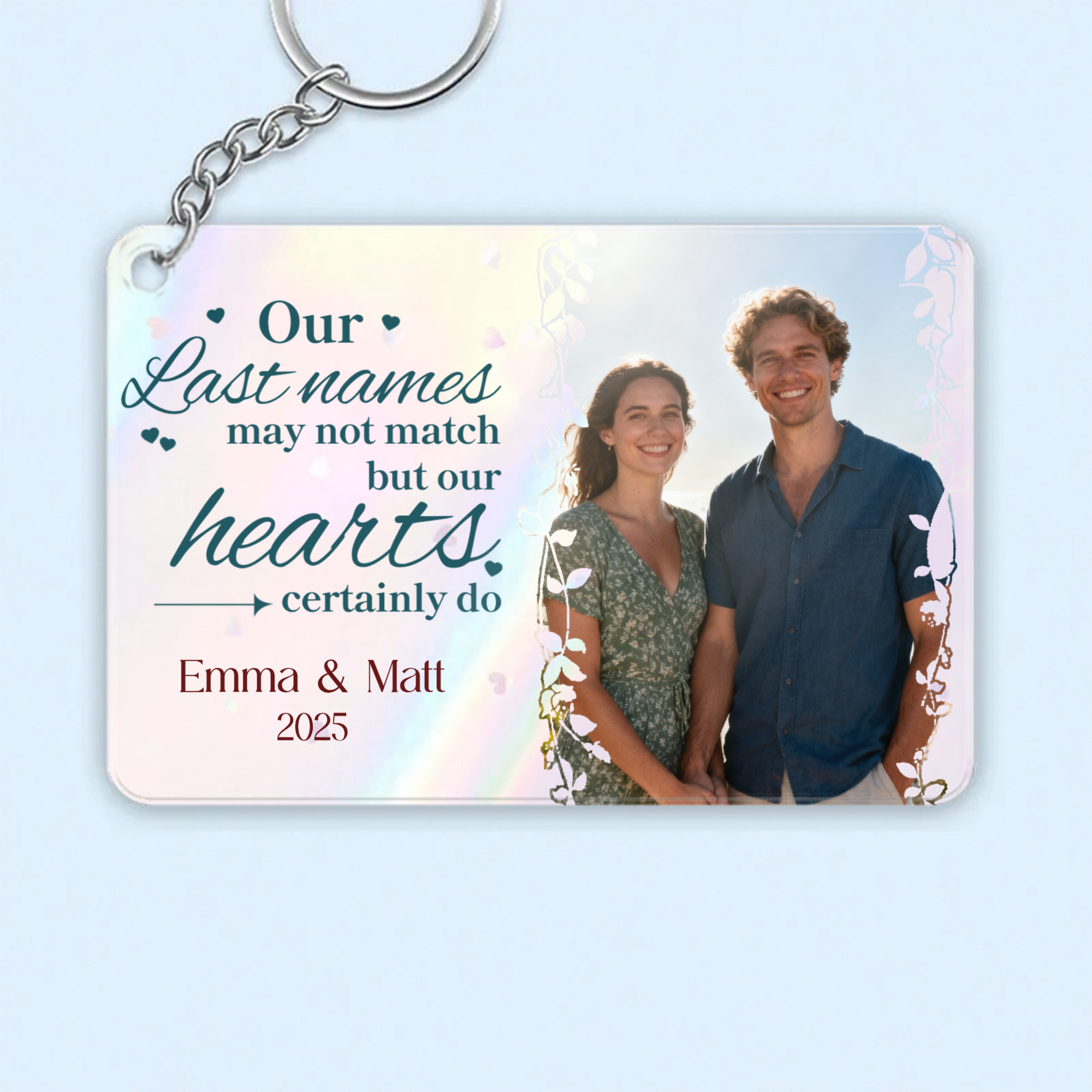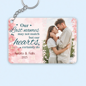 Carry a piece of your love wherever you go. Our personalized acrylic keychain is a durable and stylish way to celebrate your unique bond. Upload a cherished couple photo, add both of your names and a special year, and choose a heartfelt quote that speaks to your journey. Available in three sizes, it’s the perfect accessory for keys, bags, or as a sentimental wedding keepsake. Whether your last names match or not, let your hearts tell the story.