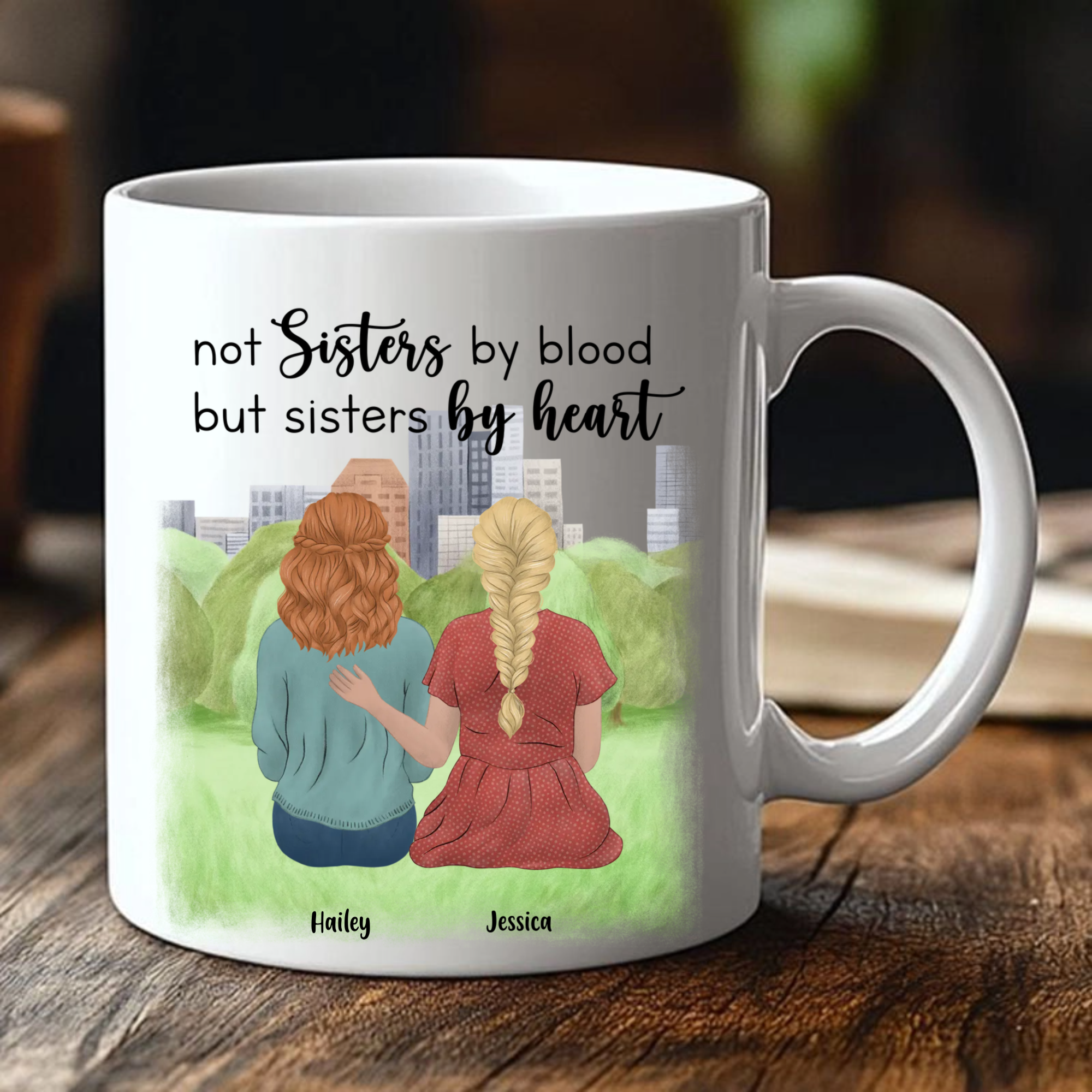Honor the special bond that goes beyond family ties with our personalized "Not Sisters by Blood" mug. Change the background, choose your hairstyles, skin tones, and outfits, and add your names to create a one-of-a-kind tribute to your unique friendship. Itâs the perfect way to say, âYou're the sister I chose.â
