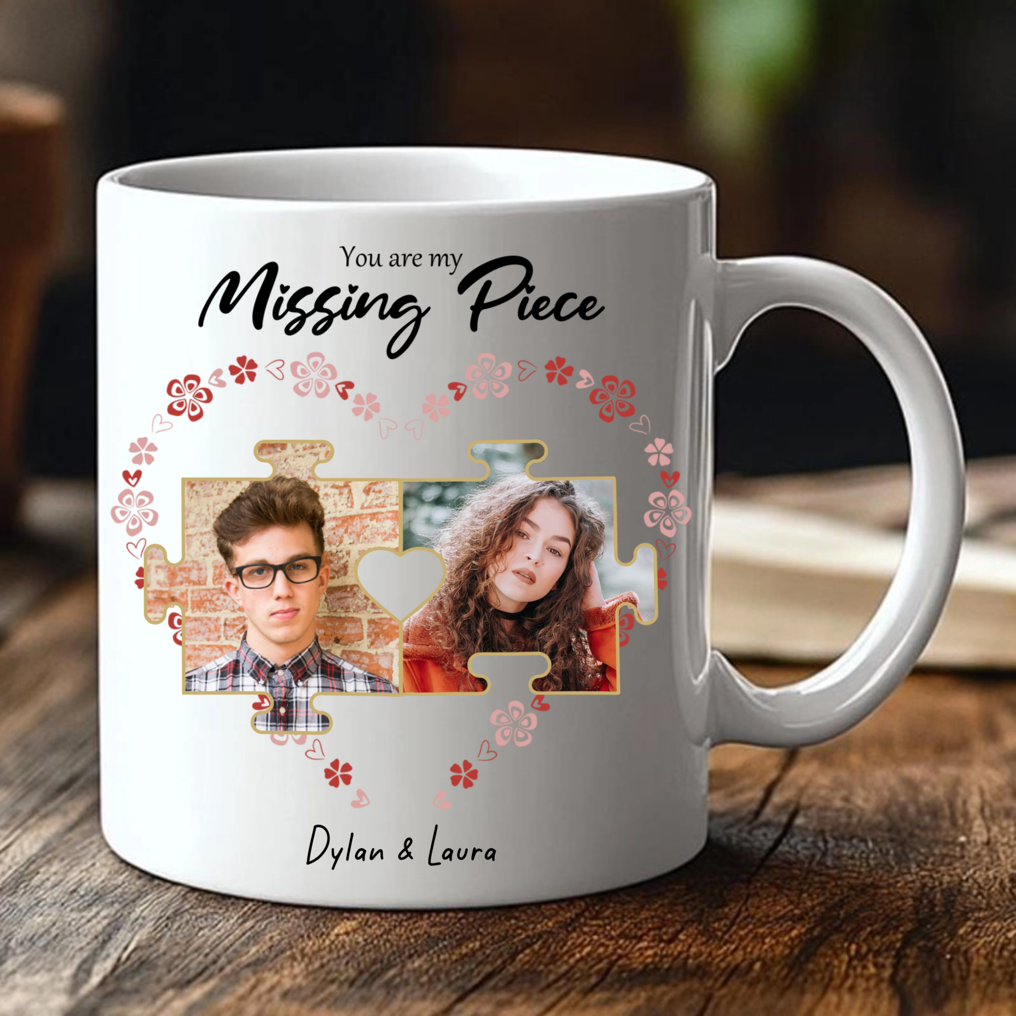 Celebrate the one who completes your story with this enchanting "You Are My Missing Piece" Photo Mug! This beautifully designed ceramic mug features your special photos nestled within a unique puzzle-piece heart, surrounded by delicate floral and butterfly accents. Perfect for couples, this customizable mug lets you create a daily reminder of your beautiful connection - because every great love story has two pieces that fit perfectly together.