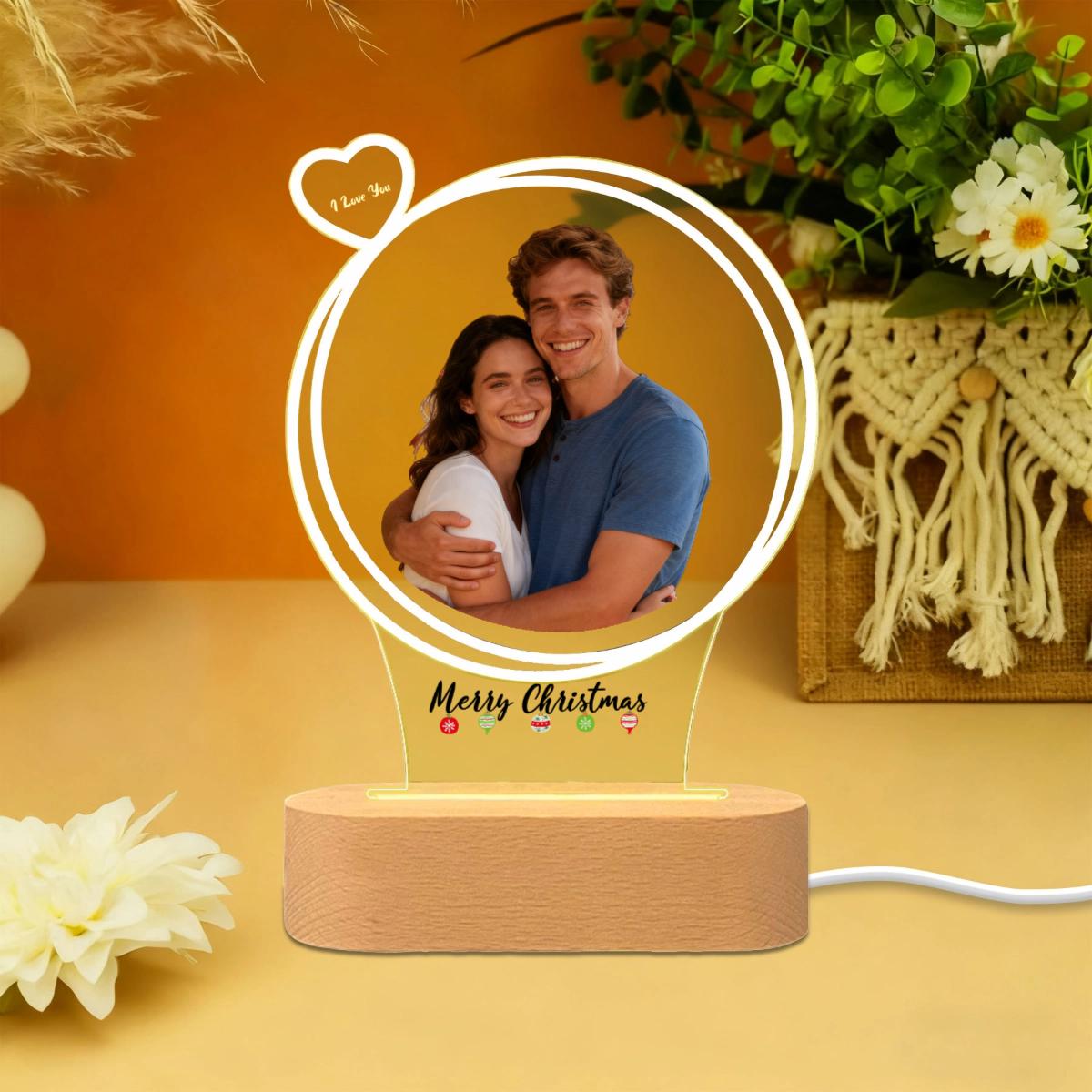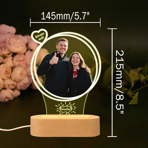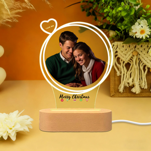 Create a warm holiday glow with this personalized Christmas night light that showcases your favorite photo alongside festive "Merry Christmas" typography. The circular design frames your special memory with a soft LED glow, while the wooden base adds natural charm. Perfect for displaying couple photos, family portraits, or pet pictures during the holiday season.