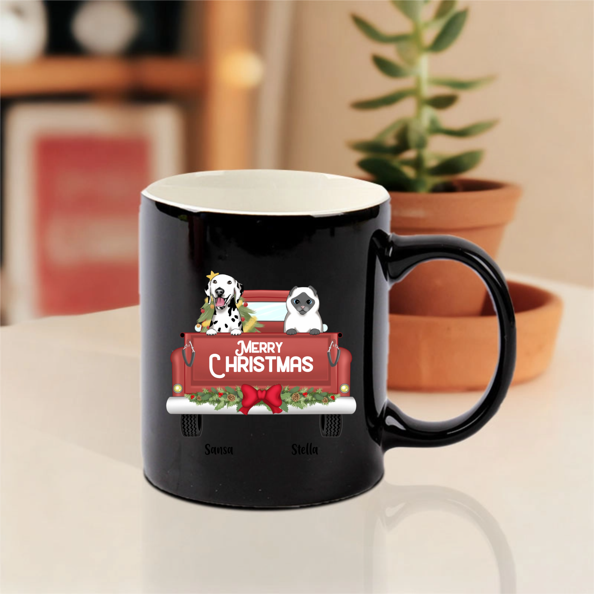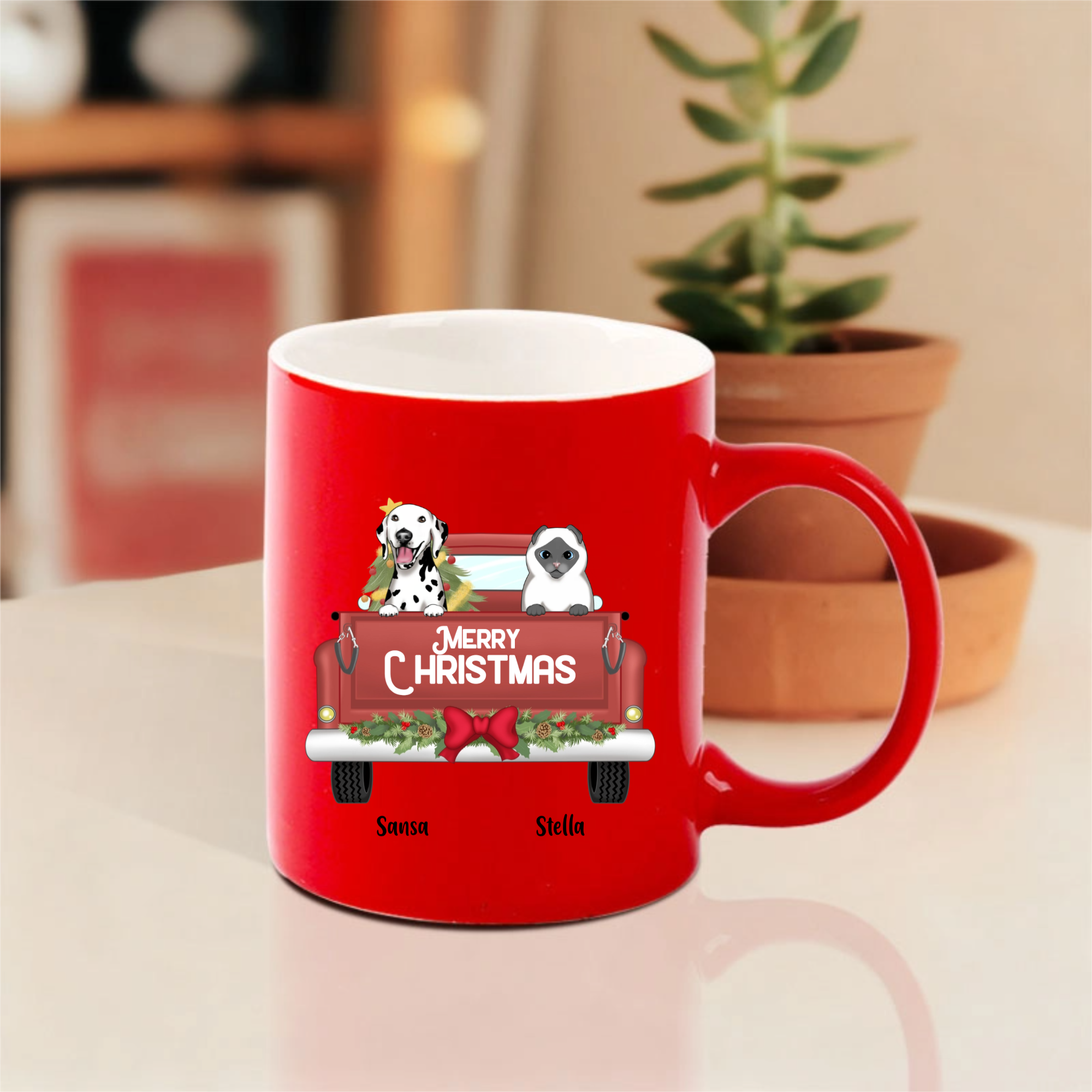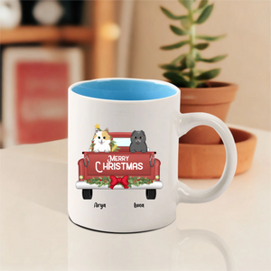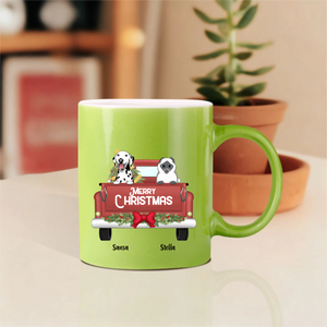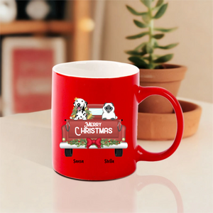 This customizable mug lets you choose your favorite pet breeds, add their names like "Sansa" and "Stella" shown here, and display a cheerful "MERRY CHRISTMAS" message. Perfect for enjoying hot cocoa or coffee while cuddling with your actual furry companions!