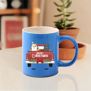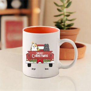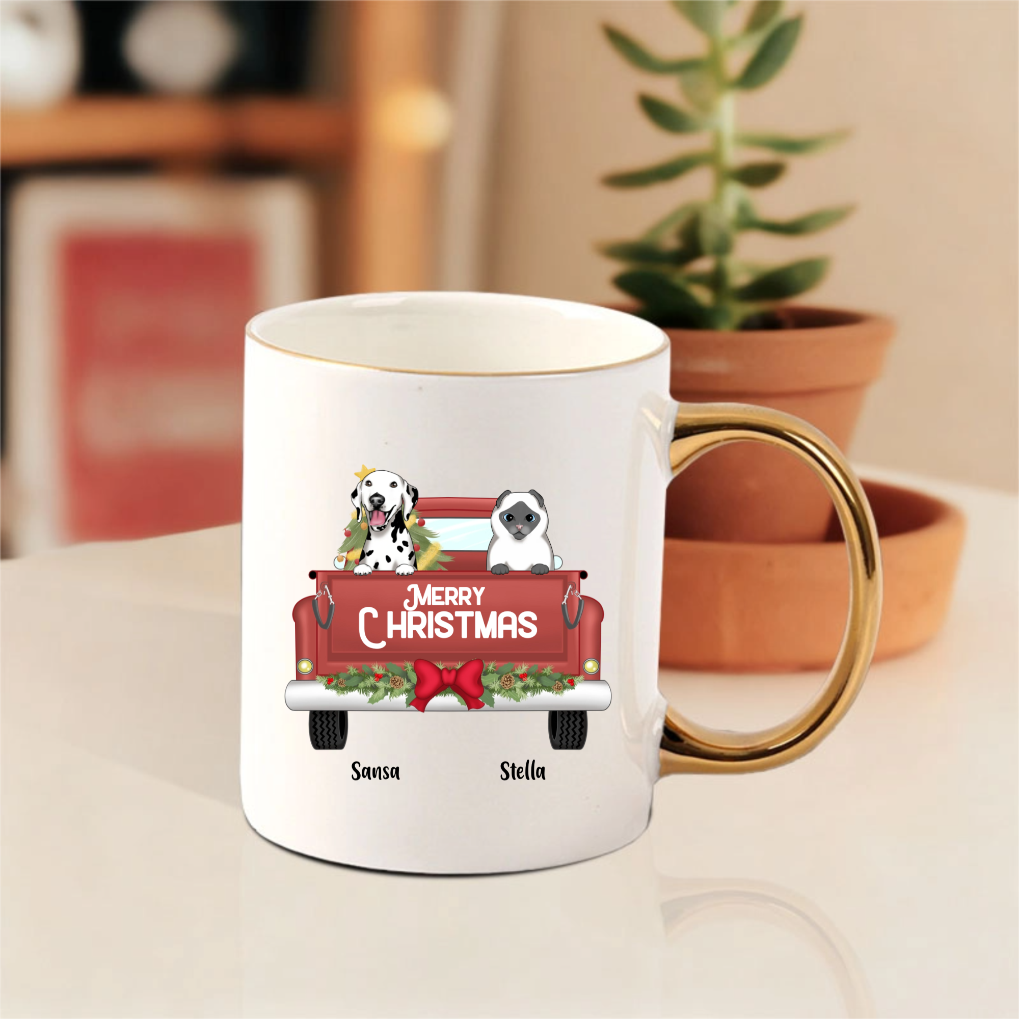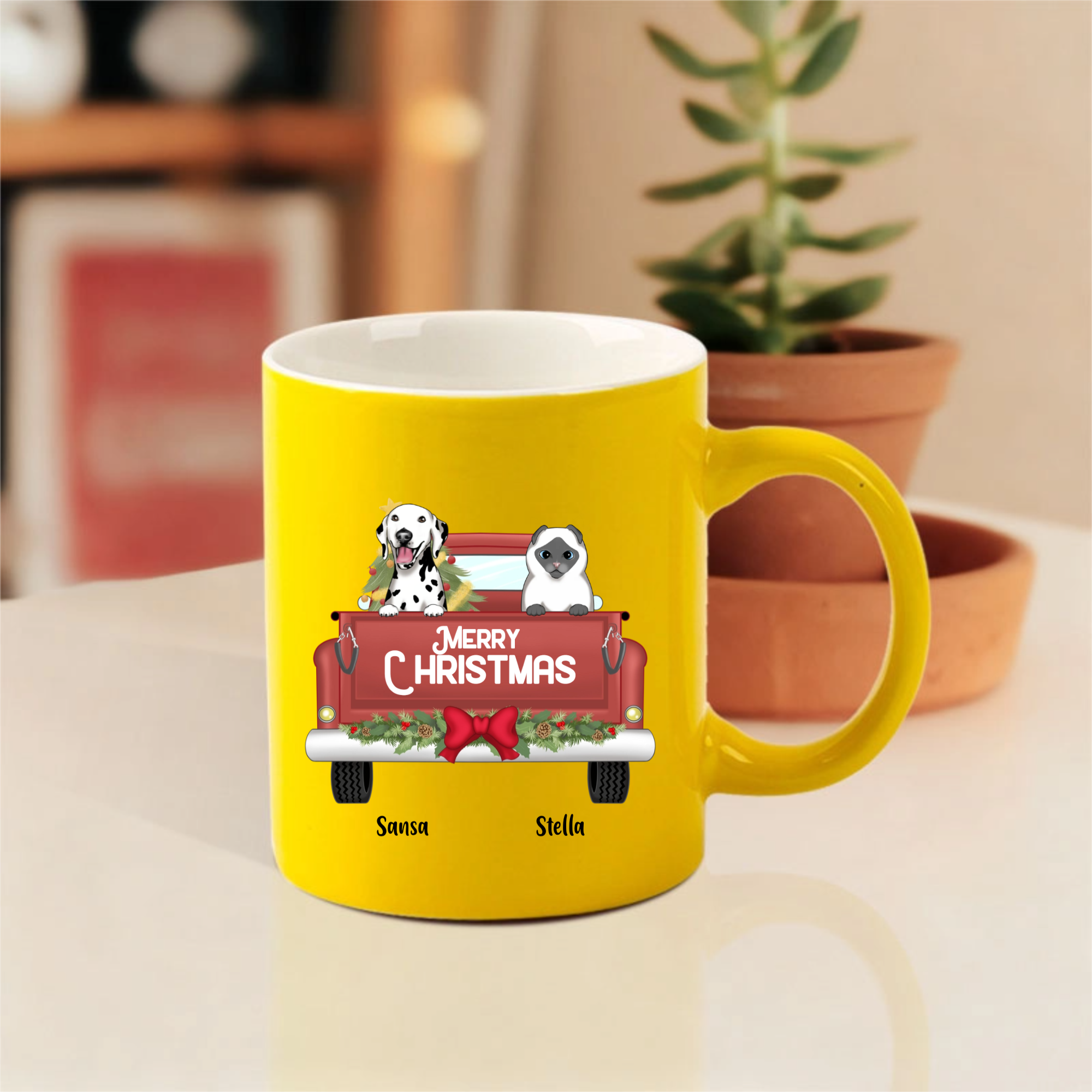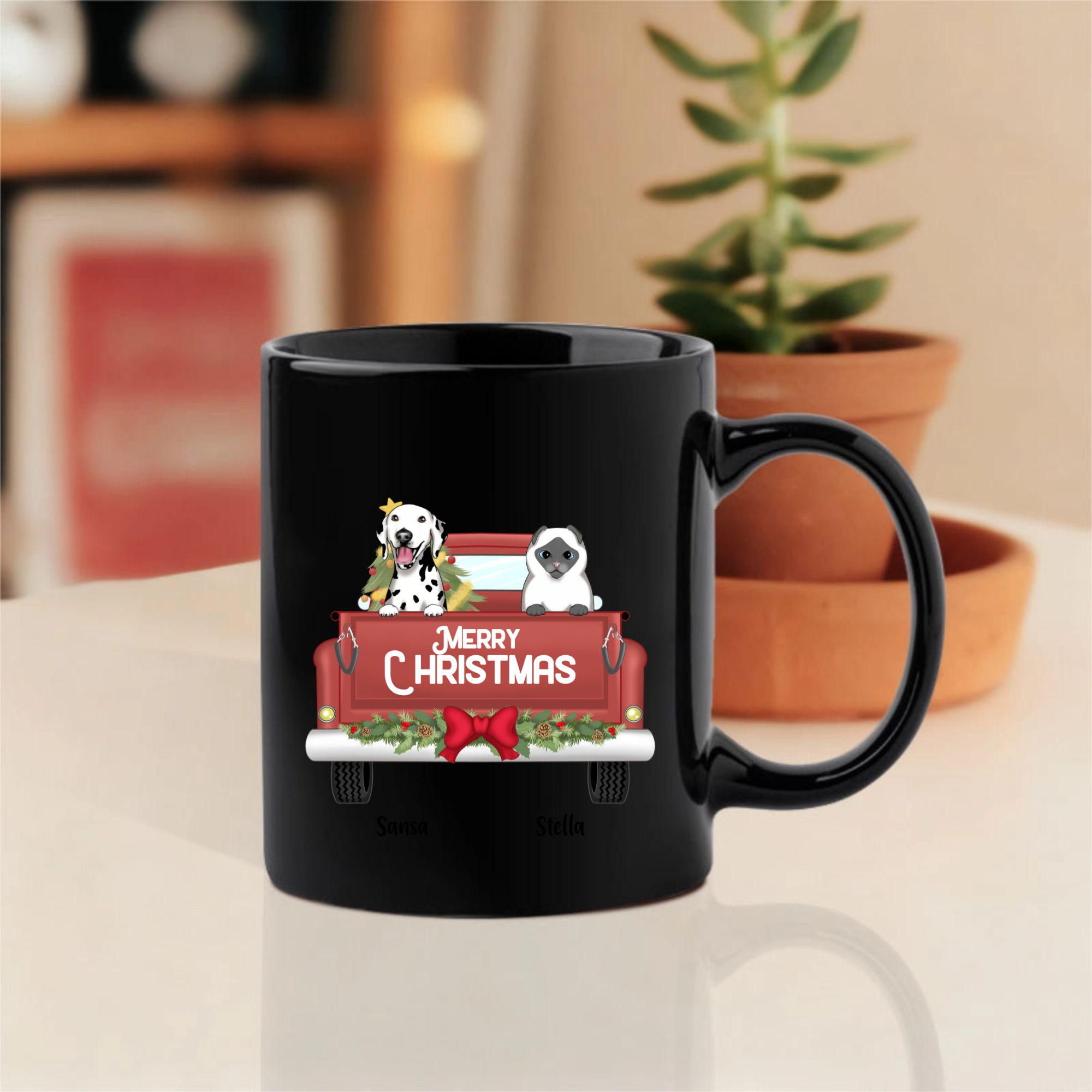 This customizable mug lets you choose your favorite pet breeds, add their names like "Sansa" and "Stella" shown here, and display a cheerful "MERRY CHRISTMAS" message. Perfect for enjoying hot cocoa or coffee while cuddling with your actual furry companions!