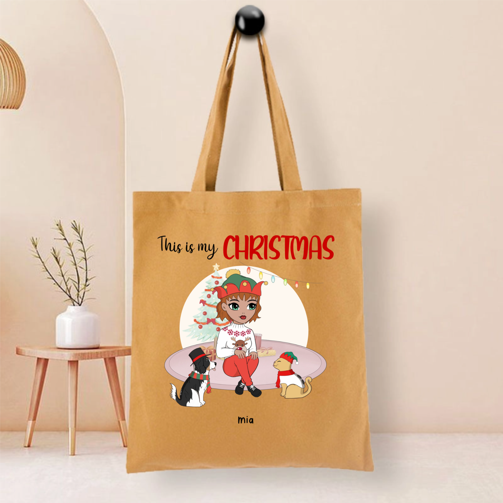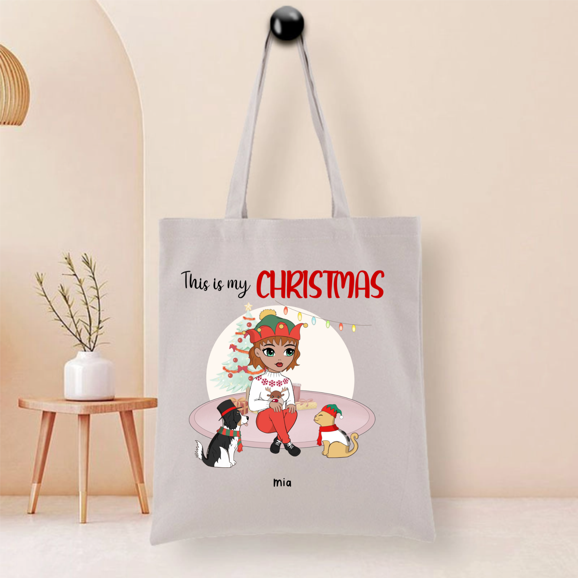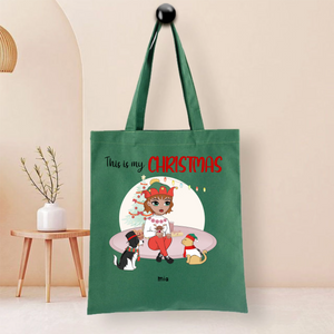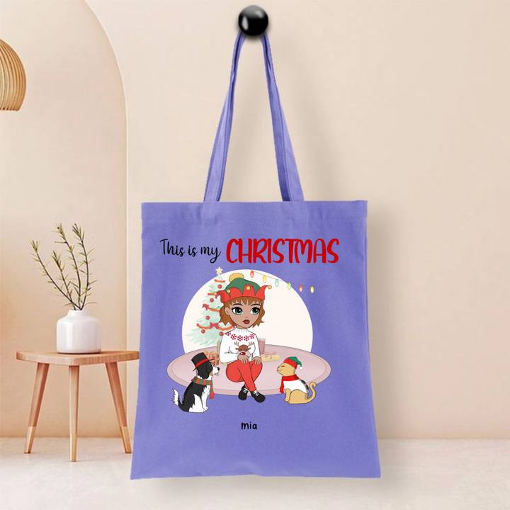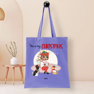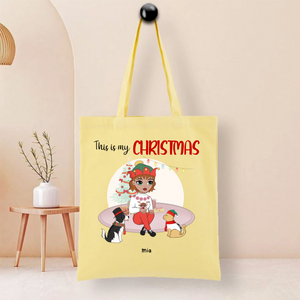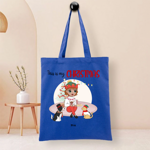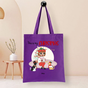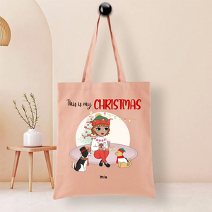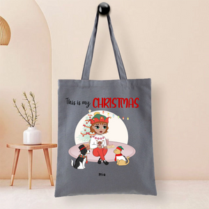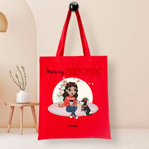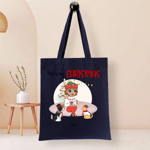 This durable tote bag features a festive "This Is My Christmas" design with a customizable character and optional pet companion. Made from ceramic-textured fabric with reinforced stitching, it offers both style and functionality. Personalize it with a name like "Nicole", choose hairstyles and outfits for the character, and add a dog or cat to create your unique holiday accessory.