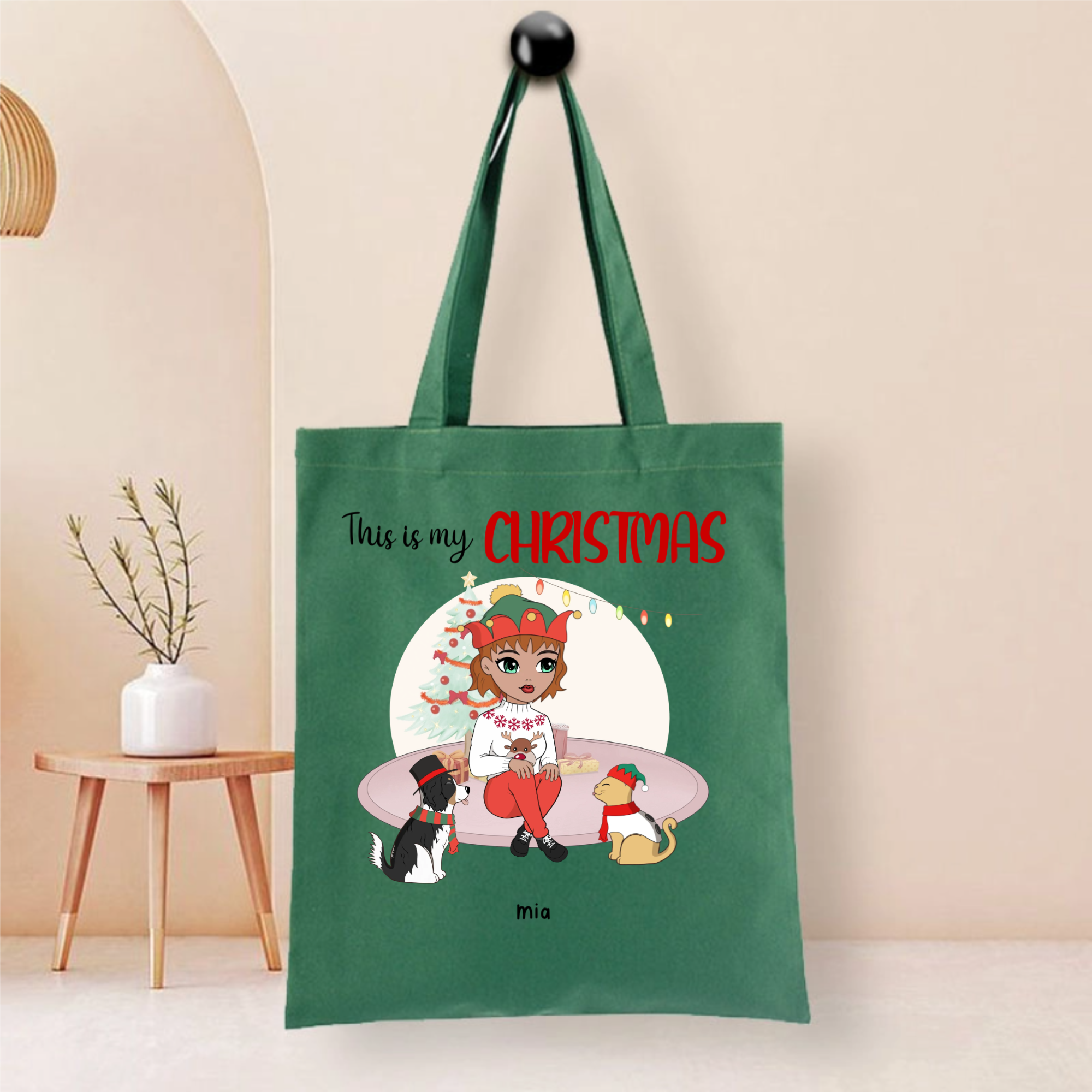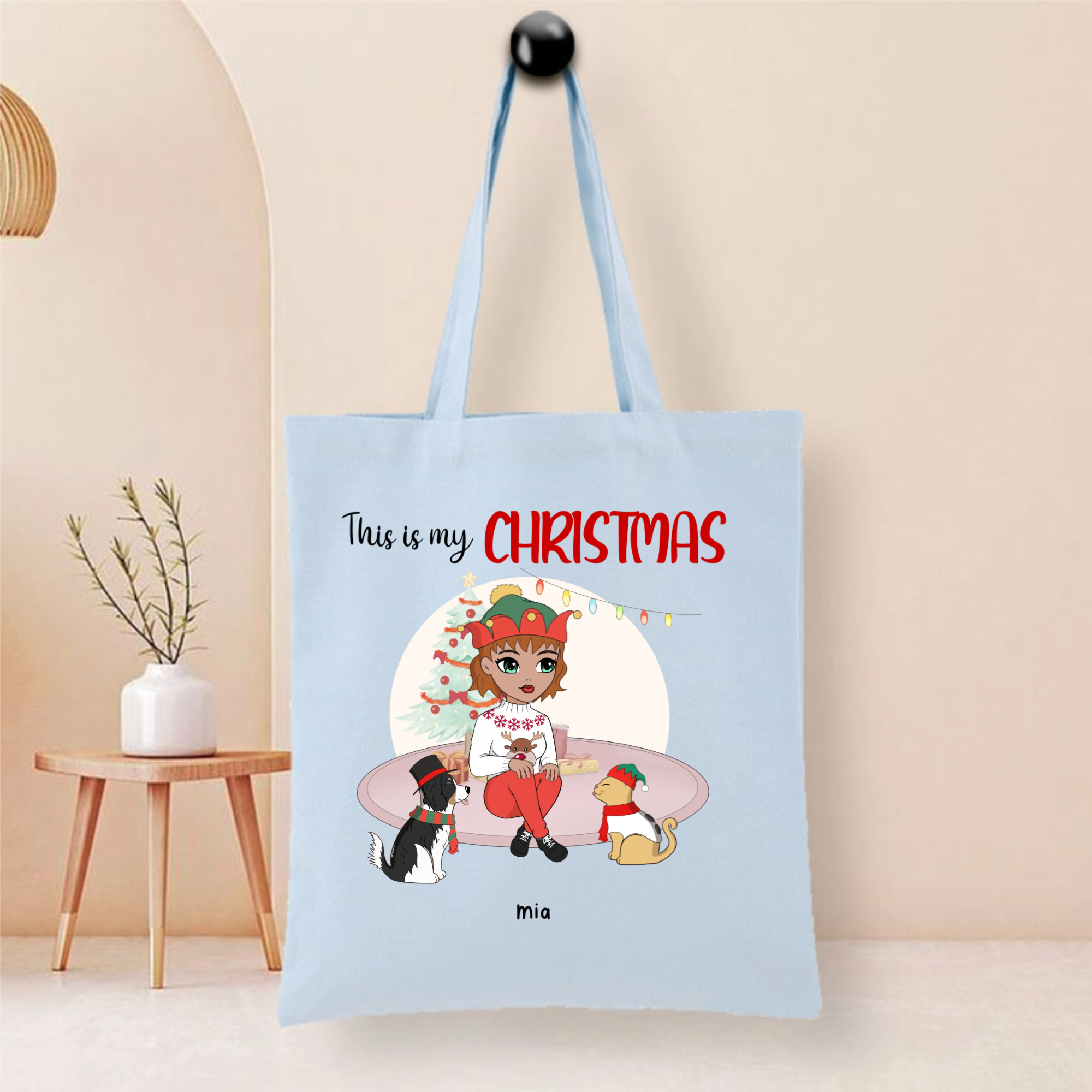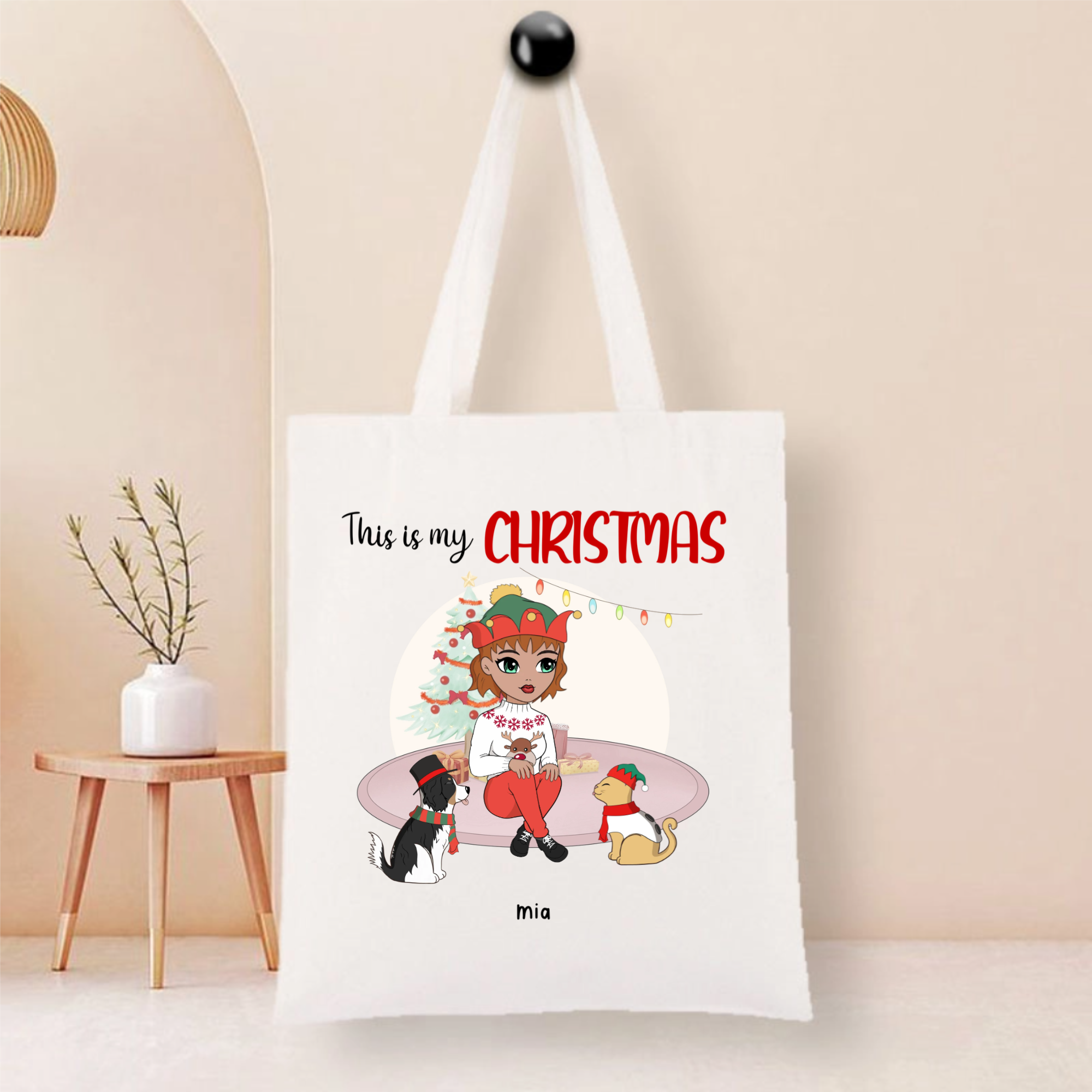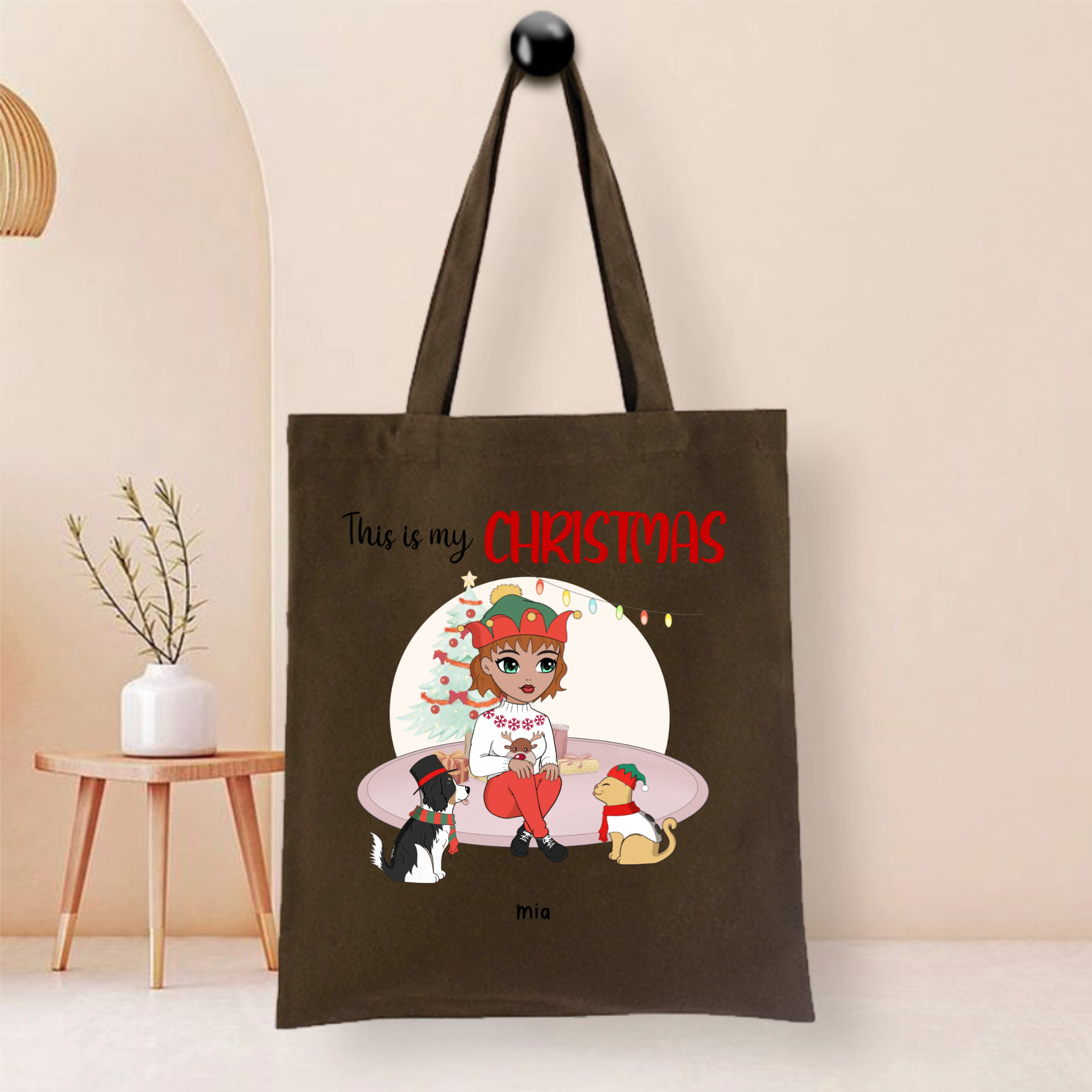 This durable tote bag features a festive "This Is My Christmas" design with a customizable character and optional pet companion. Made from ceramic-textured fabric with reinforced stitching, it offers both style and functionality. Personalize it with a name like "Nicole", choose hairstyles and outfits for the character, and add a dog or cat to create your unique holiday accessory.