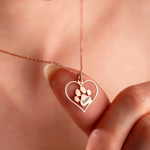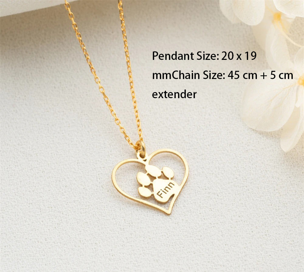 This delicate dog paw print necklace features a heart-shaped pendant with a customizable name engraving area. The 20×19mm pendant displays an engraved paw print design and can be personalized with a pet's name like "Bear" as shown. Made from stainless steel with 18K gold plating, it comes with a 45cm+5cm adjustable chain for comfortable wear.