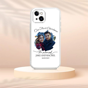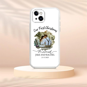 Capture the magic of your first holiday season as newlyweds with this beautifully designed phone case. Featuring an elegant layout with "Our First Christmas Married" text, this customizable case lets you showcase your favorite couple photo alongside your names and wedding date. Perfect for carrying a piece of your love story everywhere you go during the festive season.