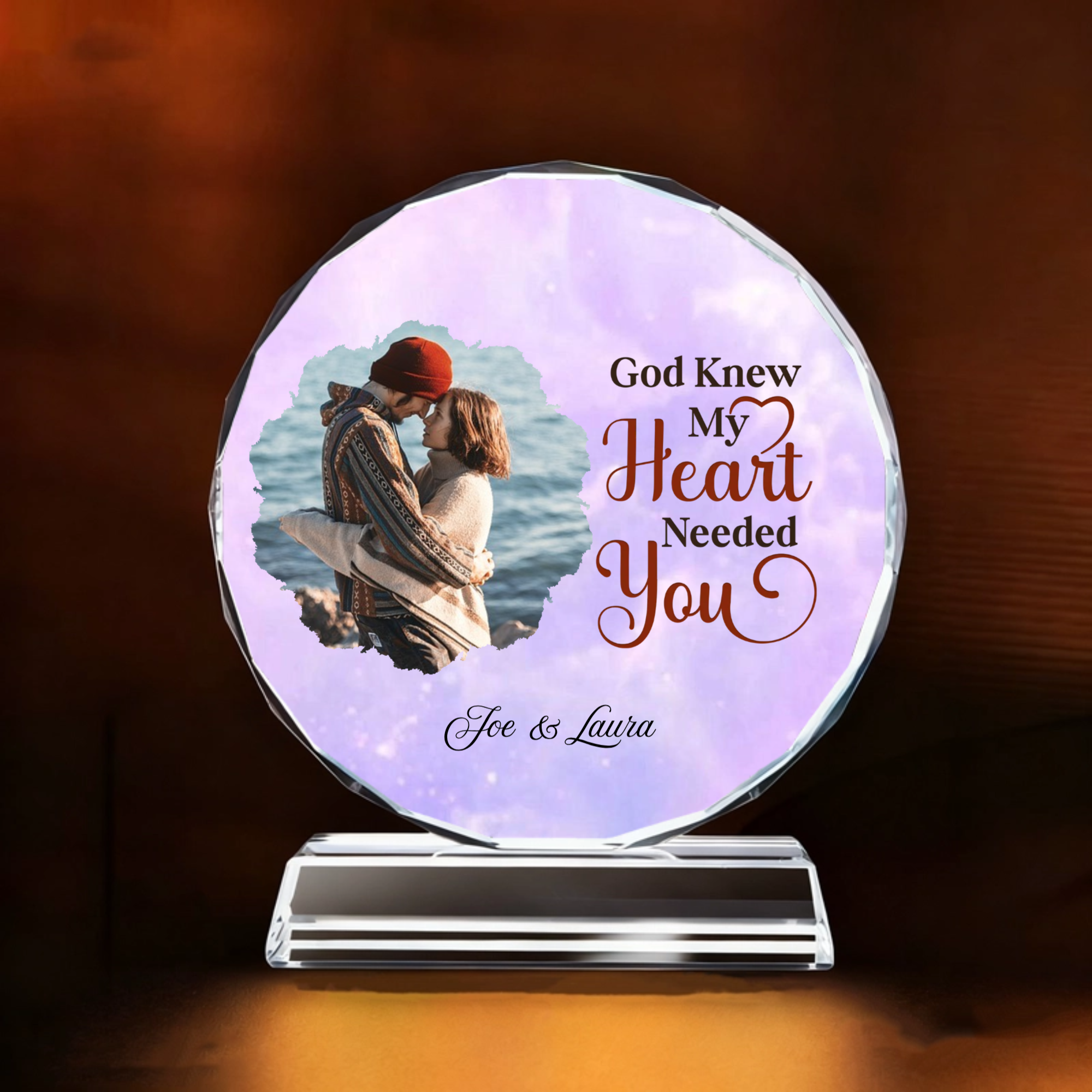 Capture the depth of your connection with our elegant White Crystal Desktop Keepsake. This exquisite piece allows you to create a truly personal tribute by uploading a special couple photo, choosing a romantic background, selecting a heartfelt quote, and engraving your names. Whether it’s a tender embrace by the water, a joyful wedding portrait, or a simple moment of togetherness, transform your memory into a timeless work of art displayed on a sleek, transparent base.