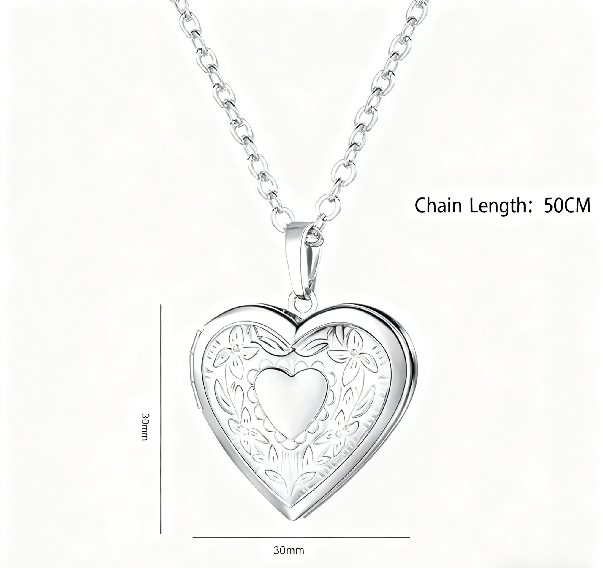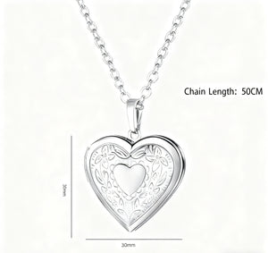 This elegant stainless steel heart locket features intricate floral engraving and measures 30mm x 30mm on a 50cm chain. The locket opens to hold a special photo, while the back can be engraved with custom text. Available in silver and gold finishes, it's a timeless way to carry cherished memories.