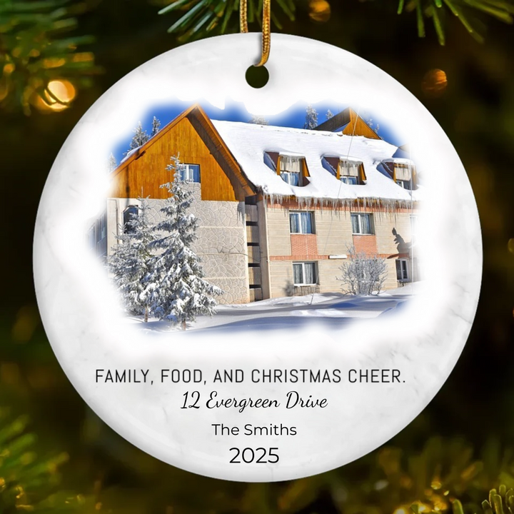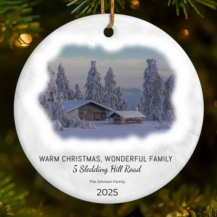 Celebrate your first Christmas in a new home or cherish years of family memories with this heartwarming ceramic ornament! Featuring a charming snowy house scene, this customizable decoration lets you create a timeless keepsake by adding your family photo, address, and special details. Perfect for commemorating new beginnings or honoring family traditions.