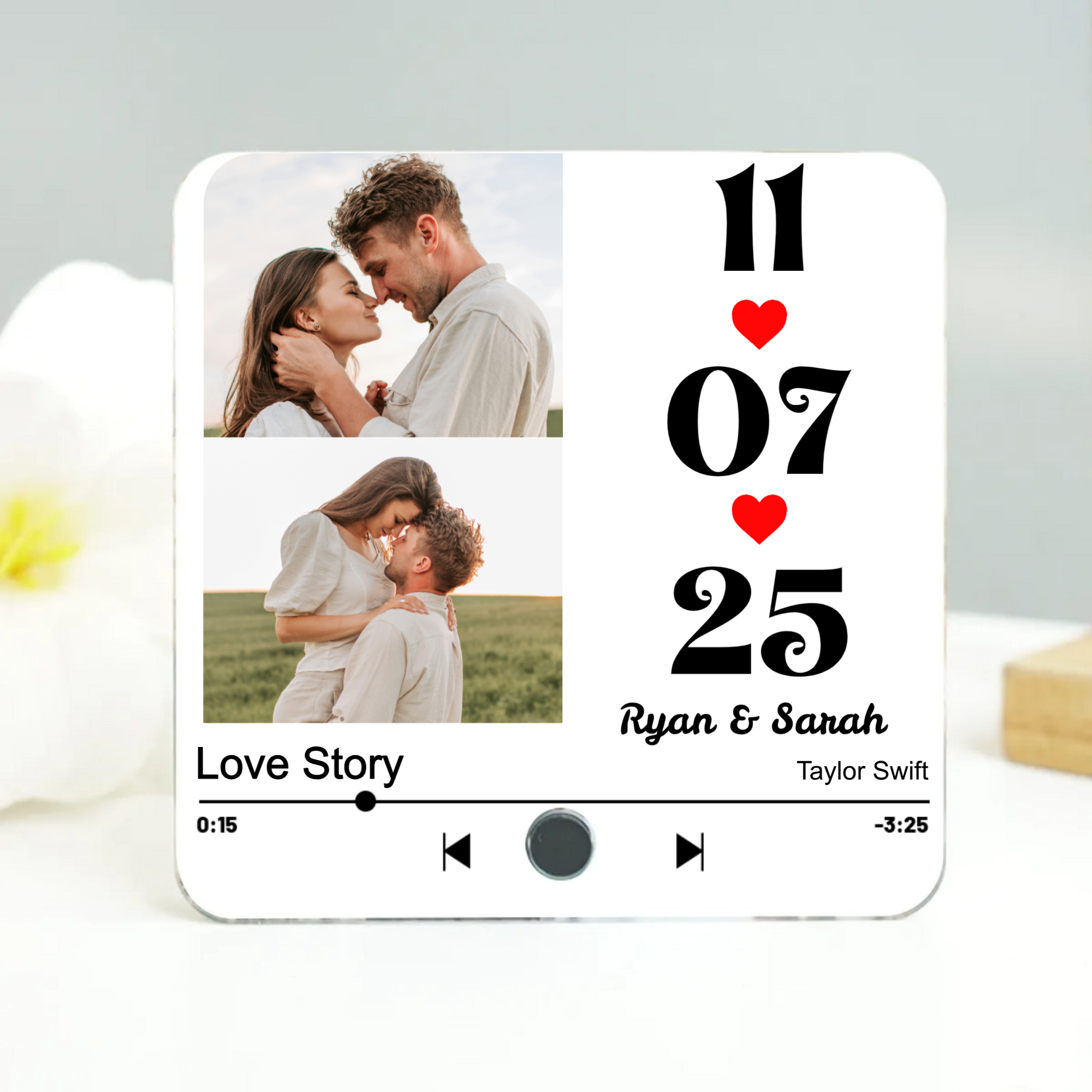 Turn your favorite memories into a musical masterpiece with our MP3 Music Player Fridge Magnet. This innovative fridge accessory allows you to upload a special photo, add names and a significant date, and even select a song that tells your unique love story. Whether itâs your anniversary, a special Christmas memory, or just because, this personalized player keeps your cherished moments and favorite tunes right on your fridge. A perfect blend of sentiment and function, itâs more than a magnetâitâs a daily dose of joy.