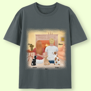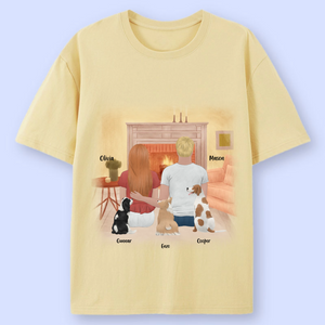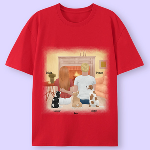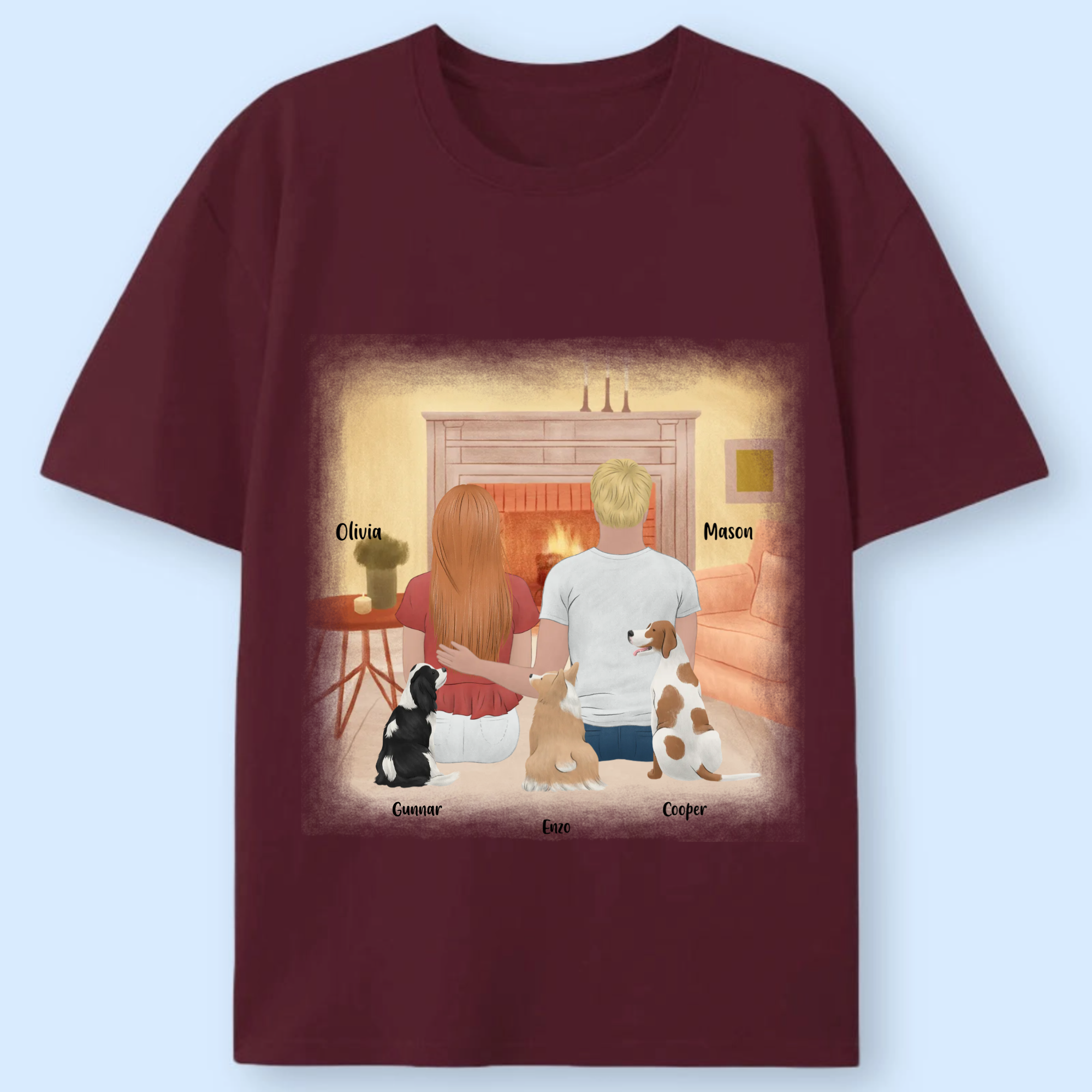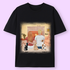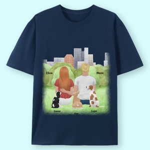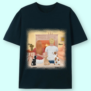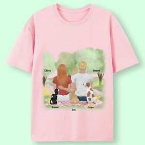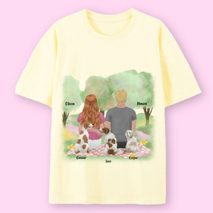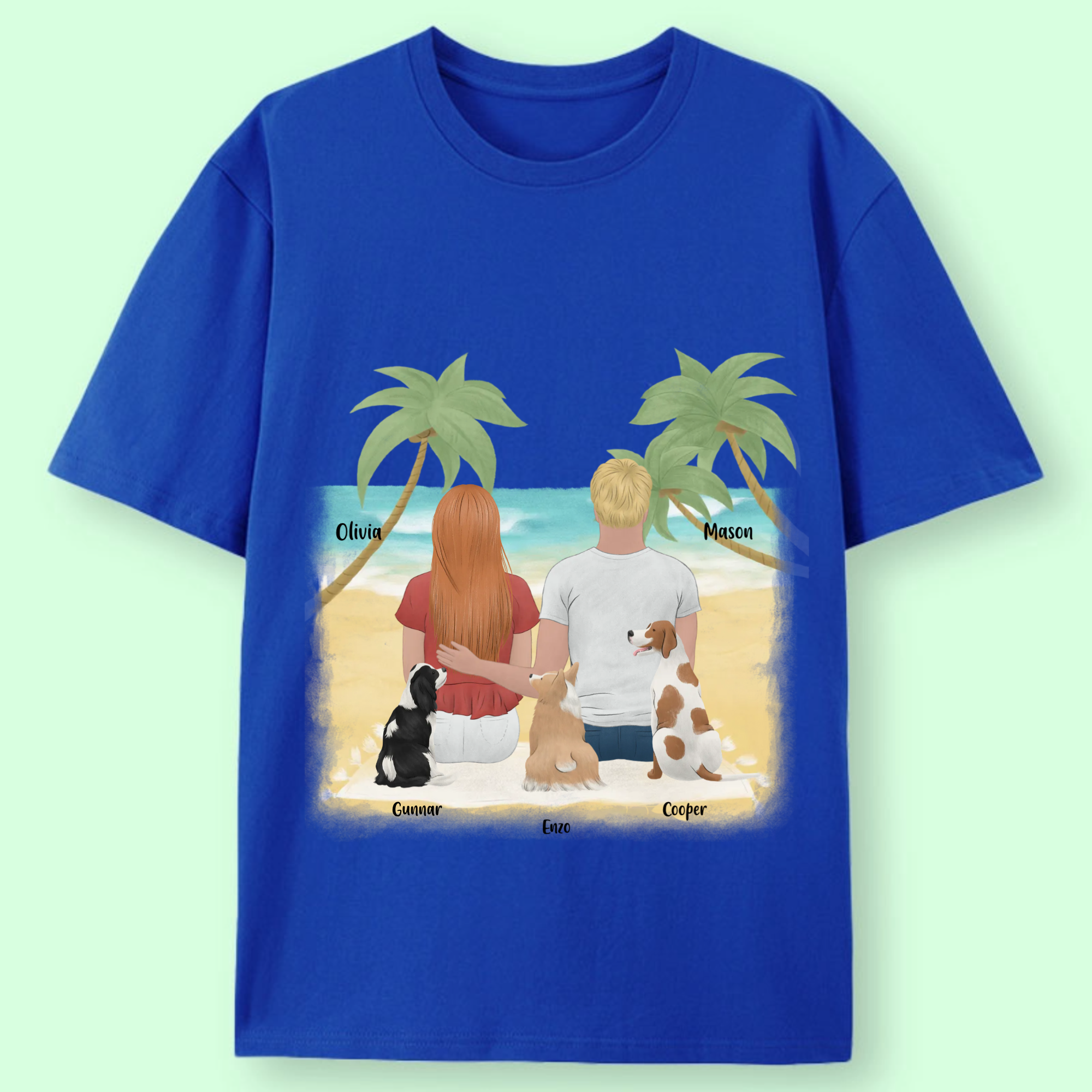 This soft cotton T-shirt features a charming vacation scene with a couple enjoying a relaxing moment with their dogs. Personalize the design with your names like "Olivia & Mason" and choose from 1-5 dog breeds to match your own furry friends. The unisex cut and breathable cotton fabric make it ideal for warm weather adventures or casual everyday wear.