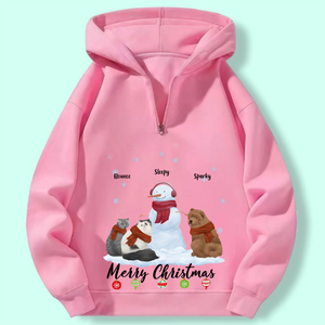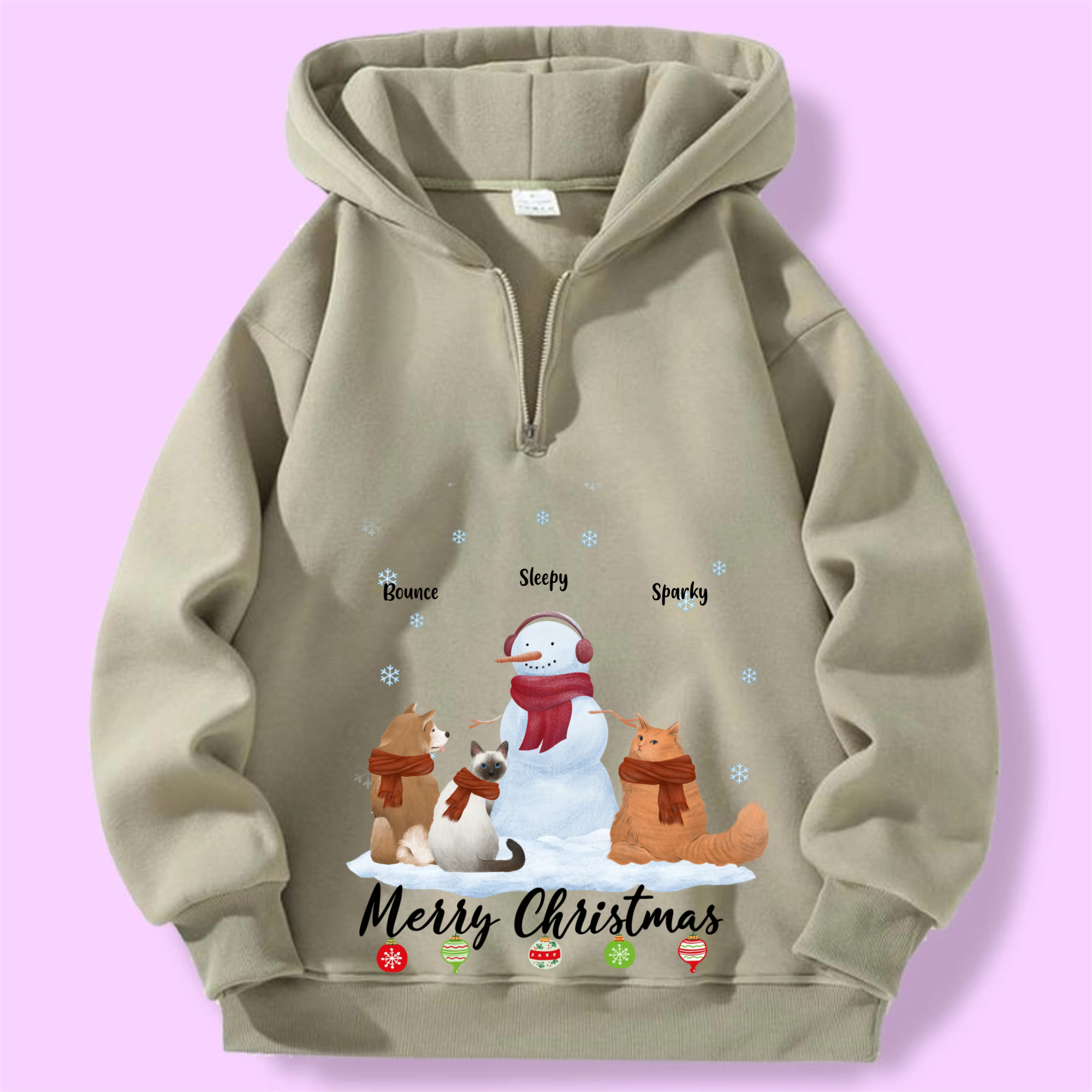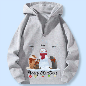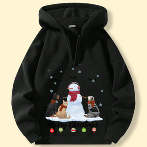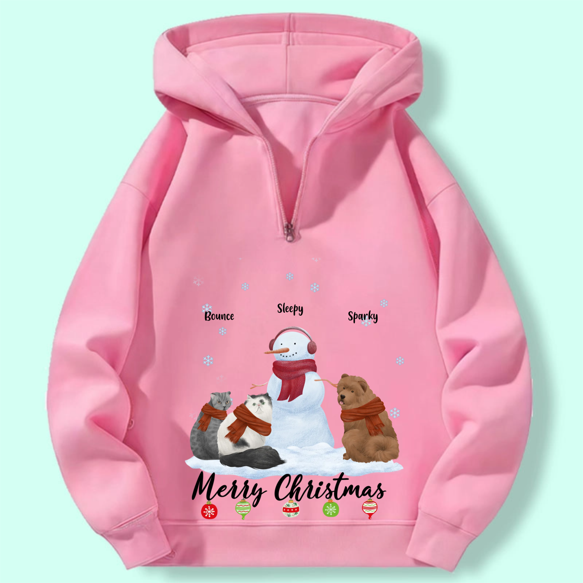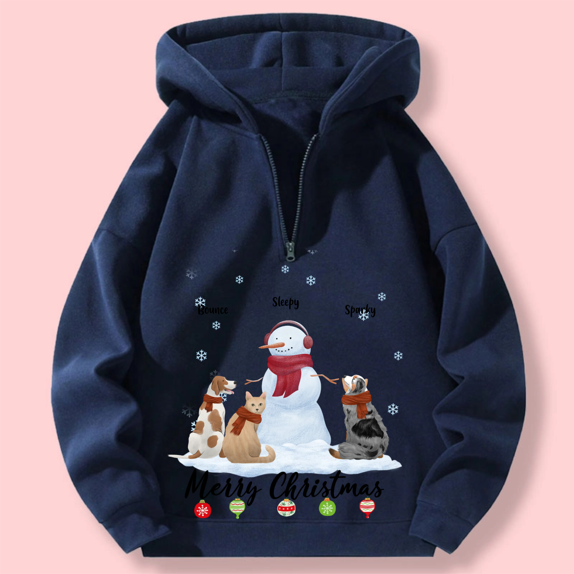 This soft hoodie features a detailed pencil-style drawing on the back showing a festive winter scene. A cheerful snowman wearing red earmuffs and a scarf stands center stage, surrounded by up to 5 customizable cats or dogs. Itās the perfect cozy sweater for pet owners who love the holidays.