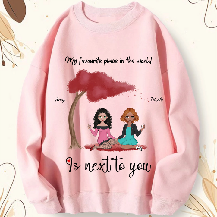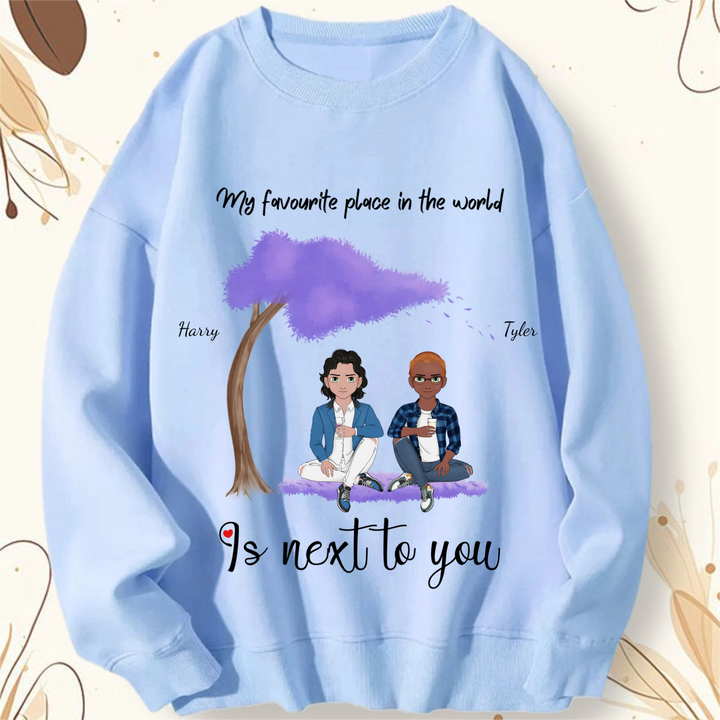 Carry your loved one close to your heart with this enchanting doll-style sweatshirt! Featuring the heartfelt message "My favourite place in the world is next to you," this customizable piece lets you create a wearable tribute to your unique relationship. Choose from various tree backgrounds, personalize appearances, and add names to make it truly yours.