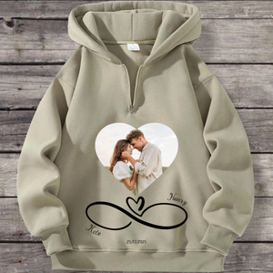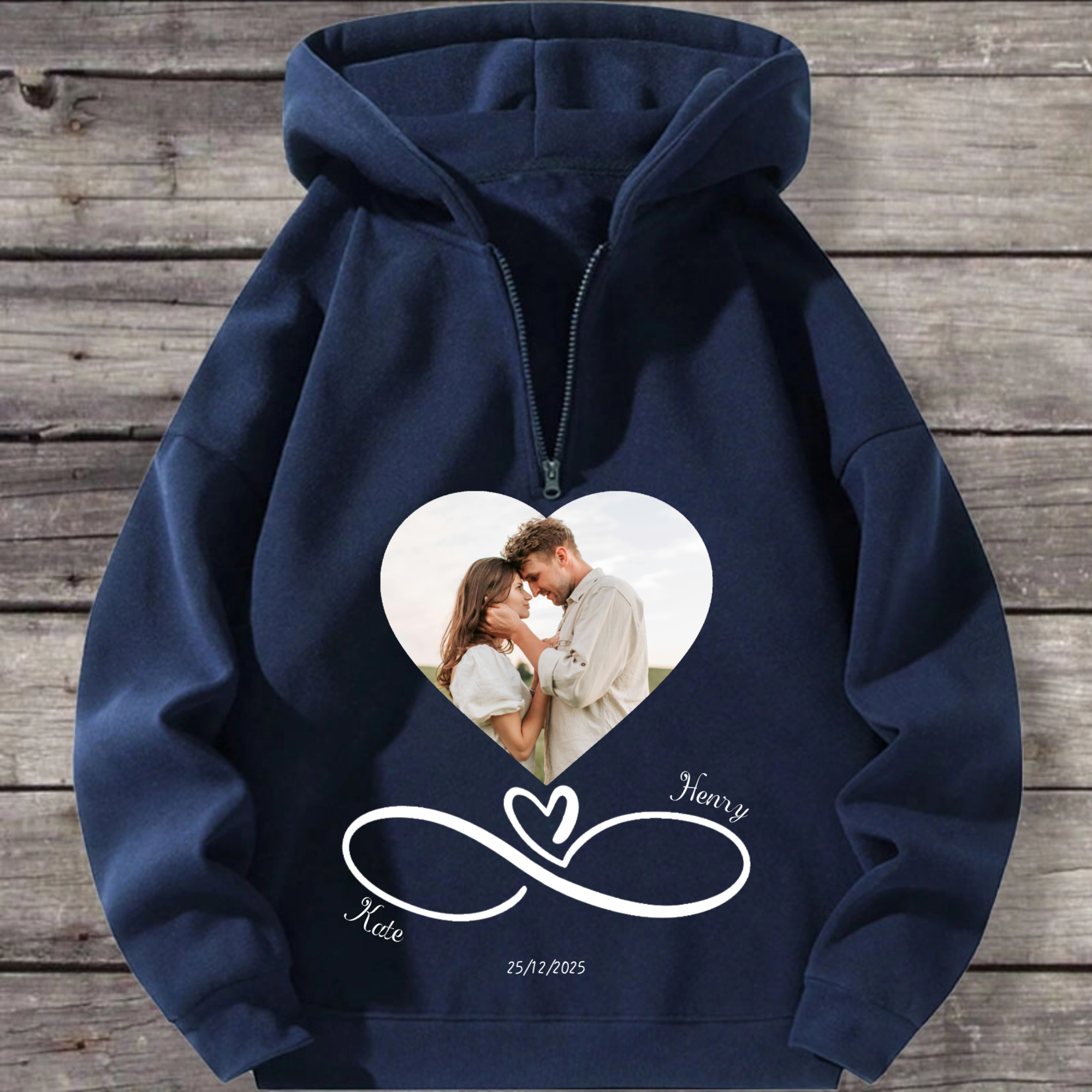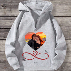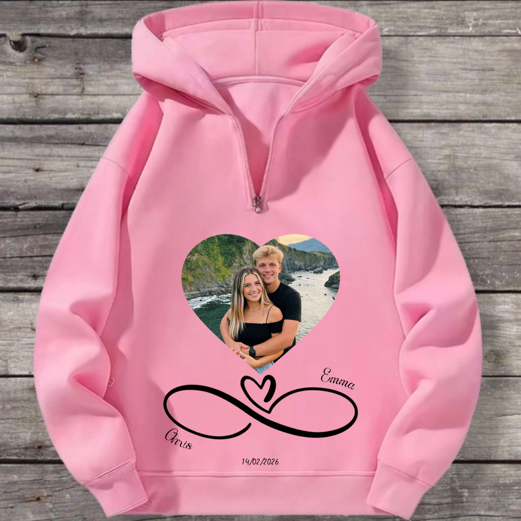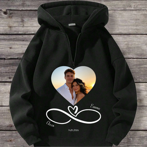 Capture the magic of your most cherished moment and wear it close to your heart, every day. Our unique hoodie features a beautiful heart-shaped cutout, where a special photo of you and your loved one is elegantly displayed. Personalized with your names and a significant date, and bound by the symbol of eternity, it’s more than a piece of clothing—it’s a wearable story of your forever. A cozy, heartfelt gift for the one you love.