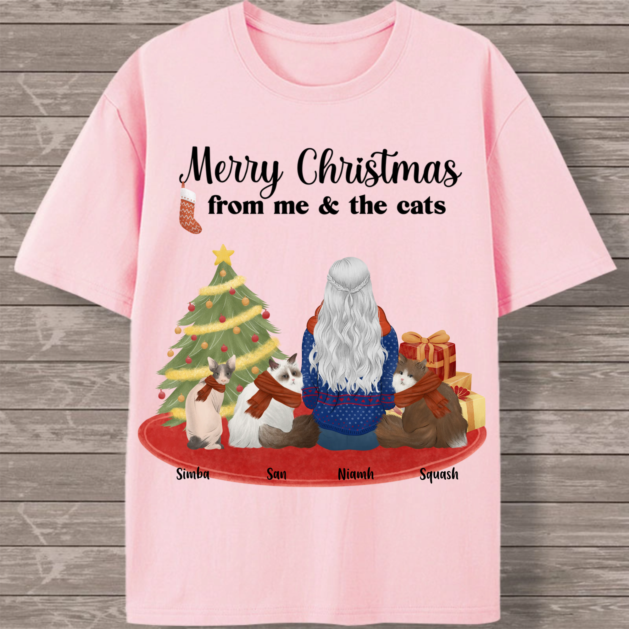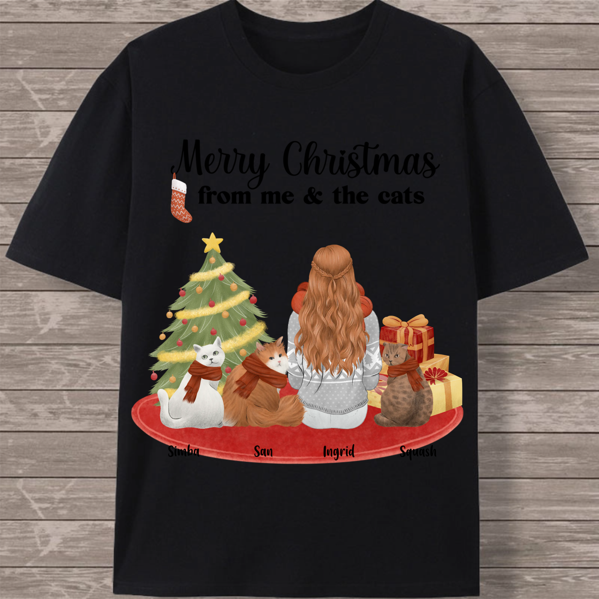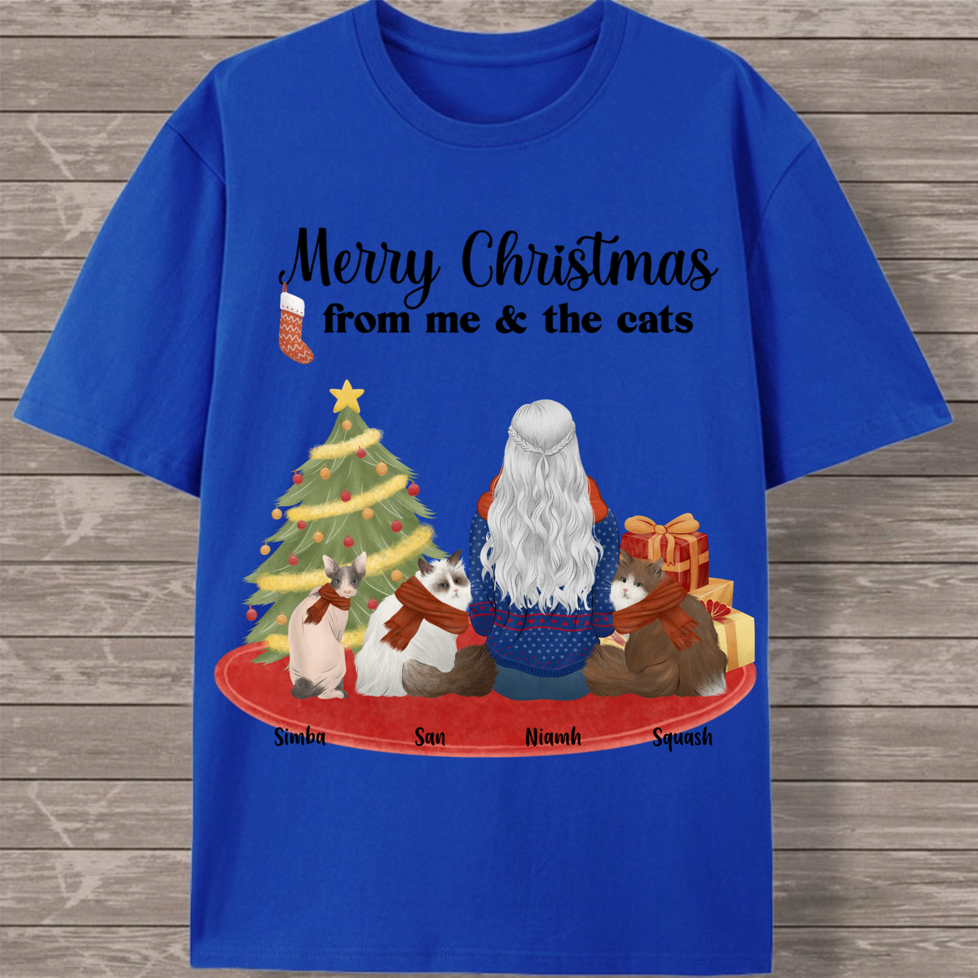 Celebrate the holiday season with your feline family in this charming customizable T-shirt! Featuring a festive back print with the cheerful message "Merry Christmas from me & the cats," this design lets you create a unique tribute to your furry companions. Personalize with your name and choose from 1-7 cats of different breeds to create the perfect holiday outfit for cat lovers.