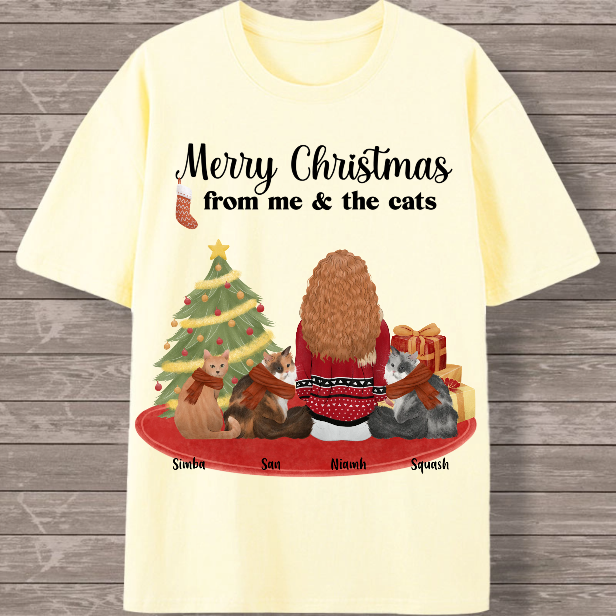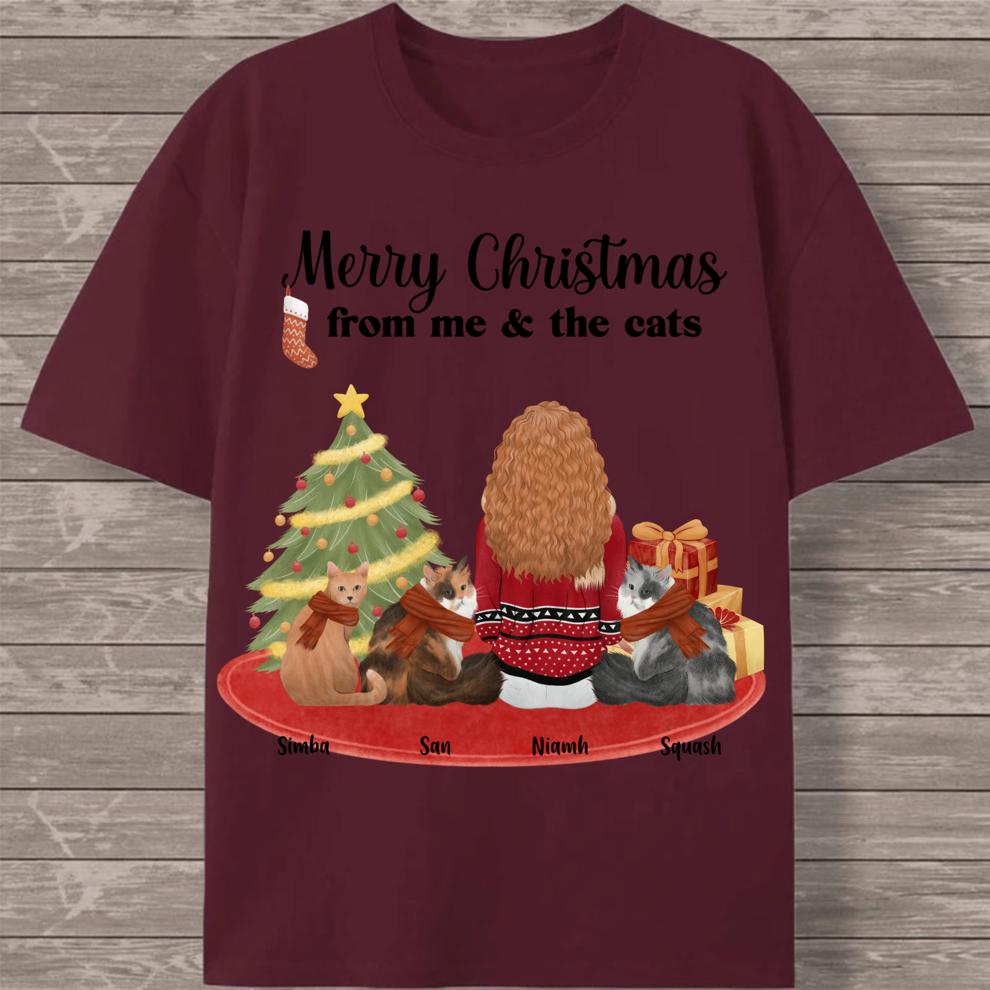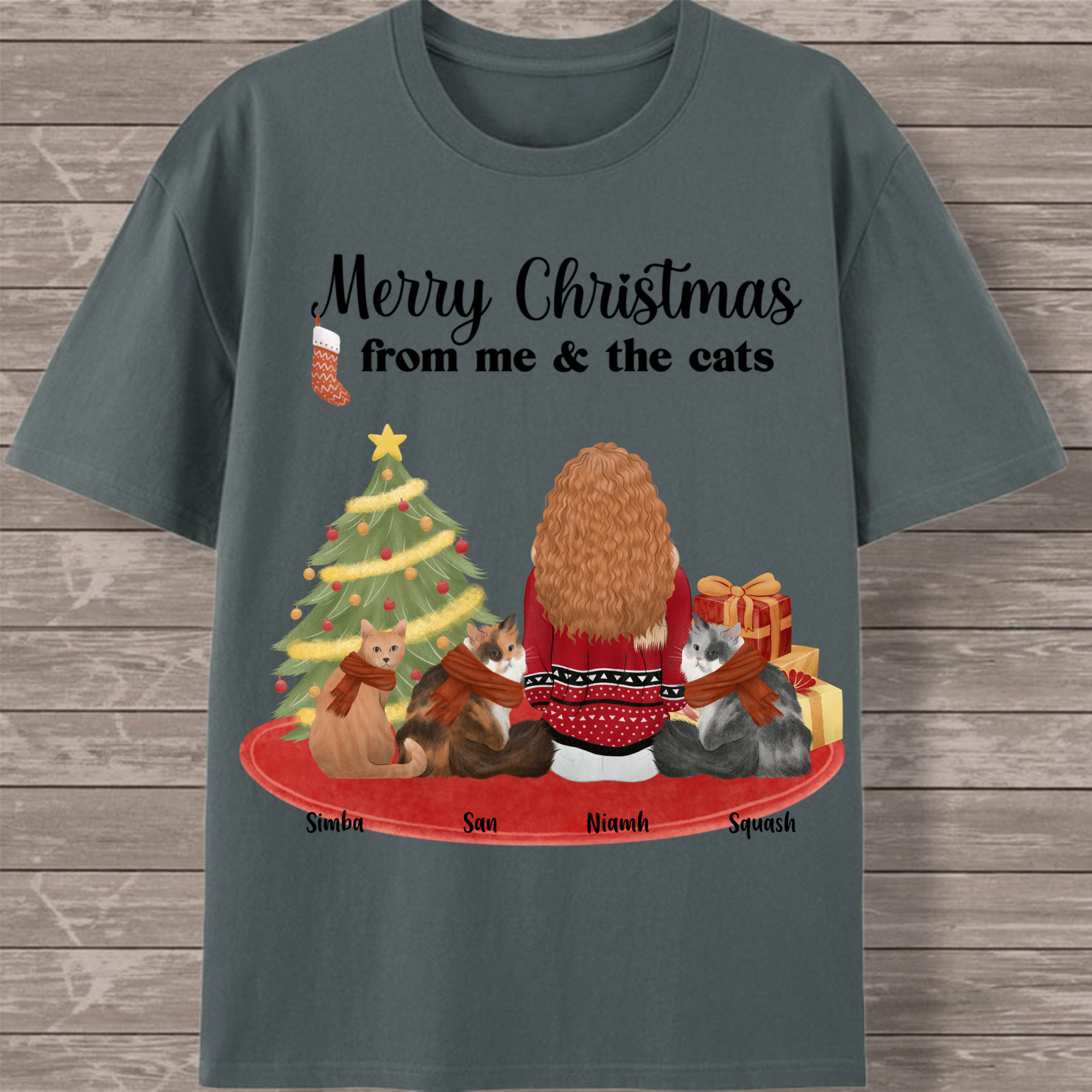 Celebrate the holiday season with your feline family in this charming customizable T-shirt! Featuring a festive back print with the cheerful message "Merry Christmas from me & the cats," this design lets you create a unique tribute to your furry companions. Personalize with your name and choose from 1-7 cats of different breeds to create the perfect holiday outfit for cat lovers.