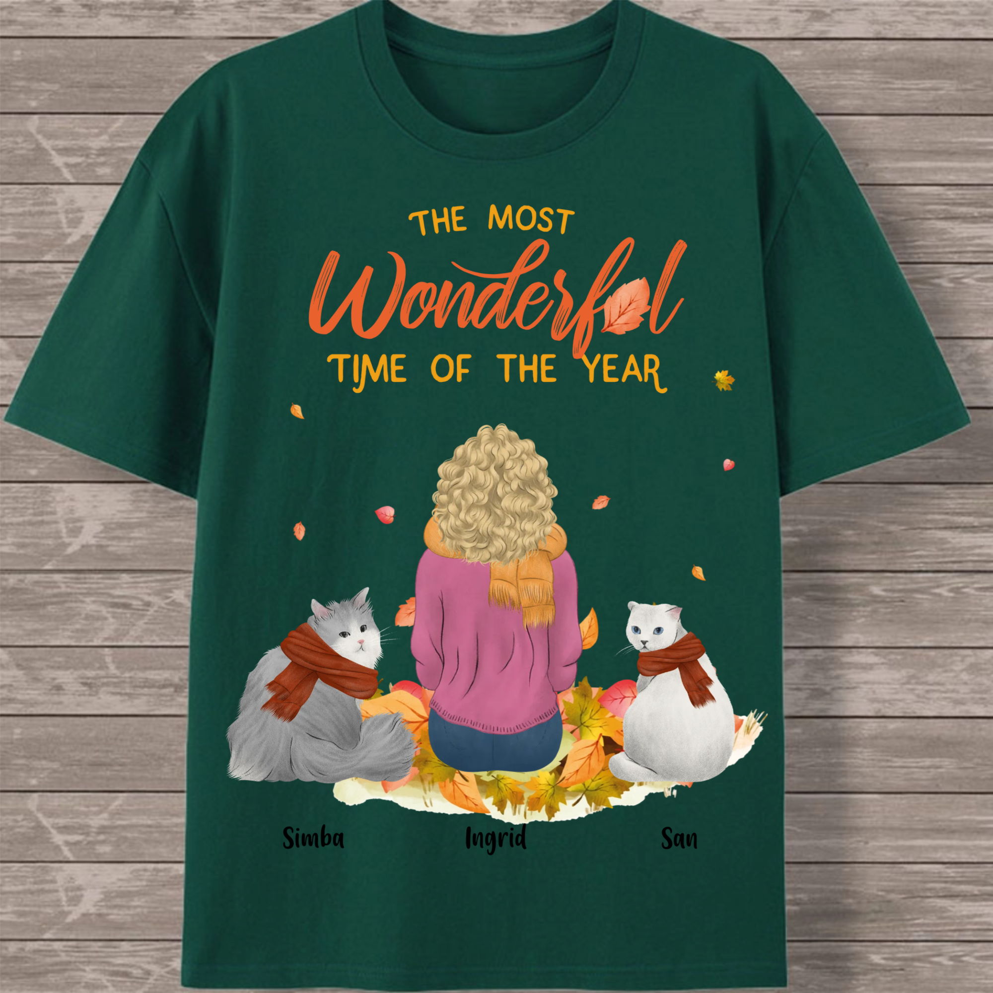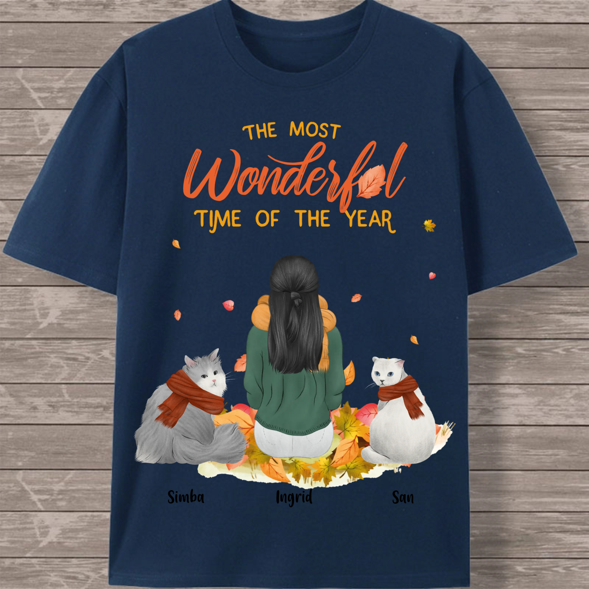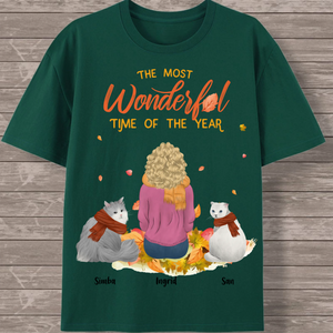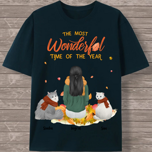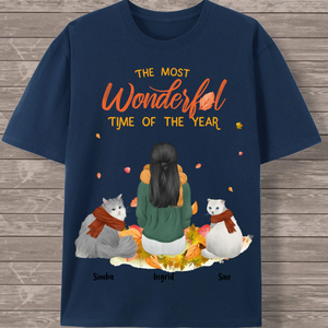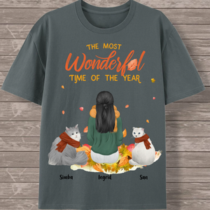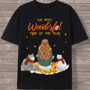 Create your perfect autumn-themed cat lover T-shirt featuring a heartwarming scene of a woman surrounded by her feline friends! This customizable design captures the cozy spirit of the season with falling leaves and the message "The Most Wonderful Time of the Year." Personalize every detail to create a unique tribute to the special bond between you and your cats.