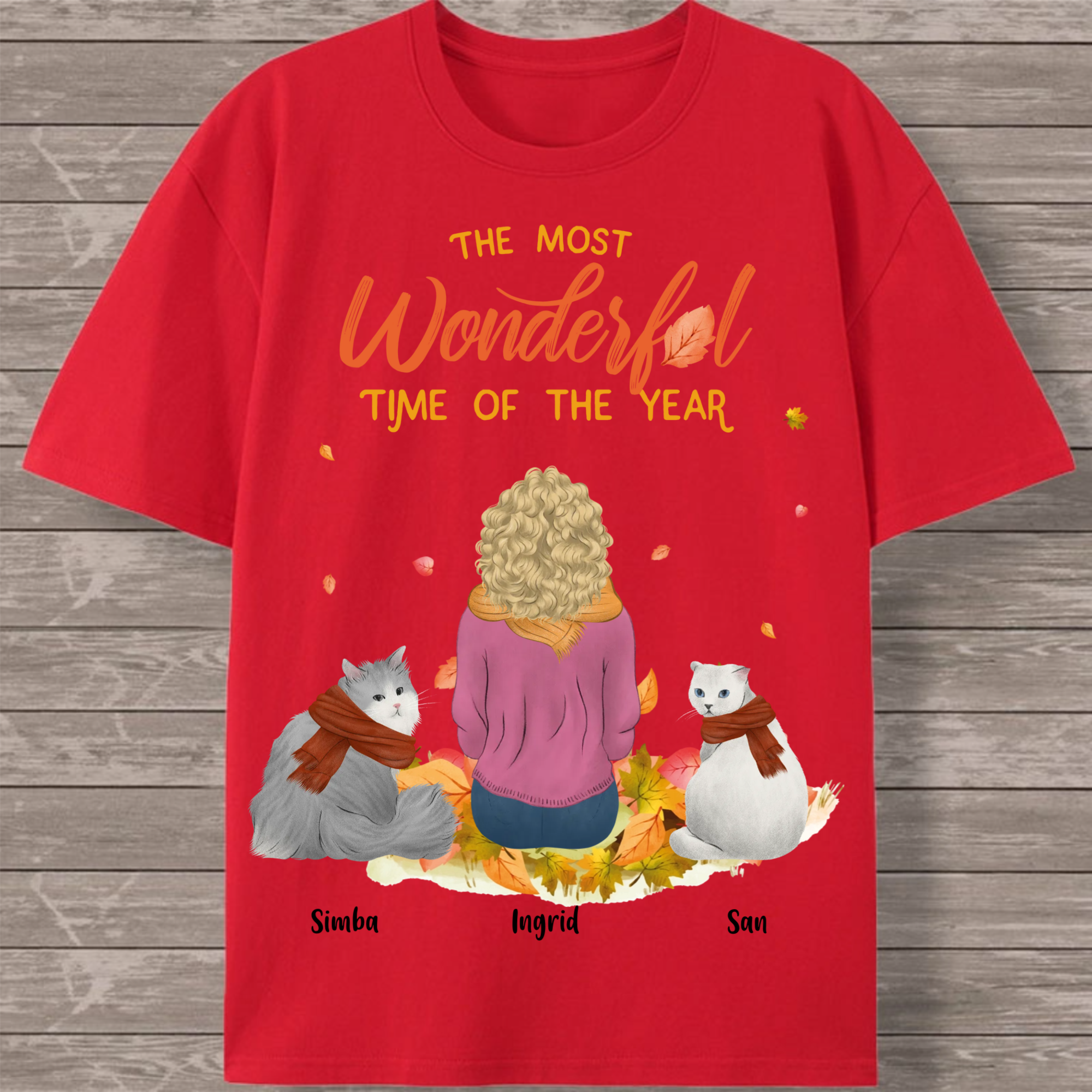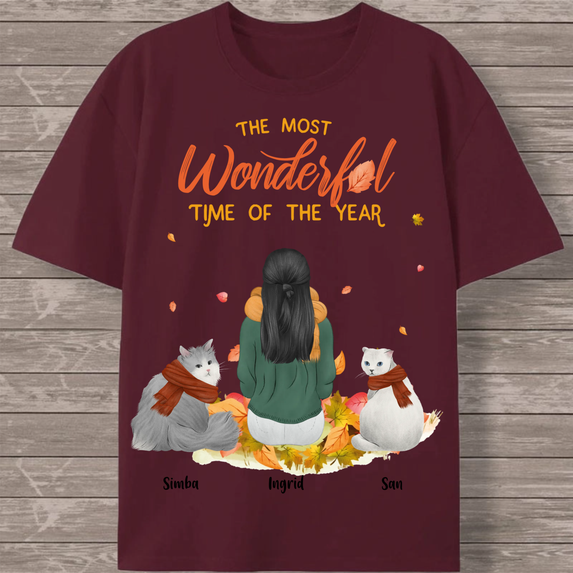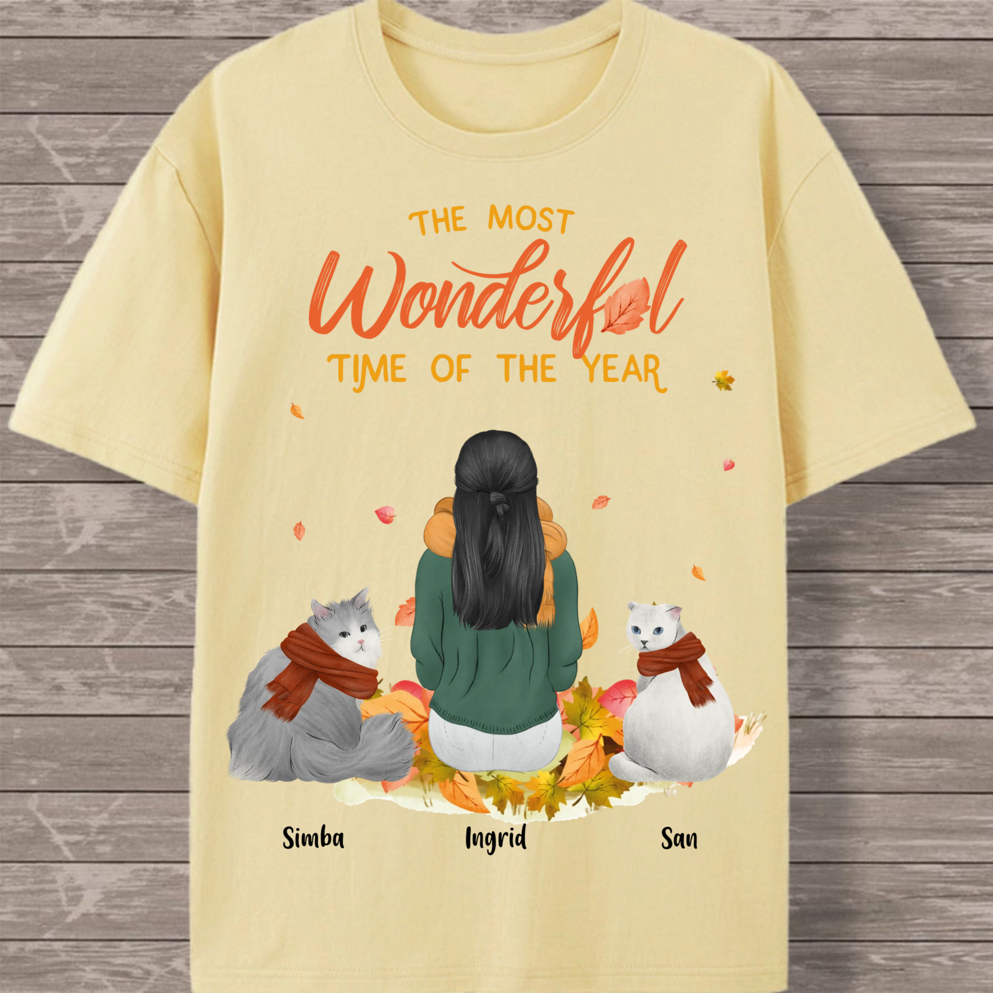 Create your perfect autumn-themed cat lover T-shirt featuring a heartwarming scene of a woman surrounded by her feline friends! This customizable design captures the cozy spirit of the season with falling leaves and the message "The Most Wonderful Time of the Year." Personalize every detail to create a unique tribute to the special bond between you and your cats.
