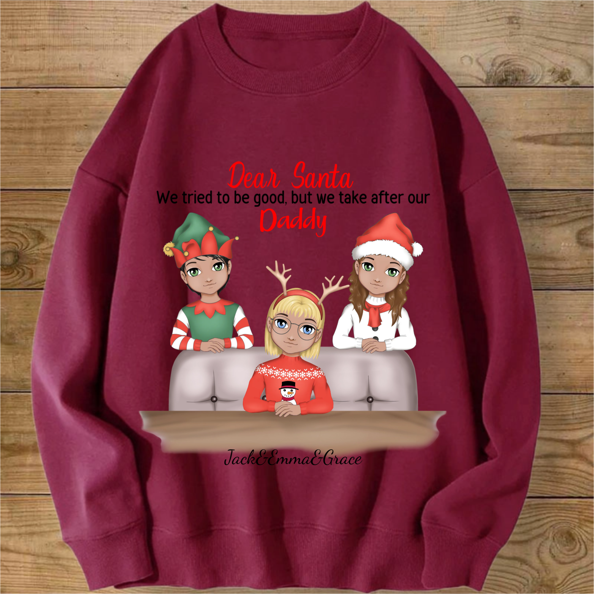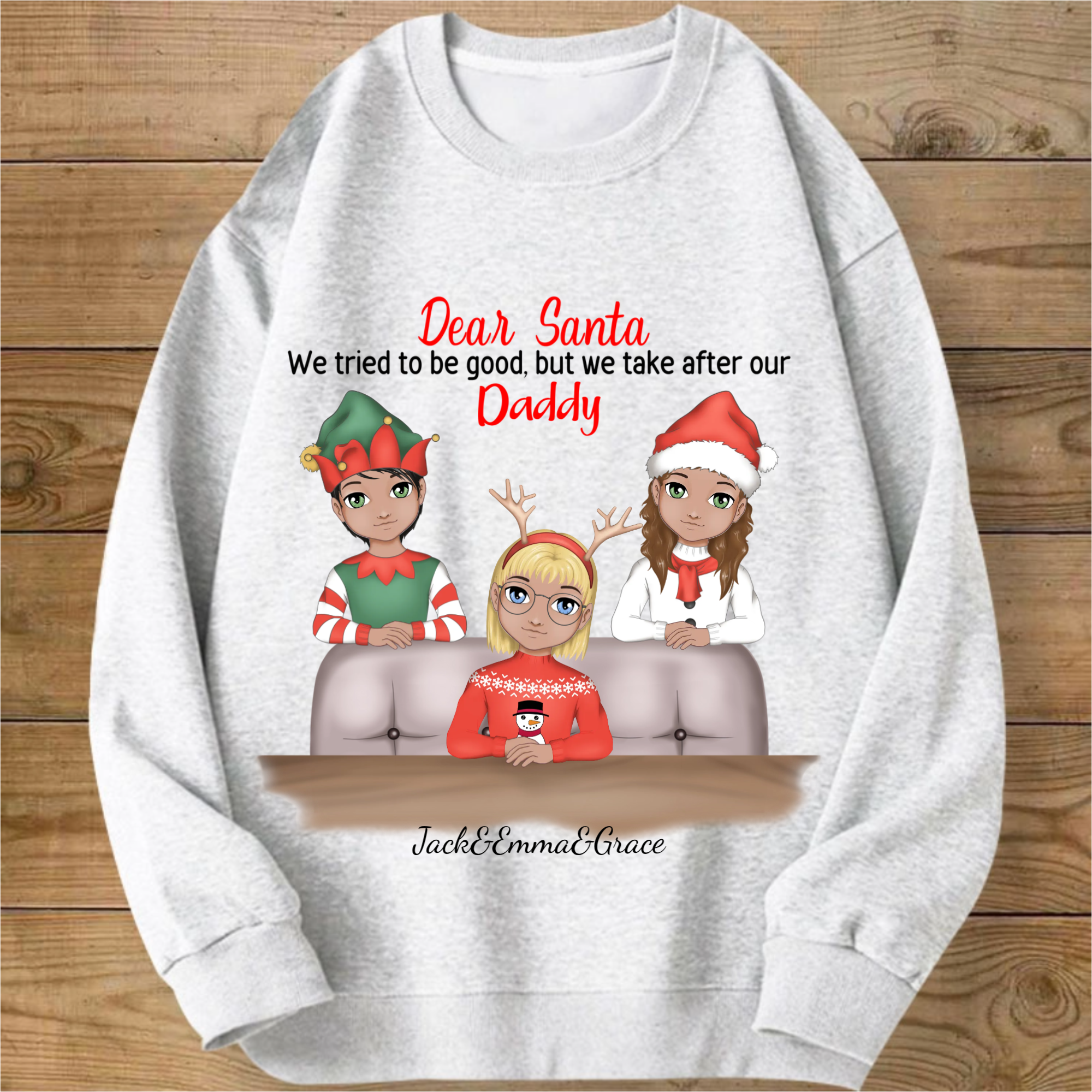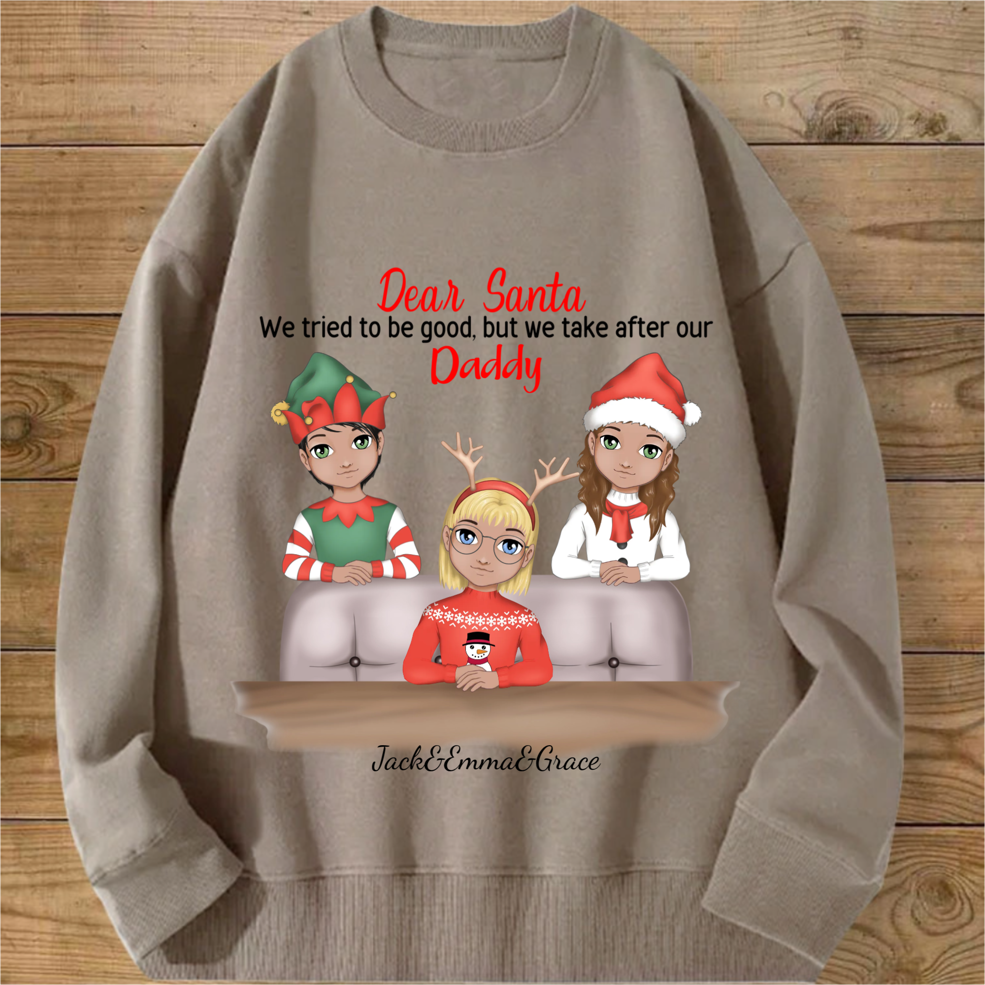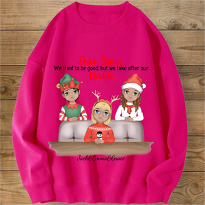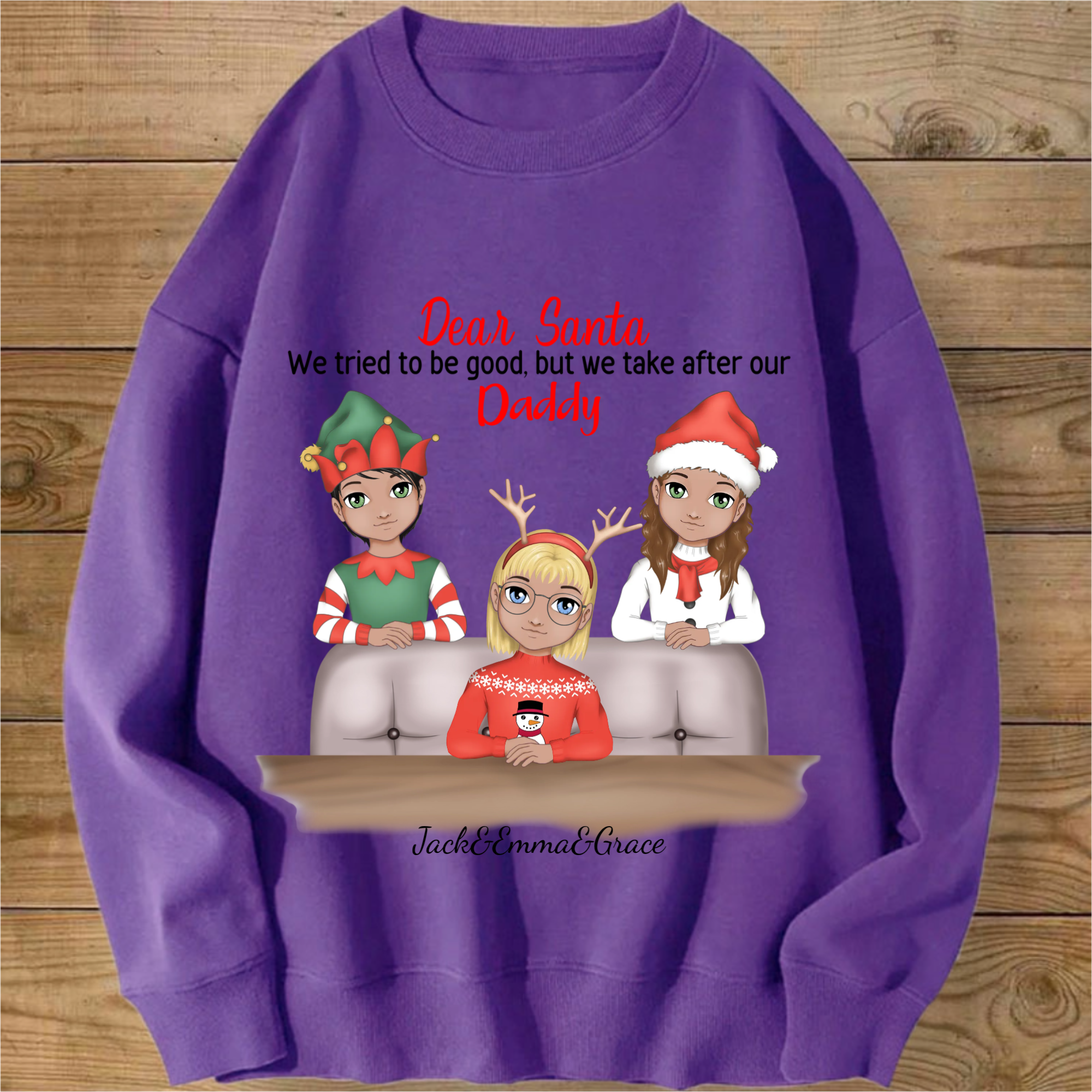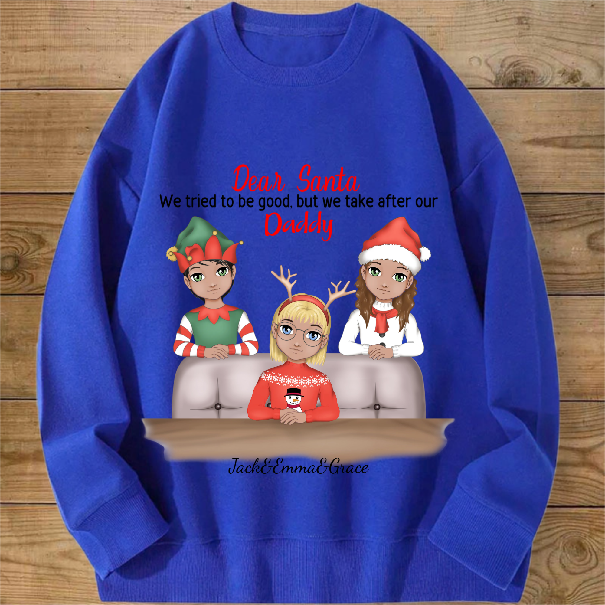Let the kids in your life charm Santa with this adorable customizable sweatshirt! Featuring the playful message "Dear Santa, we tried to be good, but we take after our [ Grandpa/Aunt/Uncle/Mommy ]," this festive design puts a humorous spin on holiday mischief. Perfect for creating a unique gift that celebrates the special bond between children and their favorite relatives.