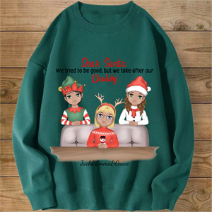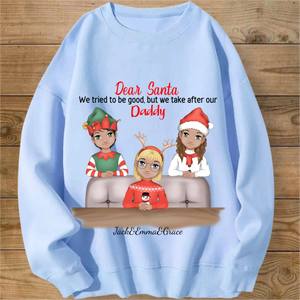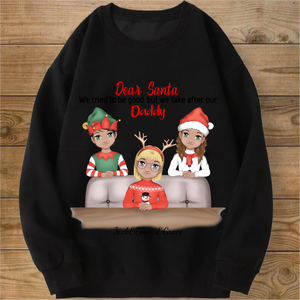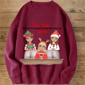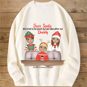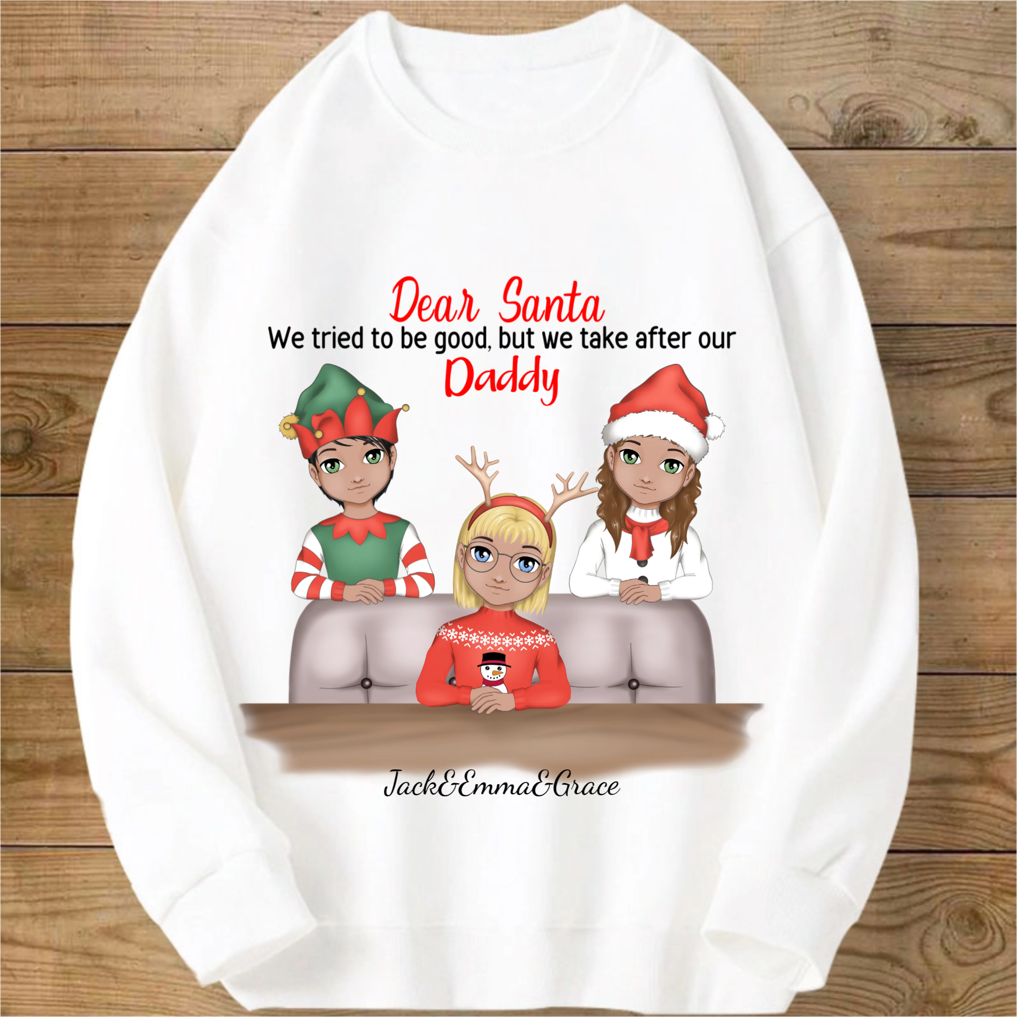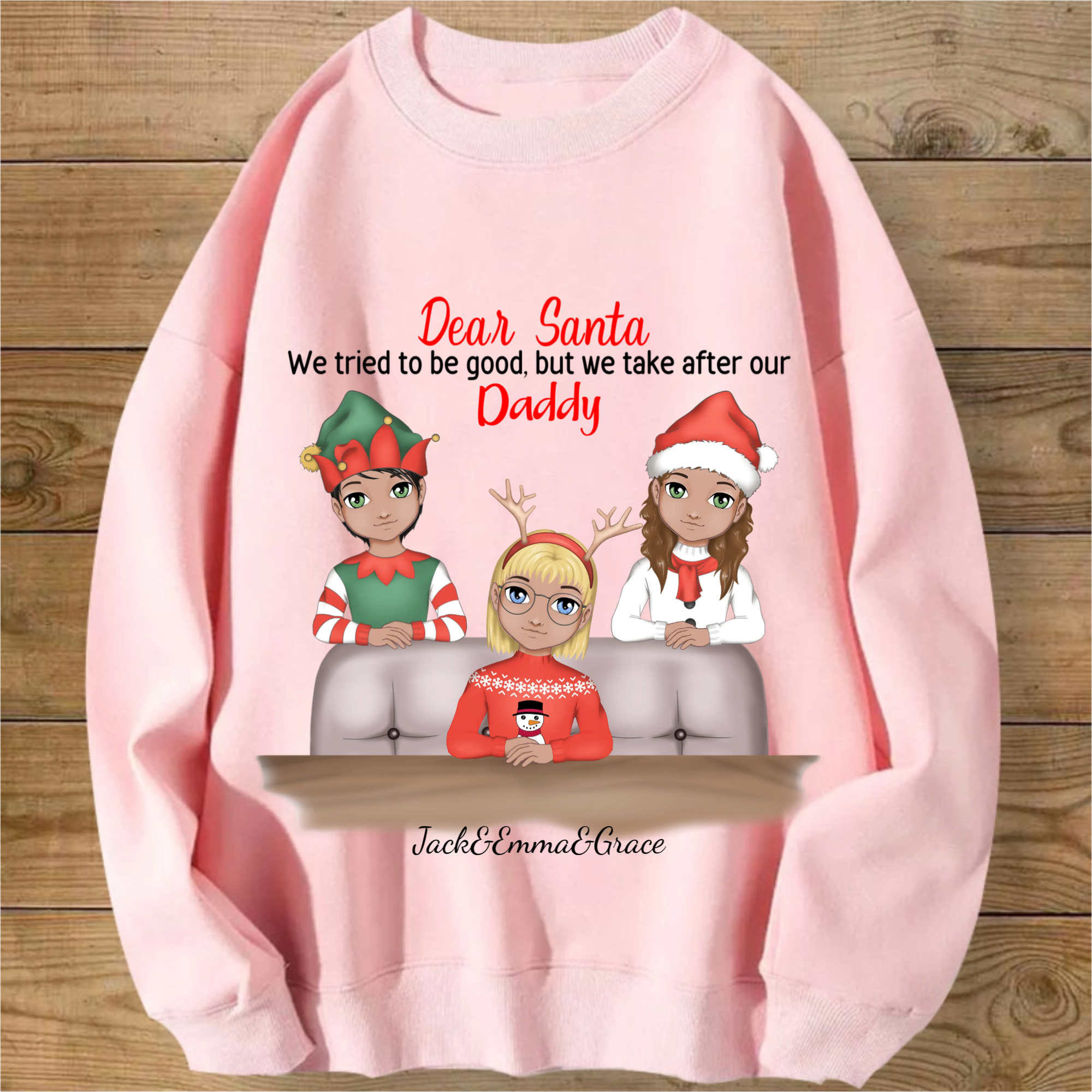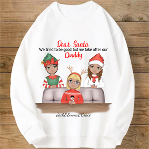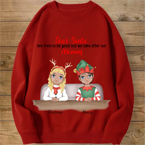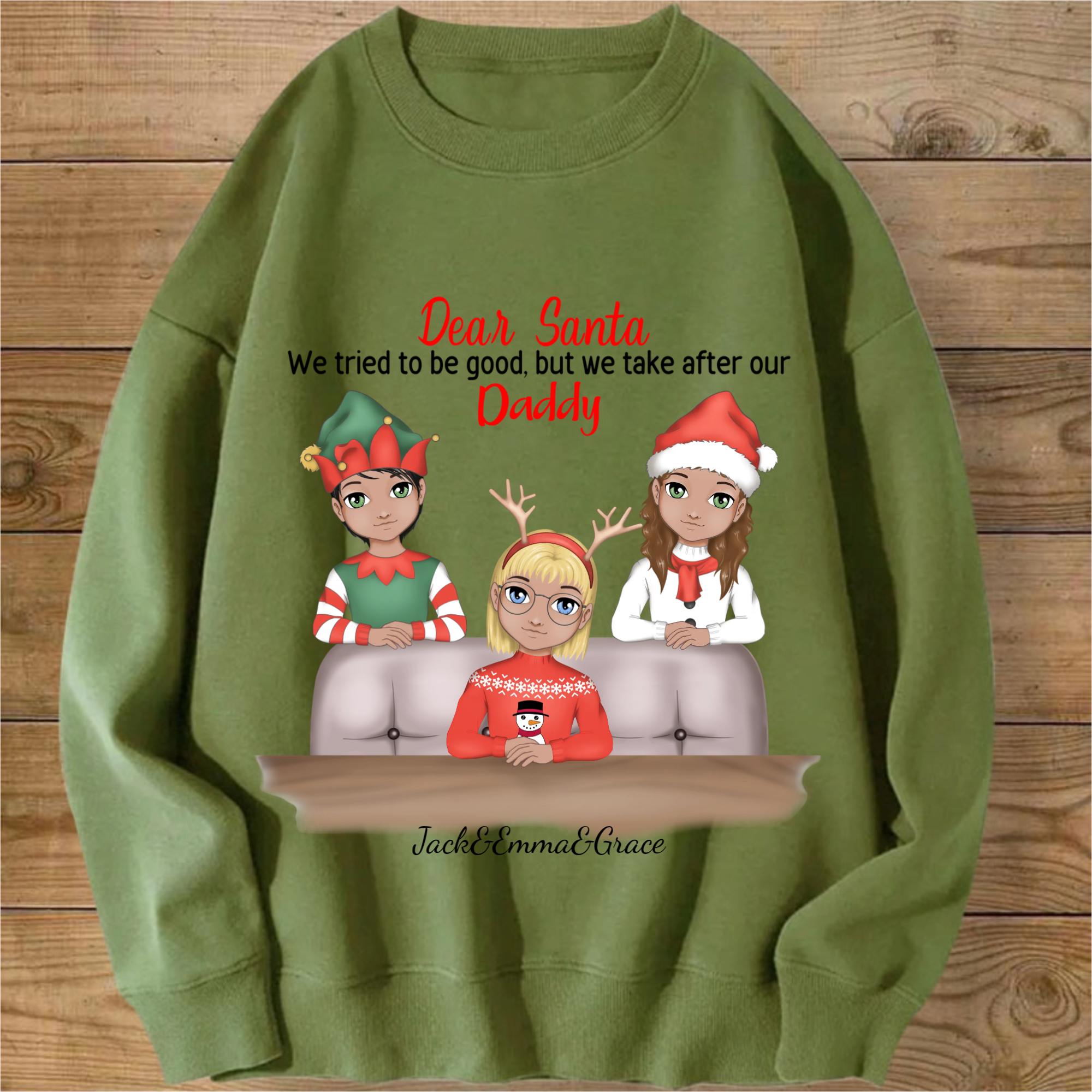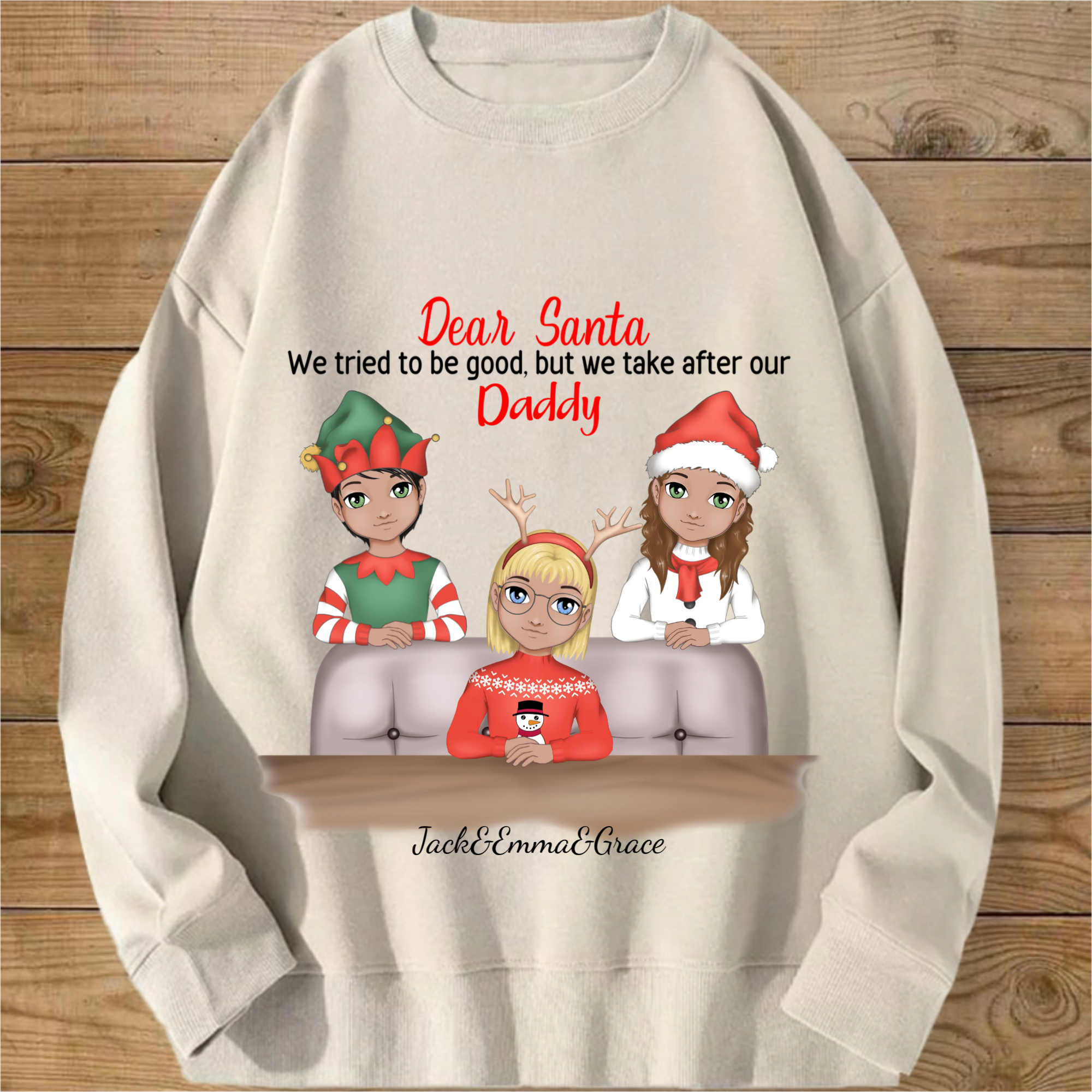 Let the kids in your life charm Santa with this adorable customizable sweatshirt! Featuring the playful message "Dear Santa, we tried to be good, but we take after our [ Grandpa/Aunt/Uncle/Mommy ]," this festive design puts a humorous spin on holiday mischief. Perfect for creating a unique gift that celebrates the special bond between children and their favorite relatives.
