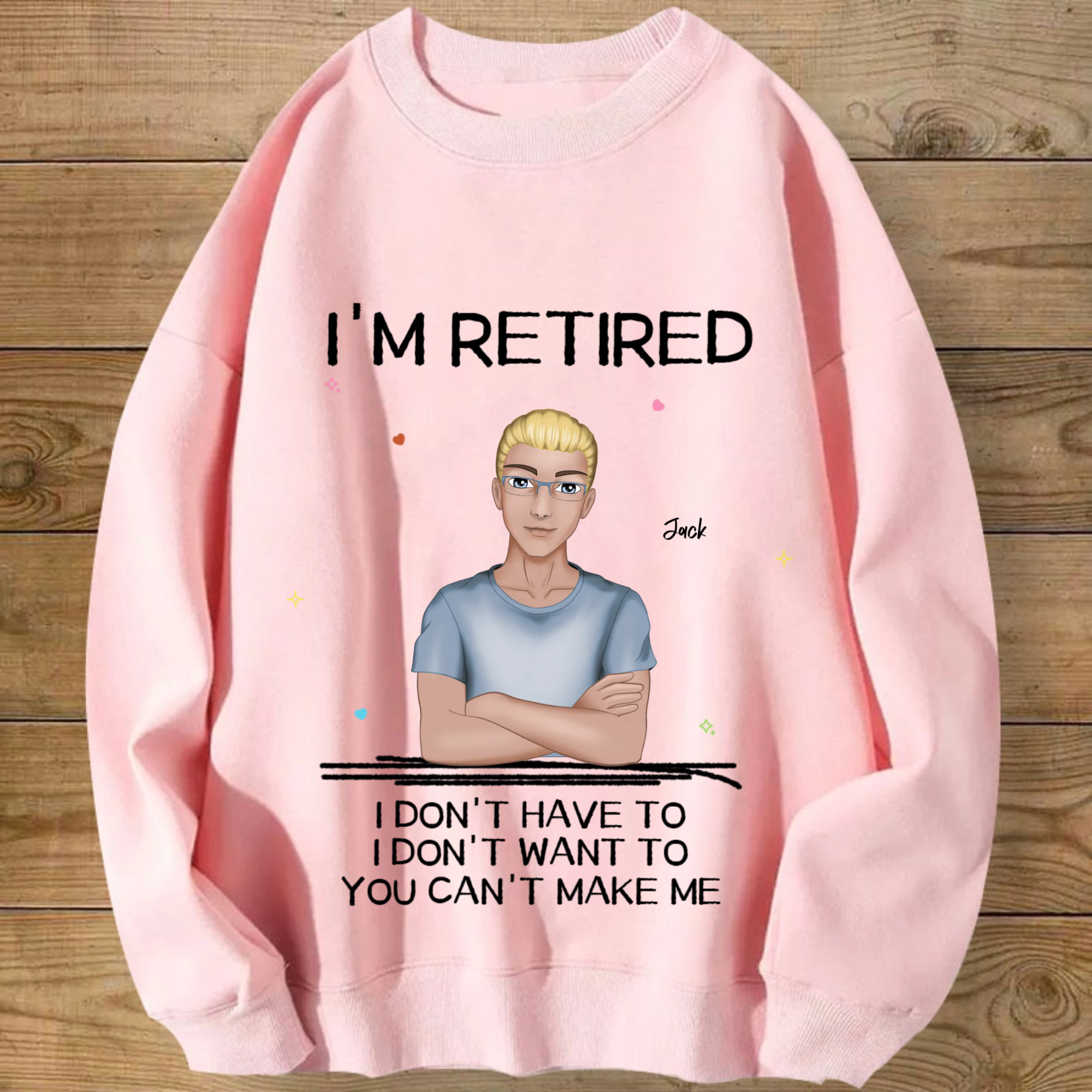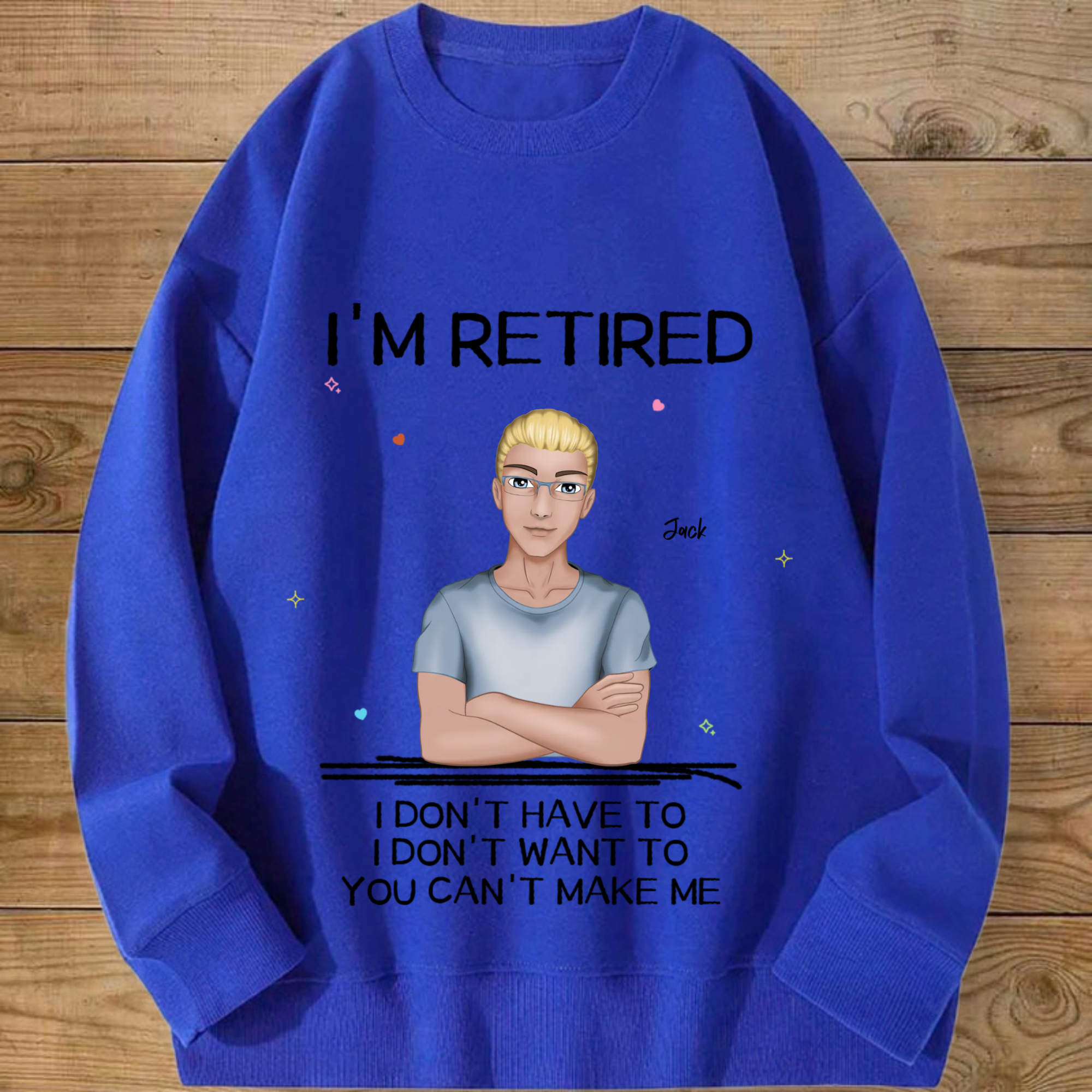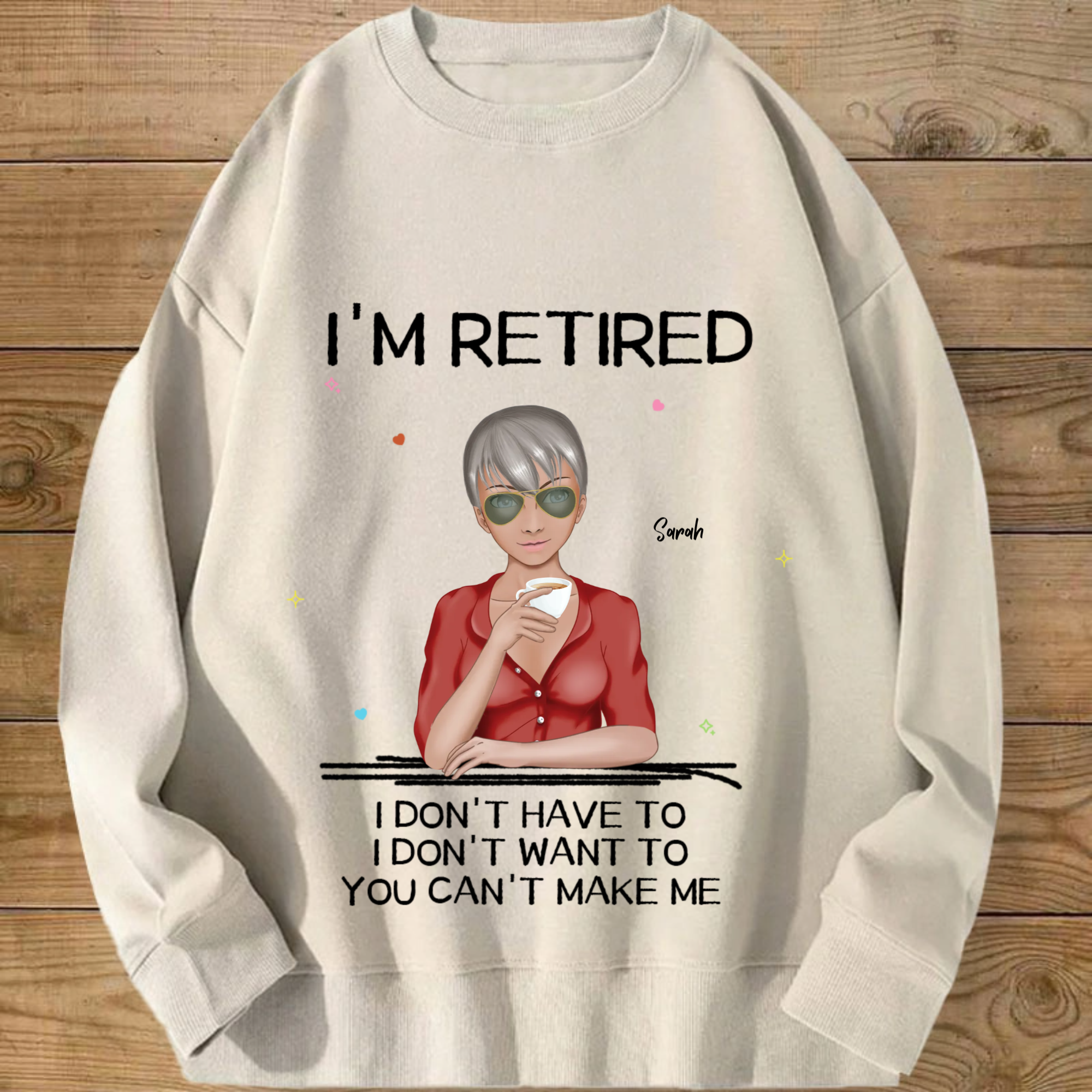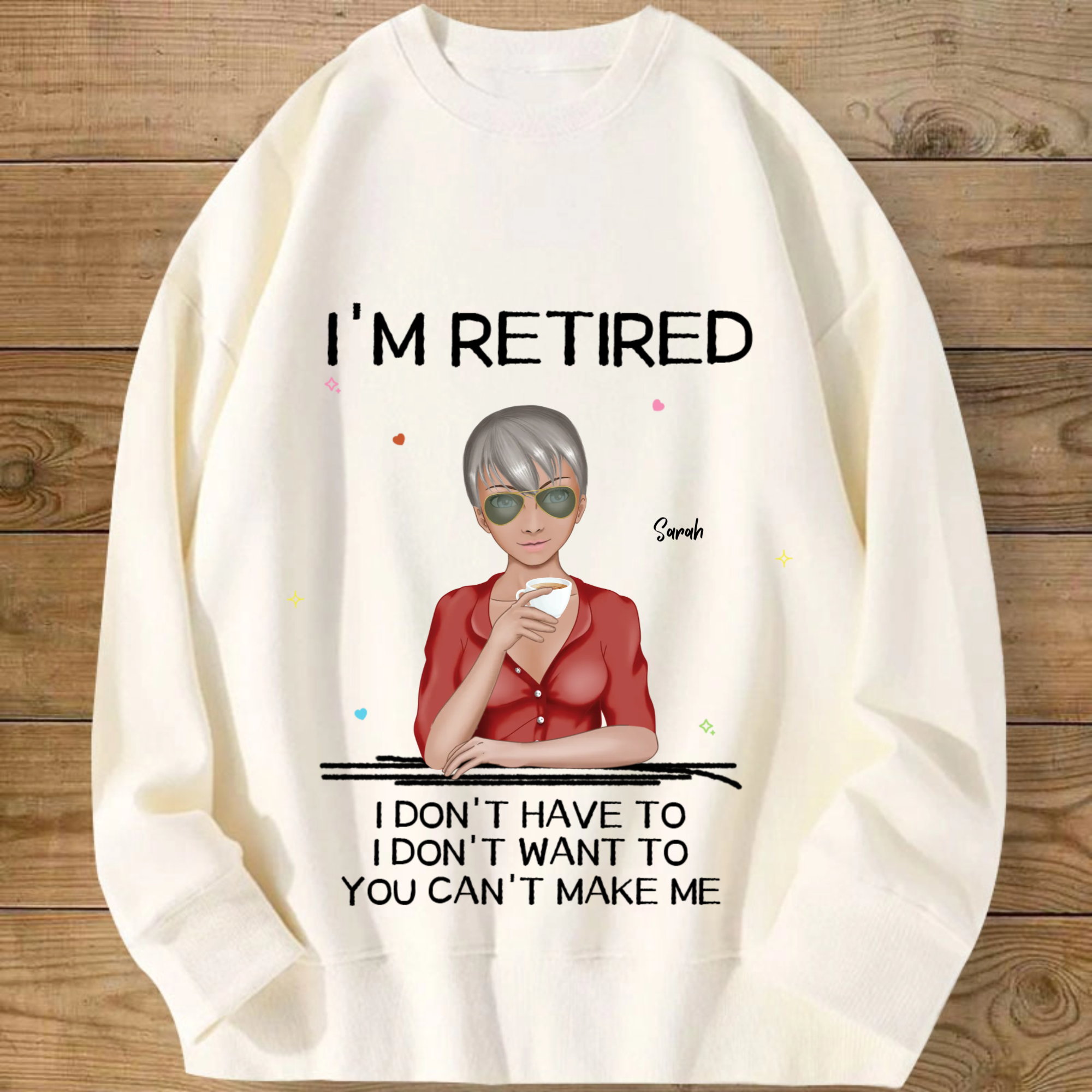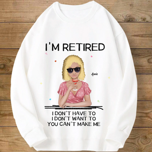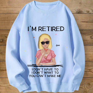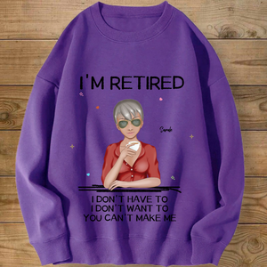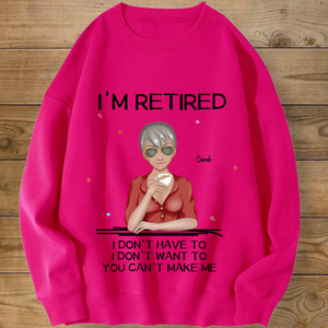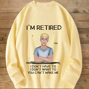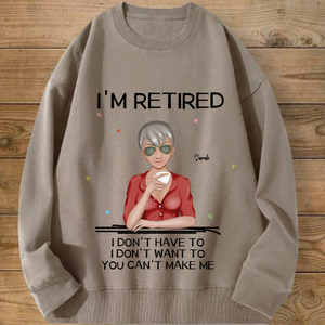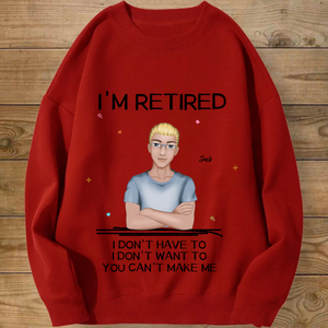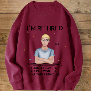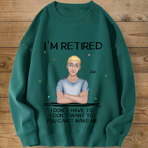 Introducing the ultimate "I'M RETIRED" personalized sweatshirt! This isn’t just apparel; it’s a declaration of freedom and a celebration of a new chapter. Create a custom cartoon avatar that looks just like you or the retiree you’re honoring. Choose the hairstyle, skin tone, and outfit, and add a personal name. Paired with the iconic, humorous mantra "I DON'T HAVE TO, I DON'T WANT TO, YOU CAN'T MAKE ME", it’s the perfect, cozy gift for anyone who’s earned their rest and relaxation.