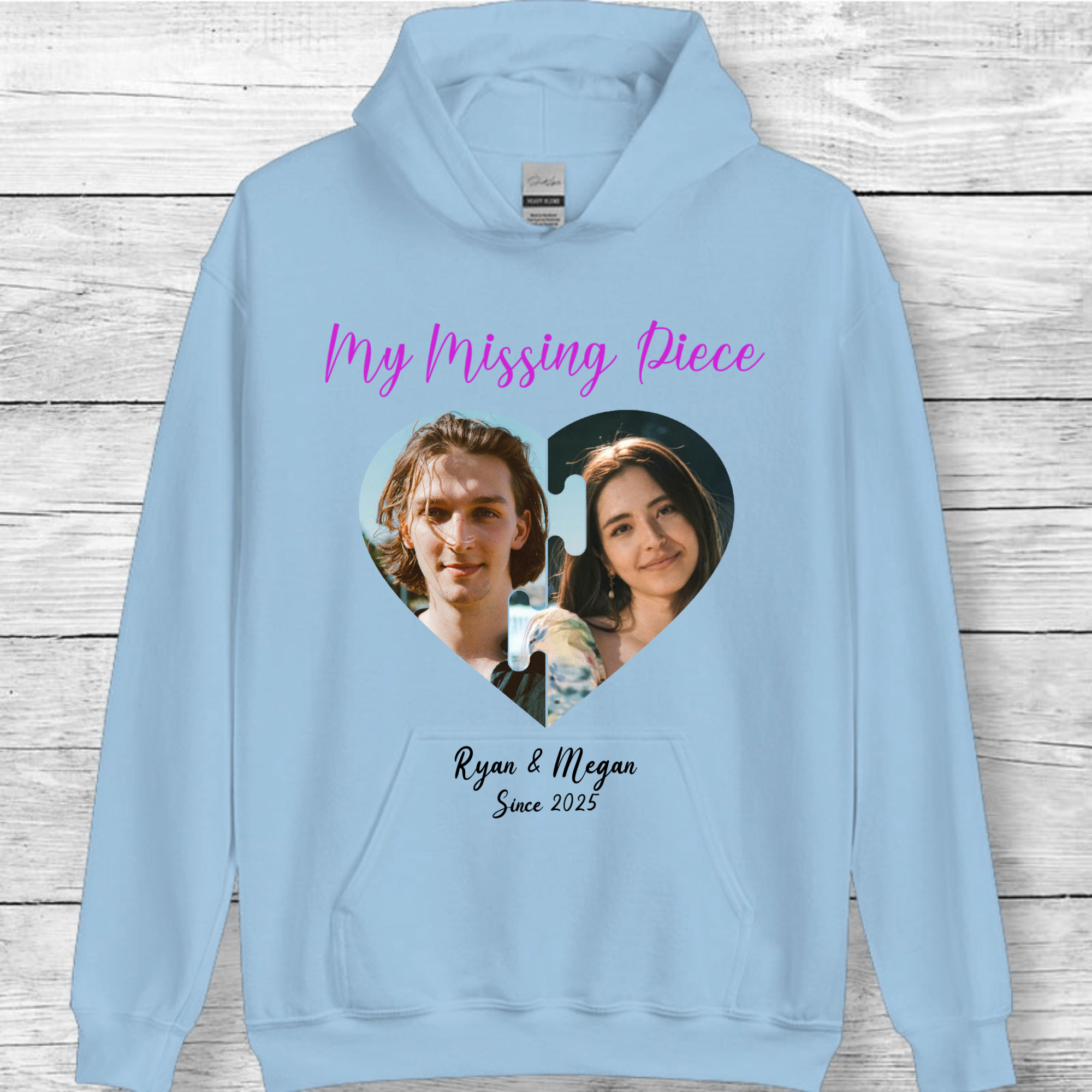 Celebrate the one who completes your story with this adorable "My Missing Piece" photo hoodie! Featuring a creative puzzle heart design where your two photos fit perfectly together, this cozy hoodie symbolizes how you and your loved one were meant to connect. Just like the examples showing couples like Ryan & Megan or Beau & Stella, you can create your own love story wearable that's perfect for casual dates, cozy nights, and making memories together.