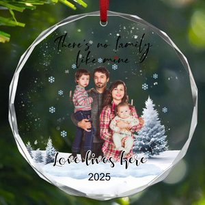 Capture the warmth of family love with our "There's No Family Like Mine" crystal ornament. This beautifully crafted keepsake features a circular design with a custom family photo set against a charming winter scene with snow-covered trees. Personalize it with your family names and the year to create a timeless holiday treasure that celebrates what makes your family special. Perfect for hanging on your Christmas tree or displaying year-round as a reminder of your unique bond.