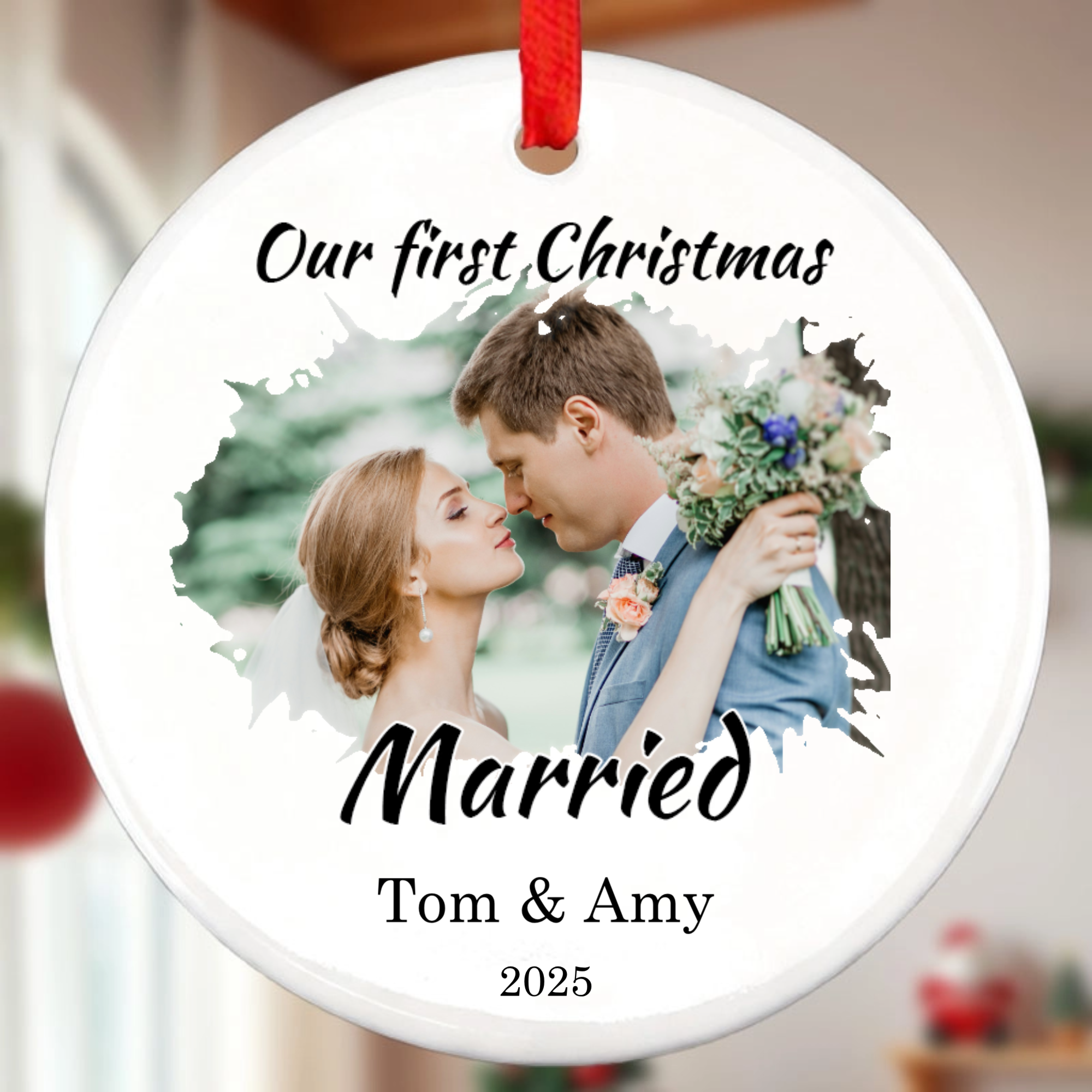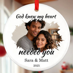 Capture life's most precious memories with our personalized Round Ceramic Ornament. This elegant white ornament features a crisp circular design that beautifully displays your favorite photo, accompanied by custom text, names, and the year. Whether it's your first Christmas married, a celebration in your new home, or simply honoring family bonds, this keepsake turns fleeting moments into timeless holiday treasures. The classic red ribbon adds the perfect festive touch for tree hanging.