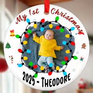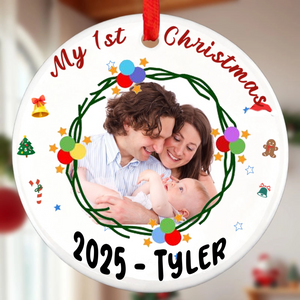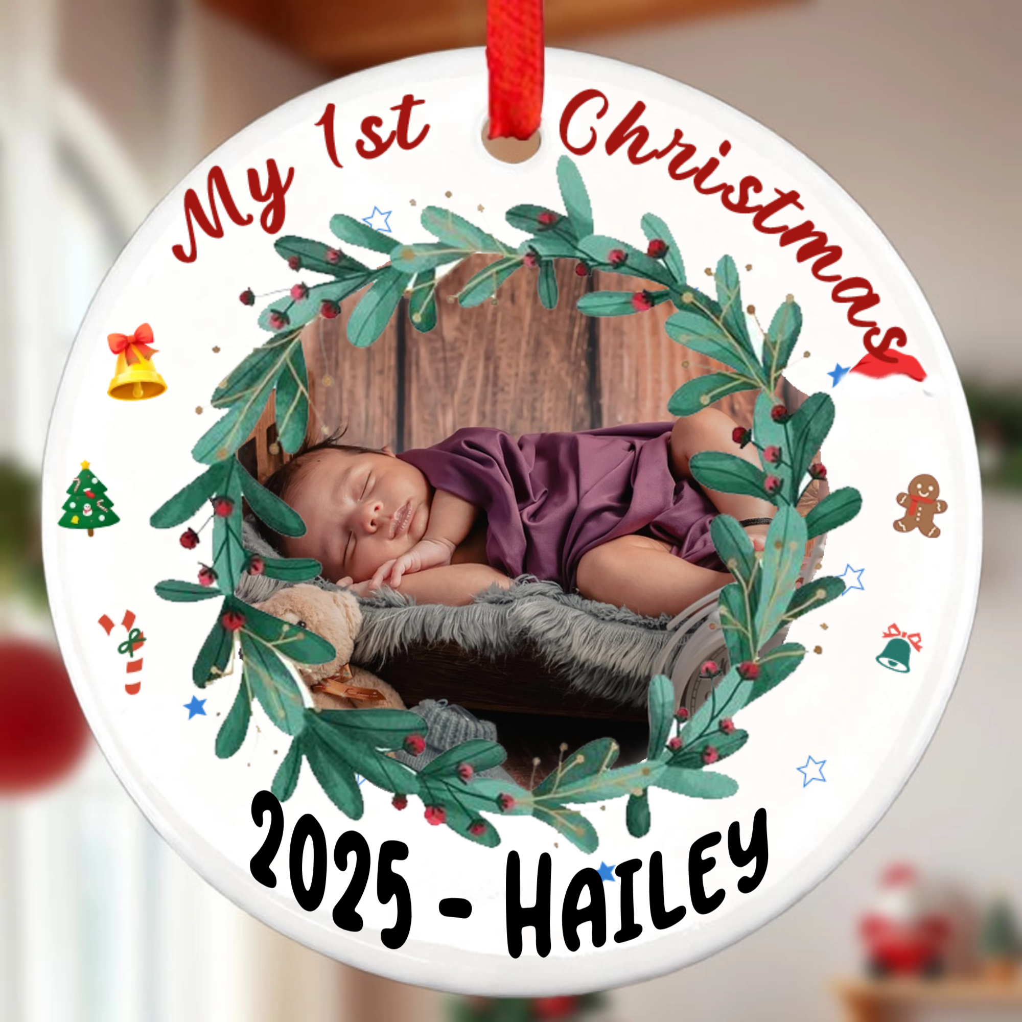 Capture the magic of your baby's first holiday season with our "My 1st Christmas" ceramic ornament. This beautiful round ornament features a green wreath design that frames your baby's photo, creating a timeless keepsake you'll treasure for years to come. Personalize it with your baby's name and the year to commemorate this special milestone. The elegant red ribbon makes it perfect for hanging on your Christmas tree, where it will become a beloved part of your family's holiday traditions.