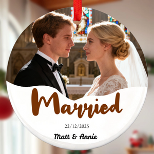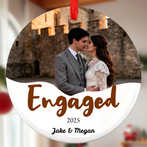 Capture life's most romantic moments with our personalized Round Ceramic Photo Ornament. This elegant white ceramic ornament beautifully displays your engagement or wedding photo, accompanied by custom text like "Engaged" or "Married," the special date, and your names. preserve your unique love story in a timeless keepsake perfect for Christmas trees or home decor.