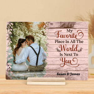 This romantic acrylic plaque is engraved with the heartfelt quote, "My favorite place in all the world is next to you."More than a poster, it's a durable and elegant keepsake that can be fully customized with your favorite photo, names, and even a special date to tell your unique love story. Create a deeply meaningful gift that celebrates your journey together.