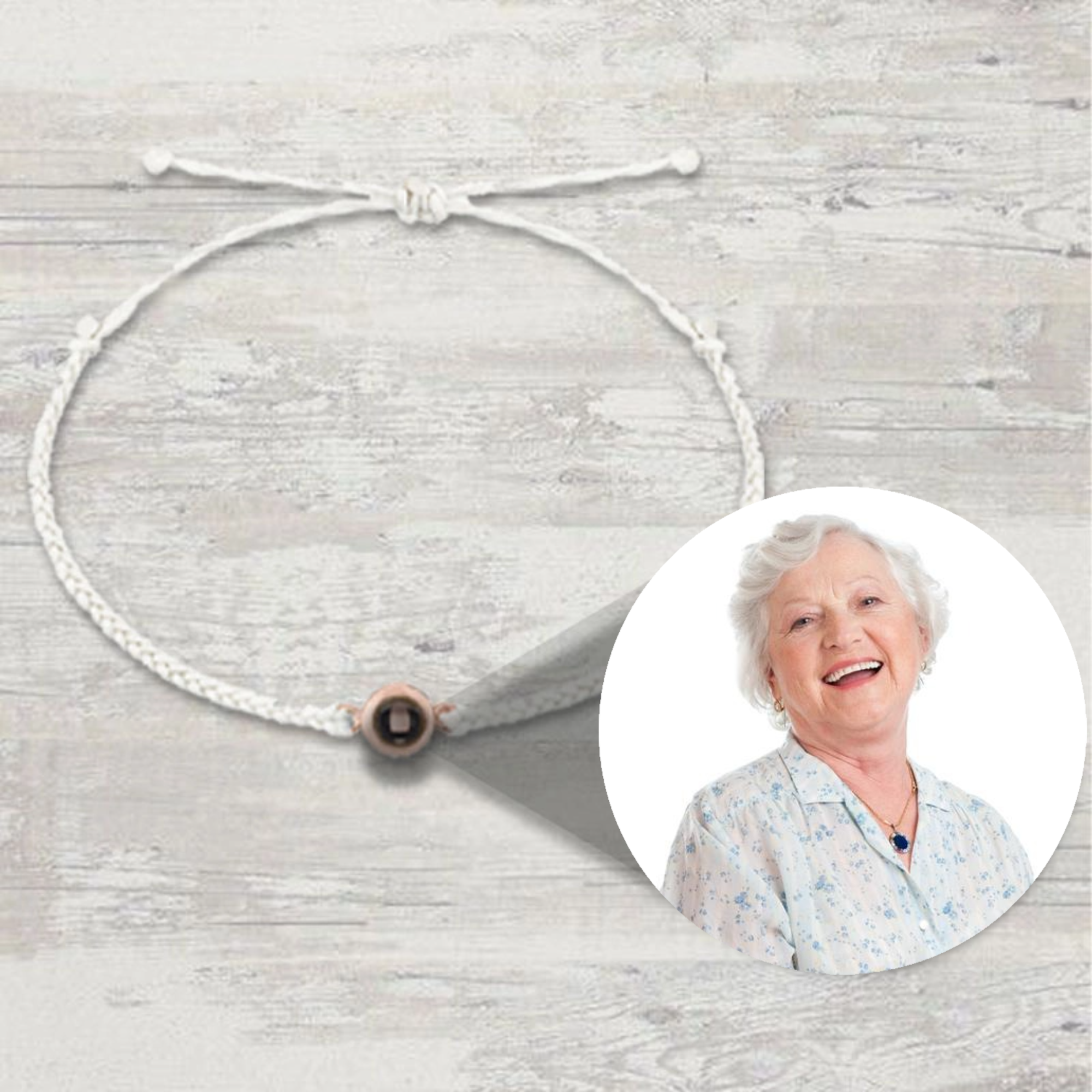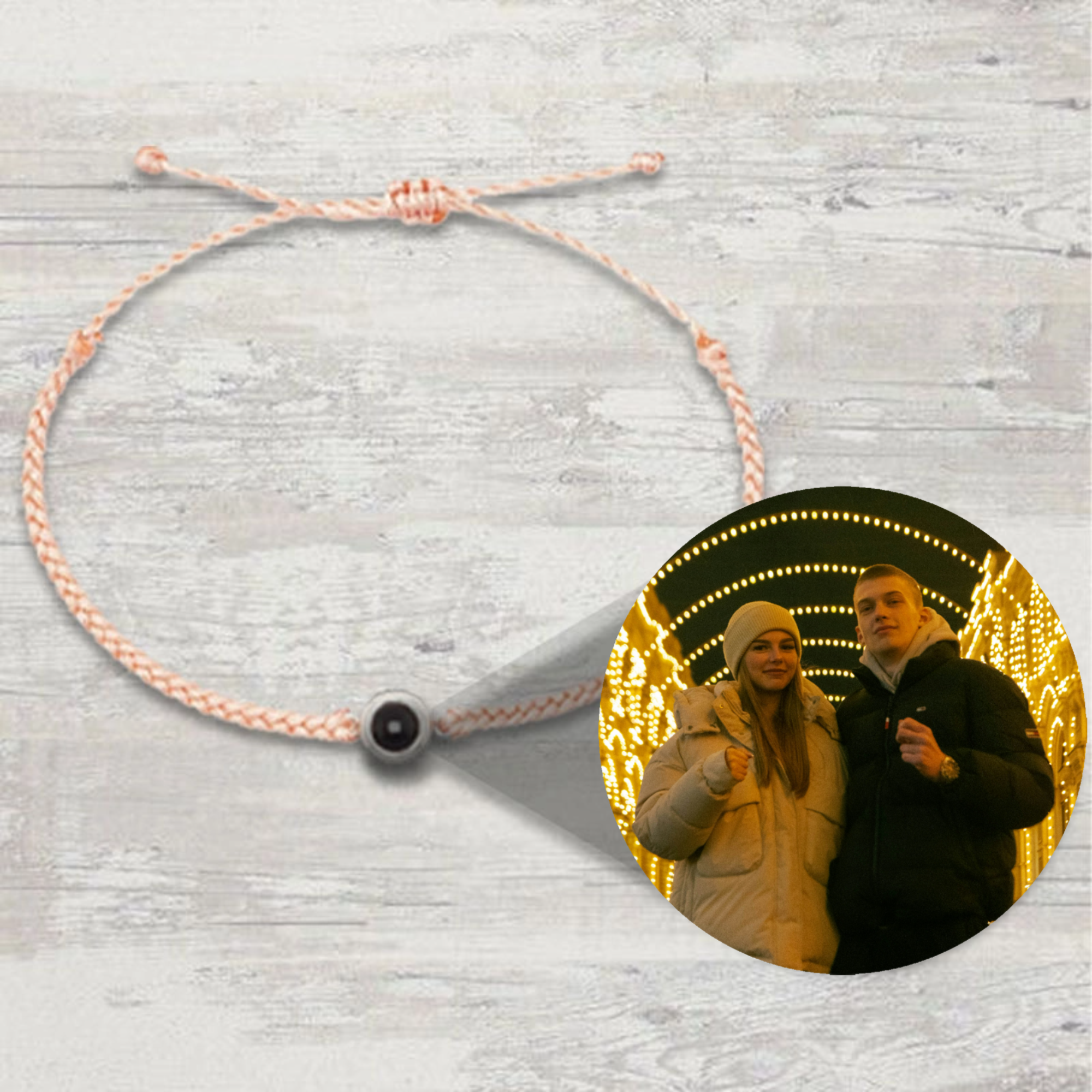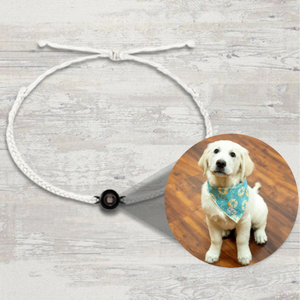 This innovative bracelet features a discreet nano-projection compartment that reveals a special photo when viewed closely. The simple braided design holds a small round viewer where you can insert your own image, creating a personal wearable keepsake.