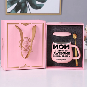 Create a heartfelt surprise for Mom with our complete Mother‘s Day Mug Gift Set. This elegant pink ceramic set comes ready for personalization with your special message, just like "MOM I turned out AWESOME because of you" or "A TITLE JUST ABOVE QUEEN." Complete with matching lid, golden spoon, and luxury gift box, it’s the perfect way to show your appreciation with a personalized touch she‘ll treasure every day.