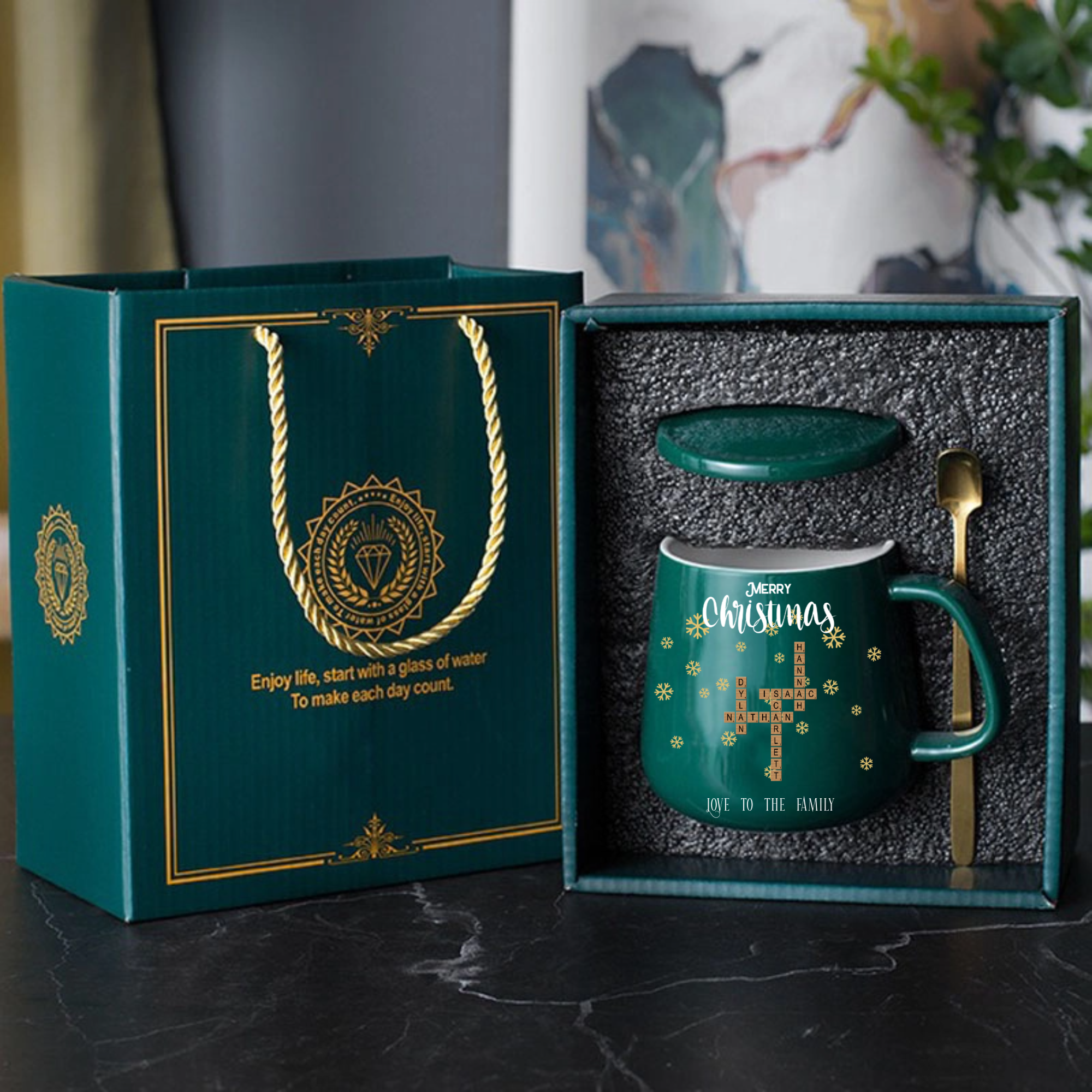 Make this holiday season unforgettable with our exclusive Merry Christmas Crossword Mug Gift Set! This beautifully curated set features a premium green ceramic mug where you can personalize a unique crossword puzzle using your family members' names. Complete with a matching lid, golden spoon, and elegant gift box, it's the perfect way to celebrate your loved ones in a fun, interactive design. Add your own special message and choose a background to make it truly one-of-a-kind!