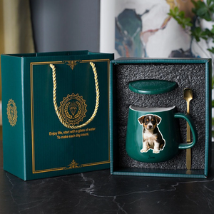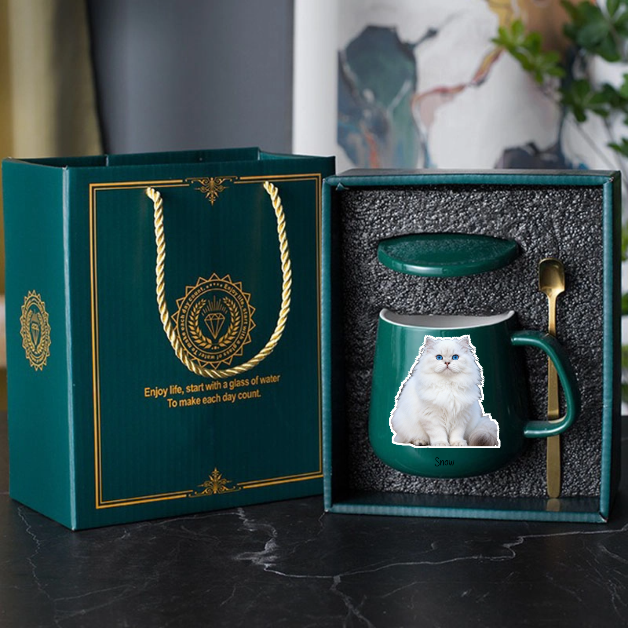 Create the perfect tribute to your beloved pet with our personalized Pet Photo Mug Gift Set. This elegant hunter green ceramic set features a custom photo of your cat or dog, accompanied by their special name. Complete with a matching lid, golden spoon, and beautiful gift packaging, it's the ideal way to keep your pet's memory close during your daily coffee ritual or as a heartfelt gift for fellow pet lovers.