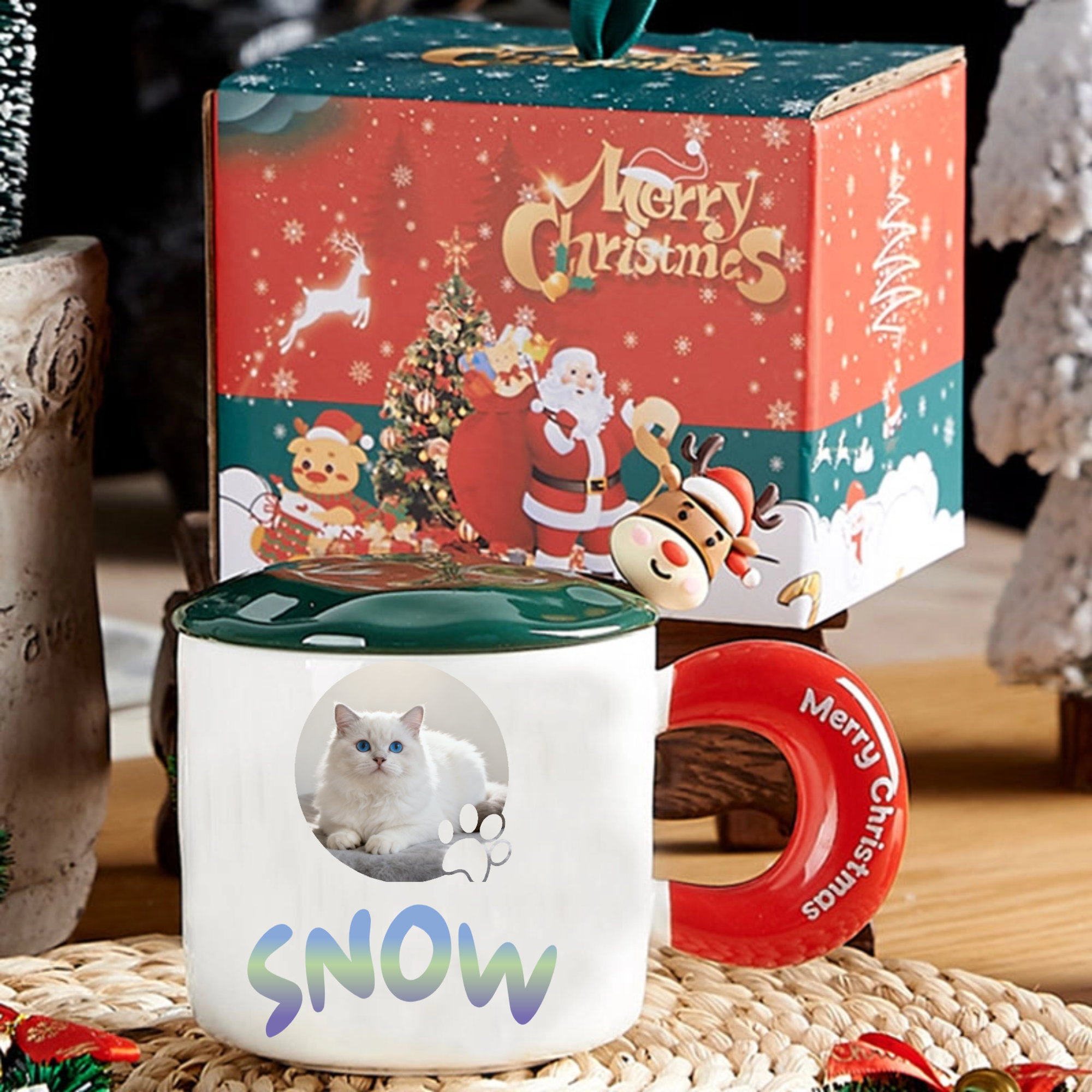 Make this holiday season extra special with our personalized Pet Photo Christmas Mug Gift Set! This complete gift package features a premium white ceramic mug where you can add your pet's photo and name, creating a unique tribute to your beloved companion. With its festive "Merry Christmas" handle, matching lid, golden spoon, and beautiful holiday packaging, it's the perfect way to include your pet in the Christmas celebrations while enjoying your favorite warm drinks.