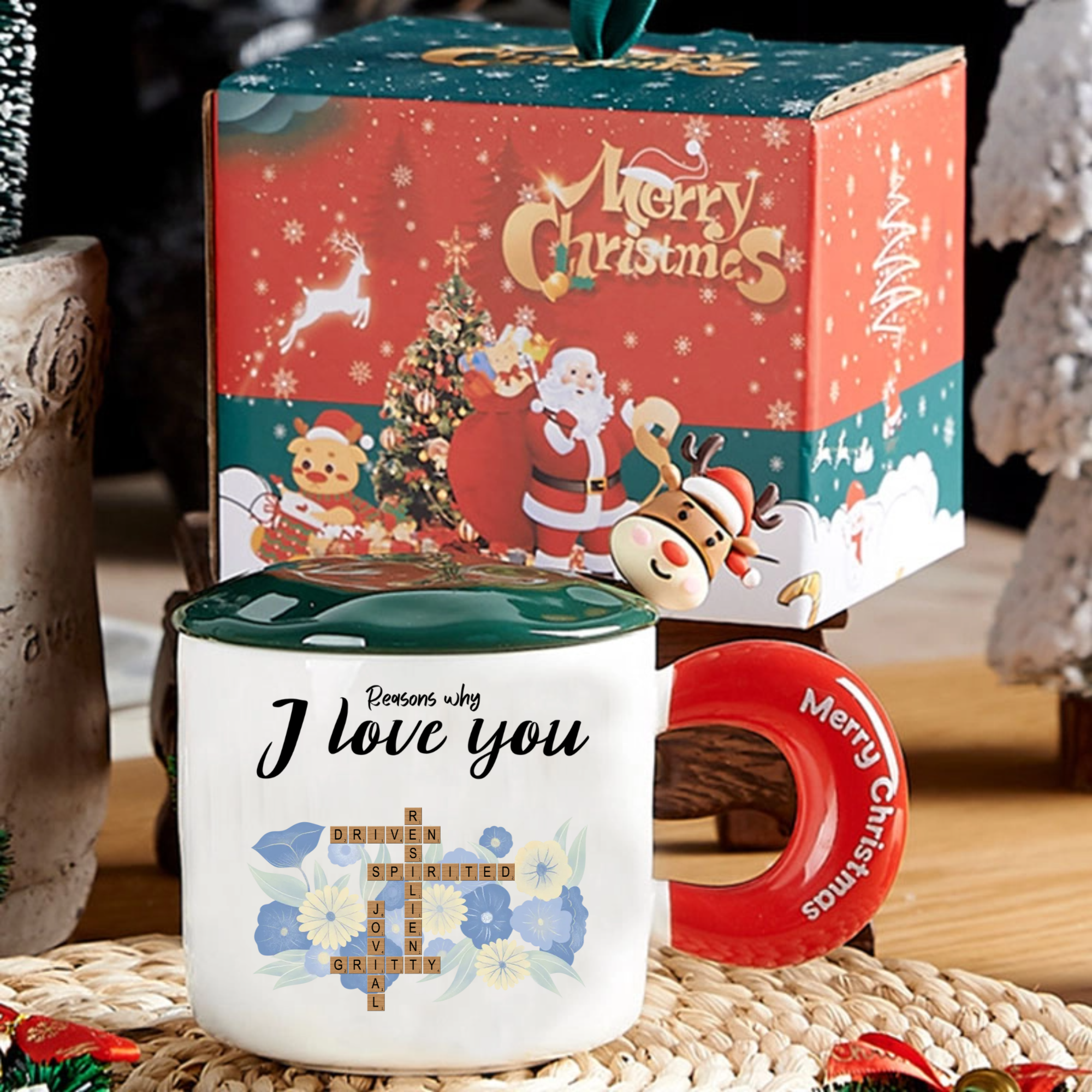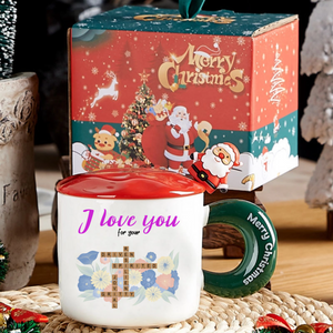 Celebrate the unique reasons you adore your special someone with this enchanting "Reasons Why I Love You" Crossword Mug Gift Set. This beautifully designed white ceramic mug features an elegant crossword puzzle where you can customize the words that describe your loved one's best qualities - like "DRIVEN," "SPIRITED," or "LOYAL." Adorned with delicate floral patterns and a festive "Merry Christmas" handle, this complete set comes with a red lid, golden spoon, and premium gift box, making it the ultimate romantic gift for any occasion.