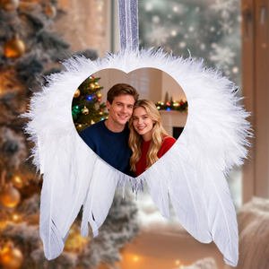 Celebrate the angels in your life with our enchanting Angel Feather Heart Shape Ornament. This exquisite keepsake features a delicate heart adorned with soft, fluffy white feathers, creating a pair of gentle angel wings that frame your most cherished photo. Whether it's a family portrait, a cherished pet, or a romantic couple, transform your precious memory into a heavenly tribute. Perfect for hanging on your Christmas tree or as a year-round decorative reminder of love.