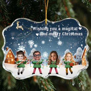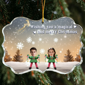 Transform into a Christmas elf with our personalized avatar ornament! This charming cloud-shaped decoration features you and your loved ones as cheerful elves in a snowy village scene. With a glowing reindeer, festive trees, and the message "Wishing you a magical and merry Christmas," this ornament brings personalized magic to your holiday decor. Simply upload your photos to become part of this enchanting Christmas story!