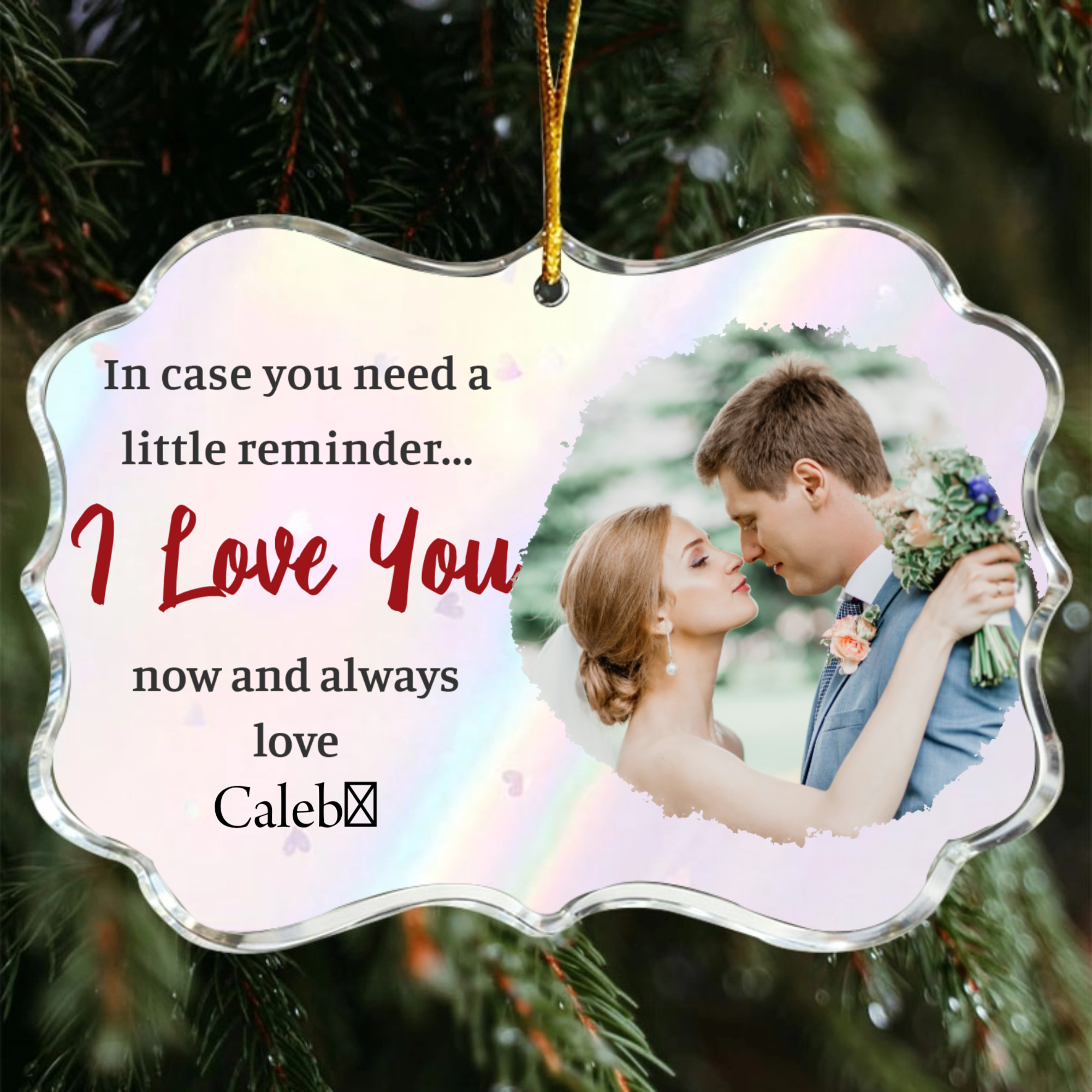 Keep your most cherished moments close with our "I Love You" Personalized Photo Pendant. This unique acrylic keepsake features a heartfelt message, a photo of you and your loved one, and both of your names, all set against a romantic background. Whether it's a quiet embrace, a playful moment, or a deep look shared between you, preserve that magic in a 10.16 x 7.62 cm pendant that's as unique as your love story. Perfect for hanging in your car, on a tree, or in a special spot at home.